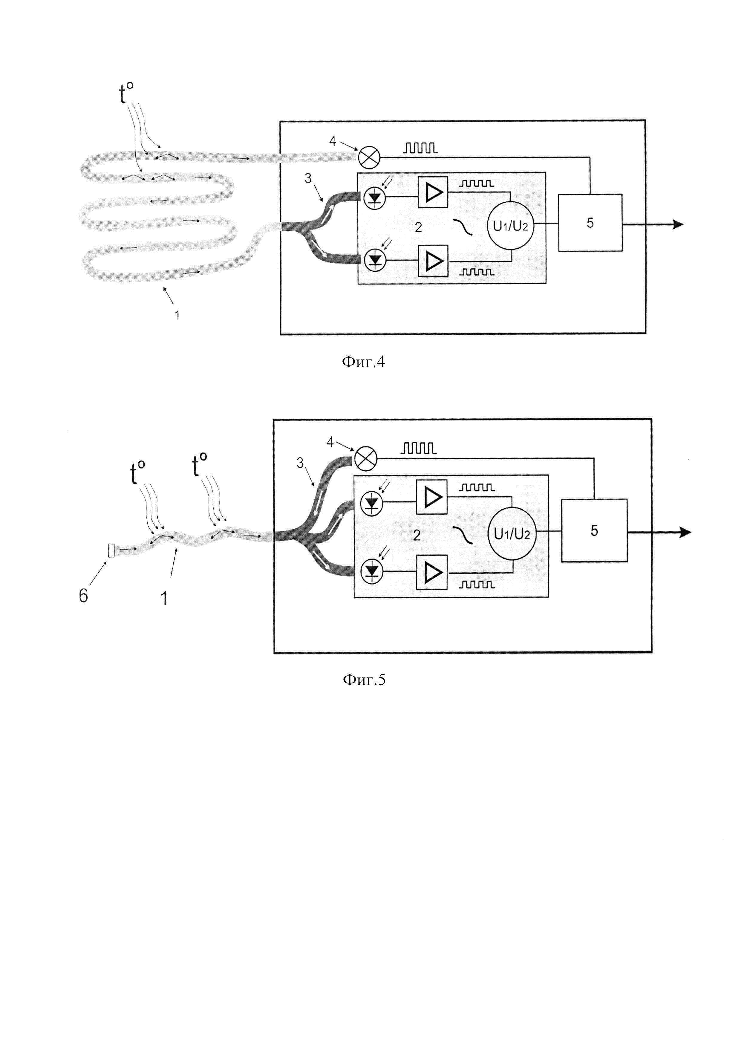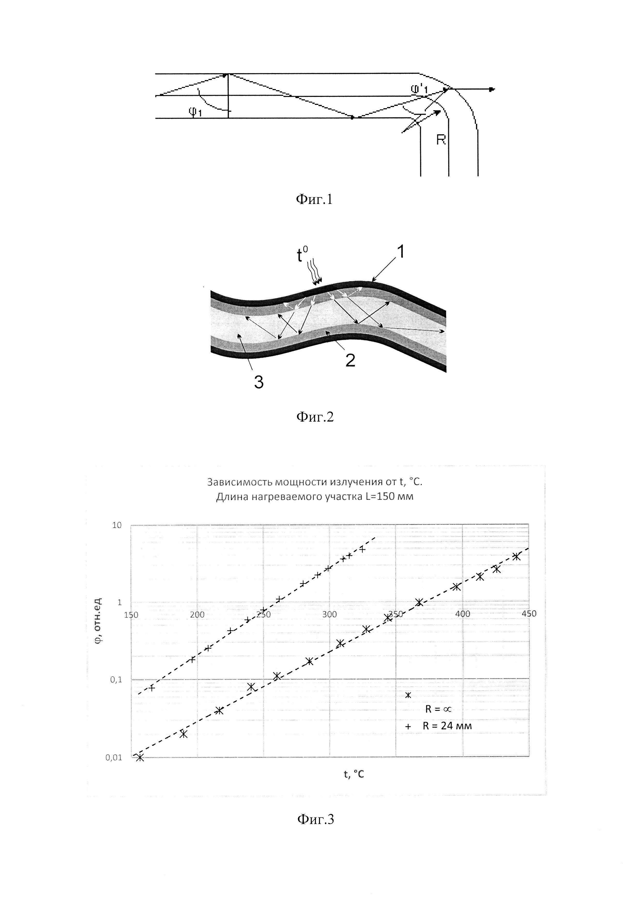 1. Волоконно-оптический сигнализатор для систем оповещения о возгорании, характеризующийся тем, что содержит блок регистрации, включающий в себя двухспектральный фотодетектор, источник света для контроля состояния оптоволокна, соединительное оптоволокно и чувствительный элемент, выполненный в виде длинного отрезка металлизированного кварцевого оптоволокна (диаметром 100-1000 мкм), причем толщина оптической оболочки составляет 0,05-0,1 от диаметра оптической сердцевины оптоволокна, в котором металлическое покрытие играет роль источника ИК-излучения («черного тела»). 2. Волоконно-оптический сигнализатор по п. 1, отличающийся тем, что на противоположном фотодетектору конце нанесено отражающее покрытие, закрытое дополнительным защитным колпачком (фиг. 5, поз. 6). 3. Волоконно-оптический сигнализатор по п. 1, отличающийся тем, что имеет поверх металла тонкую пленку защитного покрытия, повышающую устойчивость чувствительного элемента к данной агрессивной среде. 4. Волоконно-оптический сигнализатор для систем оповещения о возгорании по пп. 1, 3, отличающийся тем, что блок регистрации включает в себя дополнительный канал спектрального детектора, настроенного на регистрацию в длинноволновой области интенсивного поглощения ИК-излучения металлизированного оптоволокна, применяемого в качестве чувствительного элемента, с целью приблизительного определения расстояния места нагрева от фотодетектора.