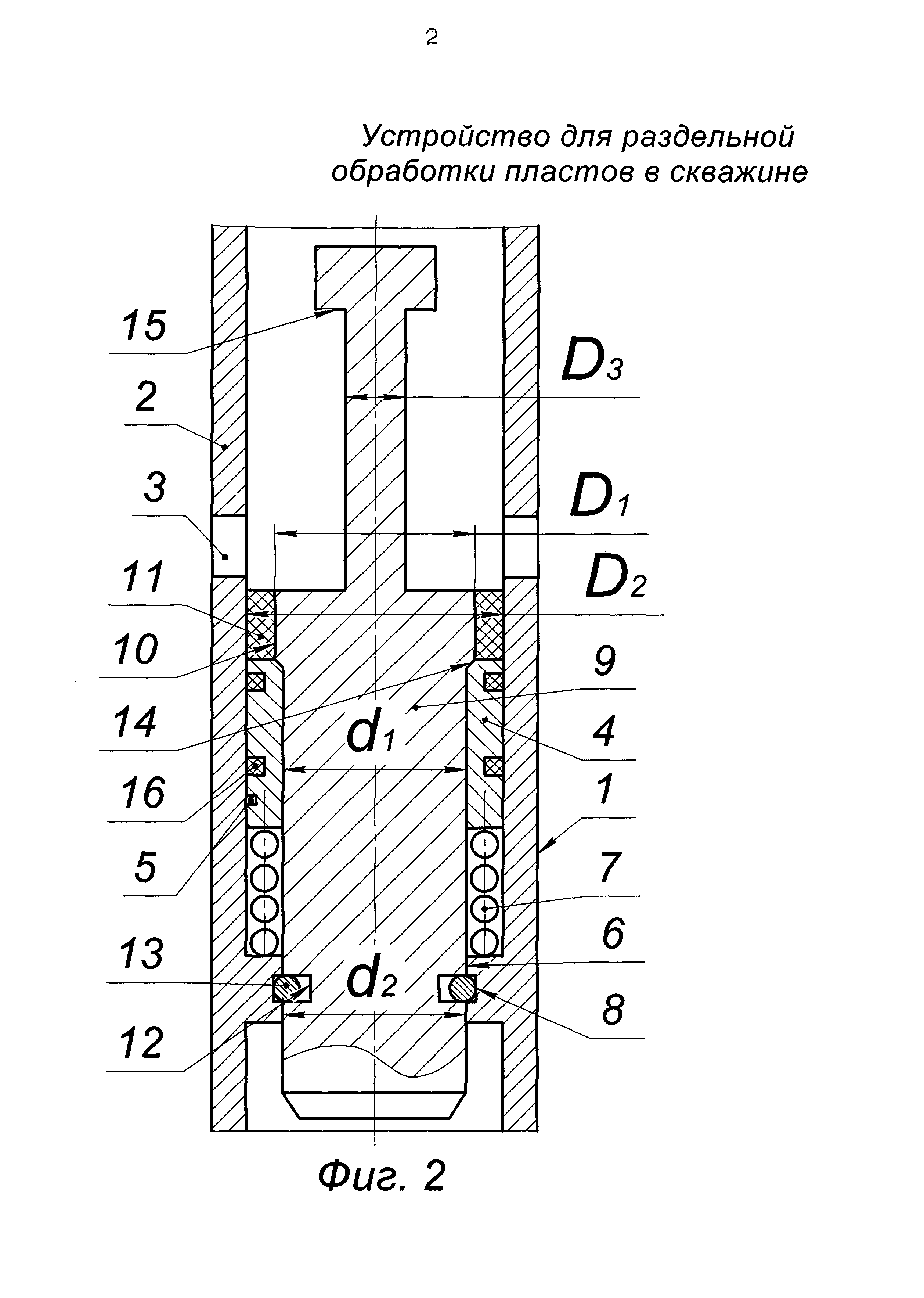 Предложение относится к нефтяной промышленности и может найти применение при раздельной обработке пластов в скважине, в том числе при проведении поинтервального гидравлического разрыва пласта. Известно устройство для обработки пластов в скважине (патент RU №2499126, МПК Е21В 33/12, опубл. 20.11.2013 г., бюл. №32), содержащее пакер, включающий проходной в осевом направлении корпус с фигурным пазом на наружной поверхности, обойму со штифтом и шлипсами, причем штифт установлен в фигурный паз и имеет возможность перемещения по траектории фигурного паза, и эластичную манжету, разобщитель, включающий ствол с верхней и нижней резьбами, и золотник, расположенный внутри ствола и соединенный с ним срезными элементами, золотник снабжен конусной расточкой, в которой установлено стопорное кольцо, взаимодействующее с кольцевой проточкой, расположенной в нижней части ствола, и посадочным седлом для шара, сбрасываемого вовнутрь устройства перед обработкой второго пласта, и нижнее кольцо, навернутое на нижнюю резьбу ствола, при этом фигурный паз на наружной поверхности проходного корпуса пакера выполнен в виде поперечной и продольной проточек, расположенных перпендикулярно друг к другу и соединенных между собой в нижней части продольной проточки, причем снизу золотник снабжен осевым центральным отверстием, а нижнее кольцо выполнено в виде крышки, навернутой на нижнюю резьбу ствола разобщителя, причем снизу крышка снабжена наружной резьбой для соединения с корпусом проходного пакера, а по центру крышка снабжена жесткозакрепленным на ней стержнем, направленным в сторону золотника, а также осевыми отверстиями по окружности, причем пропускная способность этих отверстий больше пропускной способности центрального отверстия золотника, а стержень имеет возможность герметичного взаимодействия с осевым центральным отверстием золотника после посадки шара на седло золотника и осевого перемещения золотника относительно ствола разобщителя, а кольцевая проточка ствола, взаимодействующая со стопорным кольцом, выполнена в виде кольцевых насечек, направленных противоположно стопорному кольцу. Недостатки данного устройства: - во-первых, сложность конструкции, обусловленная большим количеством узлов и деталей; - во-вторых, невозможность спуска геофизических приборов для проведения геофизических исследований нижнего пласта из-за наличия в конструкции размещенного в стволе золотника, резко сужающего проходное сечение, например, для определения наличия или отсутствия заколонных перетоков до и после обработки нижнего пласта; - в-третьих, низкая надежность в работе, обусловленная тем, что запорный элемент не фиксируется жестко в стволе разобщителя, поэтому при обработке верхнего пласта возможно отложение шлама, грязи на посадочном месте седла шара, и, как следствие, негерметичная посадка шара и пропуски жидкости в нижний пласт; - в-четвертых, невозможность качественного освоения свабированием верхнего пласта после его обработки, так как при свабировании верхнего пласта происходит потеря герметичности между золотником и стволом разобщителя и, как следствие, переток жидкости из нижнего пласта через радиальные каналы золотника в устройство. Наиболее близким по технической сущности является устройство для обработки пластов в скважине (патент RU 