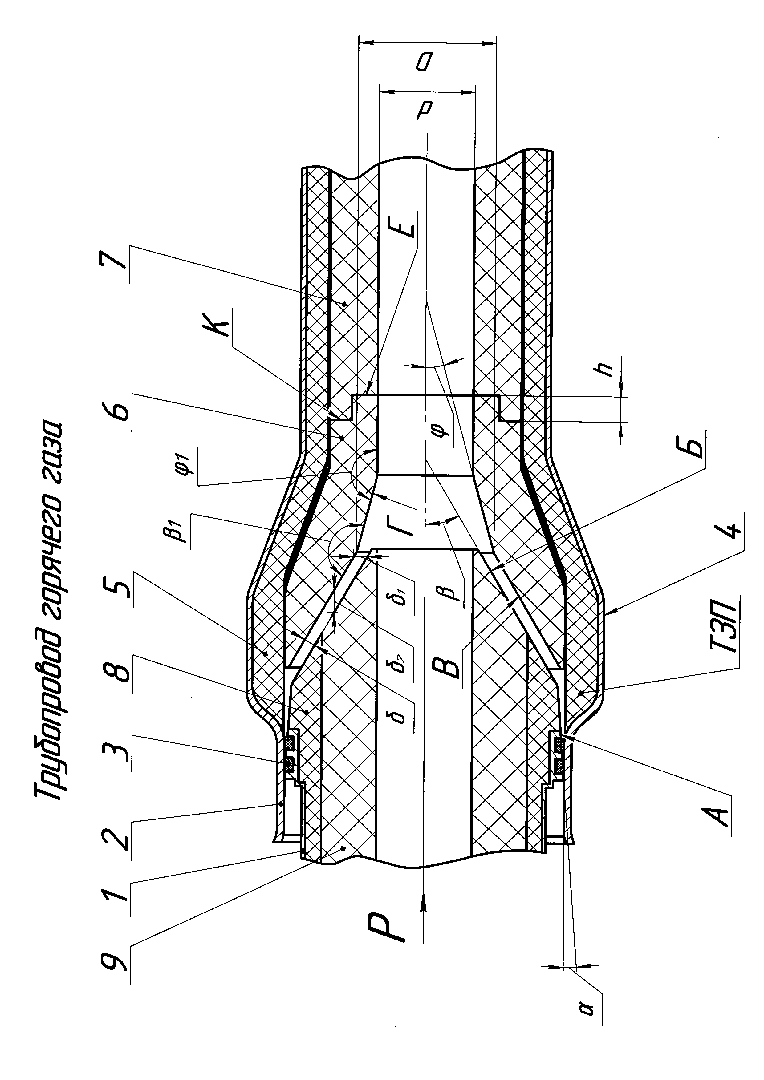 Предлагаемое изобретение относится к области машиностроения, а именно к конструкциям гибких трубопроводов горячего газа, работающих в условиях высоких температур и переменных давлений, и направлено на их совершенствование. Известна конструкция гибкого соединения трубопроводов, в которой цилиндрические металлические оболочки, телескопически заходящие друг в друга, сопряжены между собой по цилиндрическим поверхностям с уплотнительными кольцами (Патент РФ №2460003, М.кл. F16L 59/00). Недостатком данной конструкции является то, что поверхность, на которой установлены уплотнительные кольца, выполнена цилиндрической, что не позволяет металлическим оболочкам разворачиваться относительно друг друга, для компенсации технологических и рабочих перекосов. Известна конструкция телескопического соединения газоводов горячего газа, в которой в осевой зазор установлен с натягом закладной элемент (Патент РФ №2460004, М.кл. F16L 59/00). Недостаток этой конструкции состоит в том, что в данной конструкции использованы простейшие цилиндрические детали из ТЗП и ЭСМ, конструкция которых не достаточна для использования в телескопических соединениях трубопроводов, то есть не разработана конструкция деталей из теплозащитного покрытия (ТЗП) и эрозионностойкого материала (ЭСМ), оформляющих вынужденные зазоры и стыки телескопического соединения. Задачей изобретения является увеличение надежности работы телескопического соединения трубопровода горячего газа, работающего в условиях высоких температур и повышенного давления газа. Указанная задача решается тем, что в трубопроводе горячего газа, состоящем из цилиндрических металлических оболочек, телескопически заходящих друг в друга, соединенных между собой через уплотнительные кольца, и защищенных изнутри последовательно теплозащитным покрытием и деталями из эрозионностойкого материала, при этом в зоне телескопического соединения цилиндрические металлические оболочки соединены с возможностью углового перемещения, причем внешняя металлическая цилиндрическая оболочка выполнена с местным цилиндрическим расширением по наружному диаметру, заполненным теплозащитным покрытием, в которое заходит ответная часть соединения, выполненная также из теплозащитного покрытия, а детали из теплозащитного покрытия и эрозионностойкого материала образуют конический зазор, вершина которого направлена в сторону потока горячего газа, поверхность внутренней металлической оболочки, на которой установлены уплотнительные кольца, выполнена конической, с вершиной, направленной в сторону потока горячего, а поверхность конического зазора, которая находится напротив потока горячего газа, образована двумя соосными коническими поверхностями, одна коническая поверхность, расположенная дальше от центральной оси газохода, параллельна конической поверхности ответной части, а вторая коническая поверхность выполнена с углом конусности, меньшим как минимум в два раза, чем угол конусности первой конической поверхности, при этом диаметр окружности пересечения конических поверхностей больше суммы внутреннего диаметра проходного сечения и удвоенной величины максимального конического зазора между параллельными плоскостями в радиальном направлении. Торцовые стыки цилиндрических деталей из ЭСМ выполнены в в