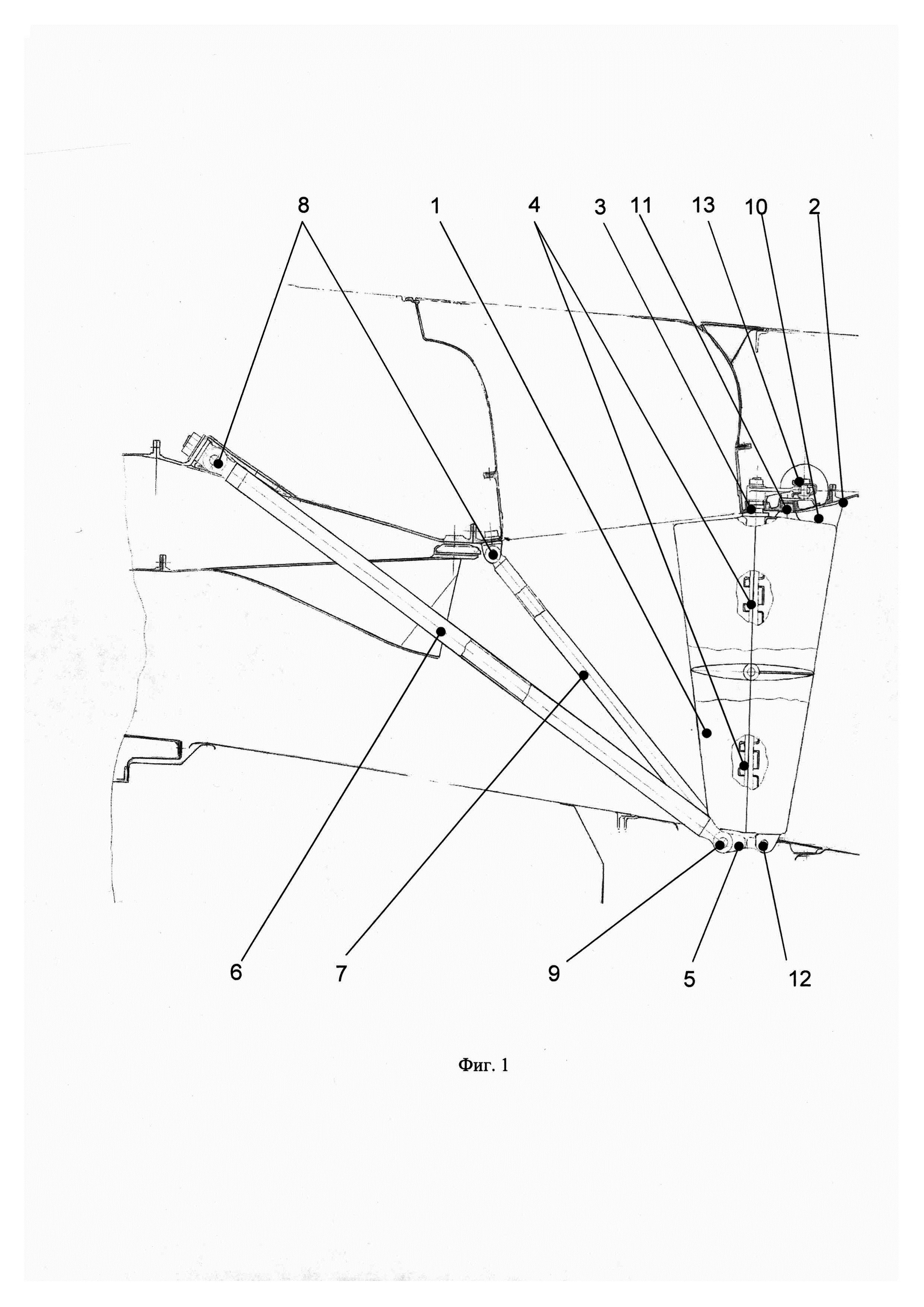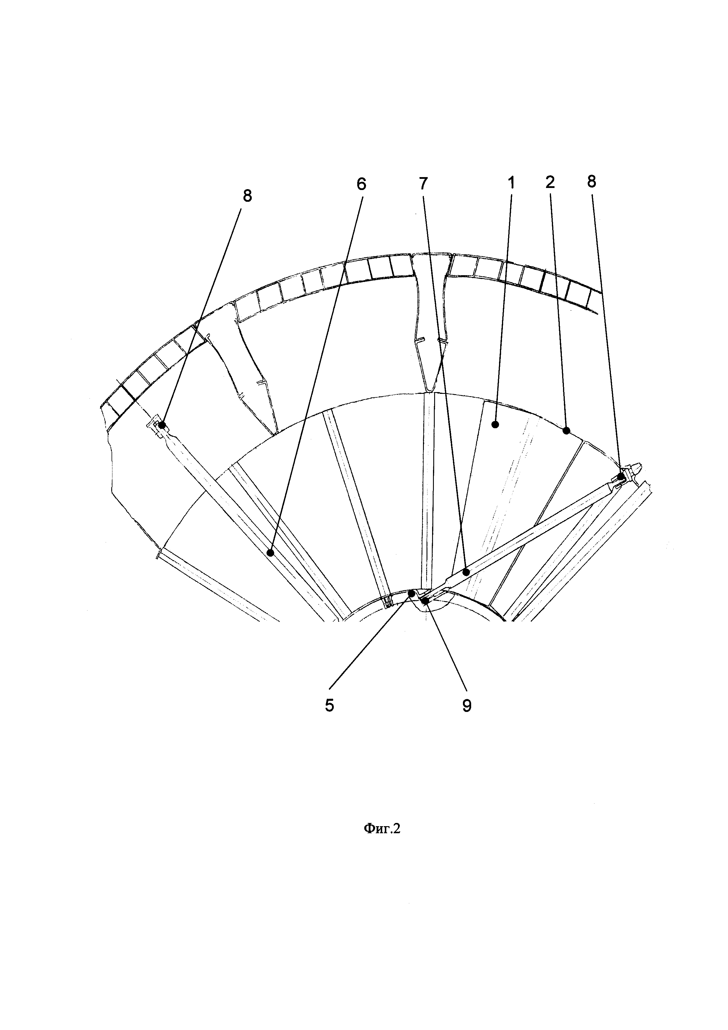 Предлагаемое изобретение относится к авиационной технике, а именно к реверсивным устройствам турбореактивного двигателя (далее ТРД). Известно устройство для реверсирования тяги турбореактивного двигателя, содержащее закрылки, установленные по окружности в корпусе, радиальные оси, установленные вдоль центральных участков закрылков и соединенные с последними (GB 1197028 А). Данное устройство выбрано в качестве прототипа. Недостатками выбранного устройства являются: - конструкция данного устройства не приспособлена для восприятия больших нагрузок ввиду отсутствия силовых элементов. Это приводит к невозможности использования известного устройства в газовом потоке с высоким давлением, что, в свою очередь, сильно ограничивает его область применения. Кроме того, конструктивное исполнение прототипа не позволяет его использование на участке в ТРД, где отсутствует центральное тело, например затурбинный кок или первый контур (для двухконтурного ТРД), что также ограничивает область применения известной конструкции. Все вышеперечисленные недостатки устраняются предлагаемым изобретением. Техническим результатом, достигаемом при использовании заявленного изобретения, является расширение области его применения и повышение его универсальности. Указанные технические эффекты достигаются тем, что устройство для перекрытия газового потока в корпусе ТРД, содержащее закрылки, установленные по окружности в корпусе, радиальные оси, установленные вдоль центральных участков закрылков и соединенные с последними, согласно настоящему изобретению содержит силовое кольцо, установленное в корпусе соосно продольной оси двигателя и соединенное с корпусом посредством тяг, силовые стойки, установленные по направлению газового потока за радиальными осями и жестко соединенные с последними, причем противолежащие концы силовых стоек соединены с корпусом и силовым кольцом соответственно, при этом каждый из закрылков с установленной за ним по направлению газового потока силовой стойкой образуют единый аэродинамический профиль, кроме того, закрылки выполнены с возможностью поворота в окружном направлении относительно радиальных осей. Возможность использования устройства для перекрытия газового потока с высоким давлением достигается за счет наличия за каждым закрылком силовой стойки, воспринимающей нагрузку. Поток давит на каждый из закрылков по обе стороны силовой стойки, нагрузка передается на силовые стойки, затем на силовое кольцо, затем посредством тяг - на силовой корпус. Таким образом, вся нагрузка равномерно распределяется на силовом корпусе, при этом на каждый из закрылков приходится небольшая часть нагрузки, благодаря чему нет необходимости в массивных силовых элементах для восприятия больших нагрузок, что, в свою очередь, позволяет использовать данное устройство для перекрытия газового потока с высоким давлением, незначительно изменяя при этом массу конструкции. Кроме того, конструктивное исполнение устройства в виде силового кольца с закрылками позволяет устанавливать его как в местах с центральным телом (первый контур, затурбинный кок и т.д.), так и в местах без центрального тела. В частном случае реализации заявленного устройства в местах соединений тяг с корпусом и силовым кольцом установлены шарниры. Это необхо