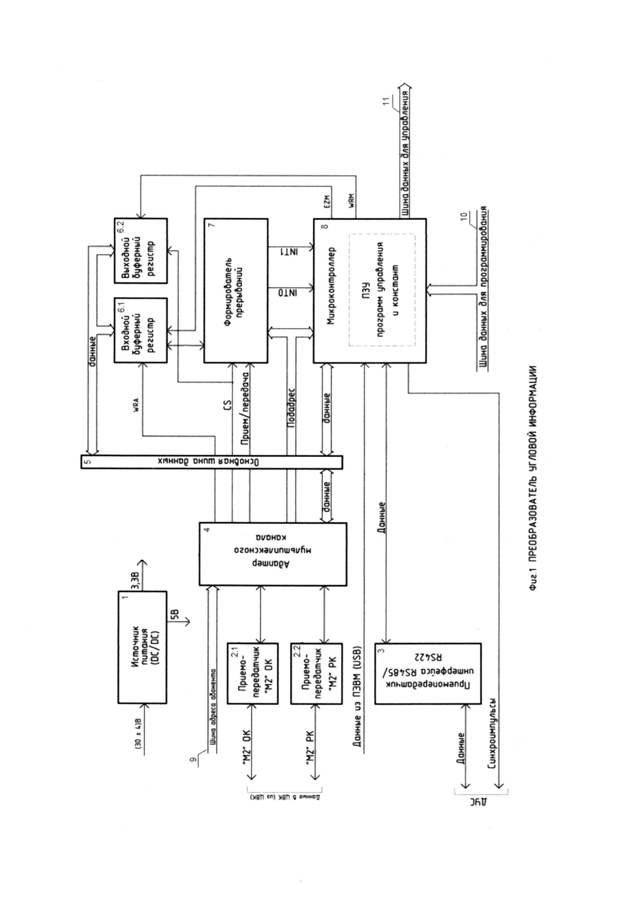 Изобретение относится к области цифровой вычислительной техники, а именно к устройствам сопряжения интерфейсов обмена информацией, ее контроля и обработки. Из уровня техники известен аналог предлагаемого технического решения «Устройство сопряжения с основным цифровым каналом» (свидетельство на полезную модель RU 50693 U1), который принят за прототип. Устройство сопряжения с основным цифровым каналом содержит узел-переходник к порту RS-232, микроконтроллер AT89S53, программируемую логическую интегральную схему (ПЛИС), реализующую шину данных, шину адреса, регистр индикации, регистр скорости, регистр передачи основного цифрового канала (ОЦК), регистр принятых данных ОЦК, регистр передаваемых данных биимпульсного канала (БИ), регистр принимаемых данных биимпульсного канала, кодер ОЦК, декодер ОЦК, схему вставки старт-стопных импульсов, схему вырезки старт-стопных импульсов, схему настройки скорости канала передачи, схему настройки скорости канала приема, а также светодиодный индикатор состояния устройства, биимпульсный узел аналоговых приемопередатчиков, цепи связи с портом ОЦК, цепи связи с биимпульсным каналом. Устройство сопряжения с основным цифровым каналом предназначено для прямого и обратного преобразования сигналов ОЦК в интерфейс С1-И, ОЦК в интерфейс RS-232, а также взаимного преобразования интерфейсов RS-232 и С1-И. Устройство обеспечивает следующие скорости обмена: - по интерфейсу RS-232 - 57,6, 38,4, 19,2 и 9,6 кбит/с; - по интерфейсу С1-И - 64, 48, 32, 16, 9,6, 4,8, 2,4 кбит/с; - по ОЦК (G703) - 64 кбит/с в противонаправленном и сонаправленном режимах. Режим работы определяется положением задающих микропереключателей либо настройками прикладного программного обеспечения. Недостатками данного прототипа являются его малые функциональные возможности, не позволяющие осуществить преобразование и обмен информацией по каналам с наиболее перспективными и более скоростными интерфейсами передачи данных, а также отсутствие возможности промежуточной обработки, контроля данных и формирования сообщений в цифровой канал о недостоверности информации (в виде конкретного кода при нарушениях в обмене). Кроме того, прототип выполнен на импортной элементной базе. Задачей предлагаемого технического решения является расширение функциональных возможностей - не только прямое и обратное преобразование интерфейса М2 ЦБК (как наиболее перспективного интерфейса, как по аппаратным затратам, так и по надежности) в интерфейсы абонентов RS-485/RS-422, USB (возможны и SPI, 12С), но и промежуточную обработку данных, контроль правильности обмена и достоверности данных, формирование сообщений в цифровой канал о недостоверности информации (в виде конкретного кода при нарушениях в обмене). Кроме того, преобразователь угловой информации должен быть выполнен, в отличие от прототипа, на современной отечественной элементной базе с применением БИС. Заявленный технический результат достигается тем, что в преобразователь угловой информации, содержащий: микроконтроллер (МК), приемопередатчик интерфейса RS-485/RS-422, основную шину данных, шину адреса абонента, входной и выходной буферные регистры, согласно изобретению введены два приемопередатчика интерфейса М2 с трансформаторной гальванической развязкой (ПМ2), адаптер мультиплексного канала (АМК) и формирователь прерываний (ФП), при этом входы-