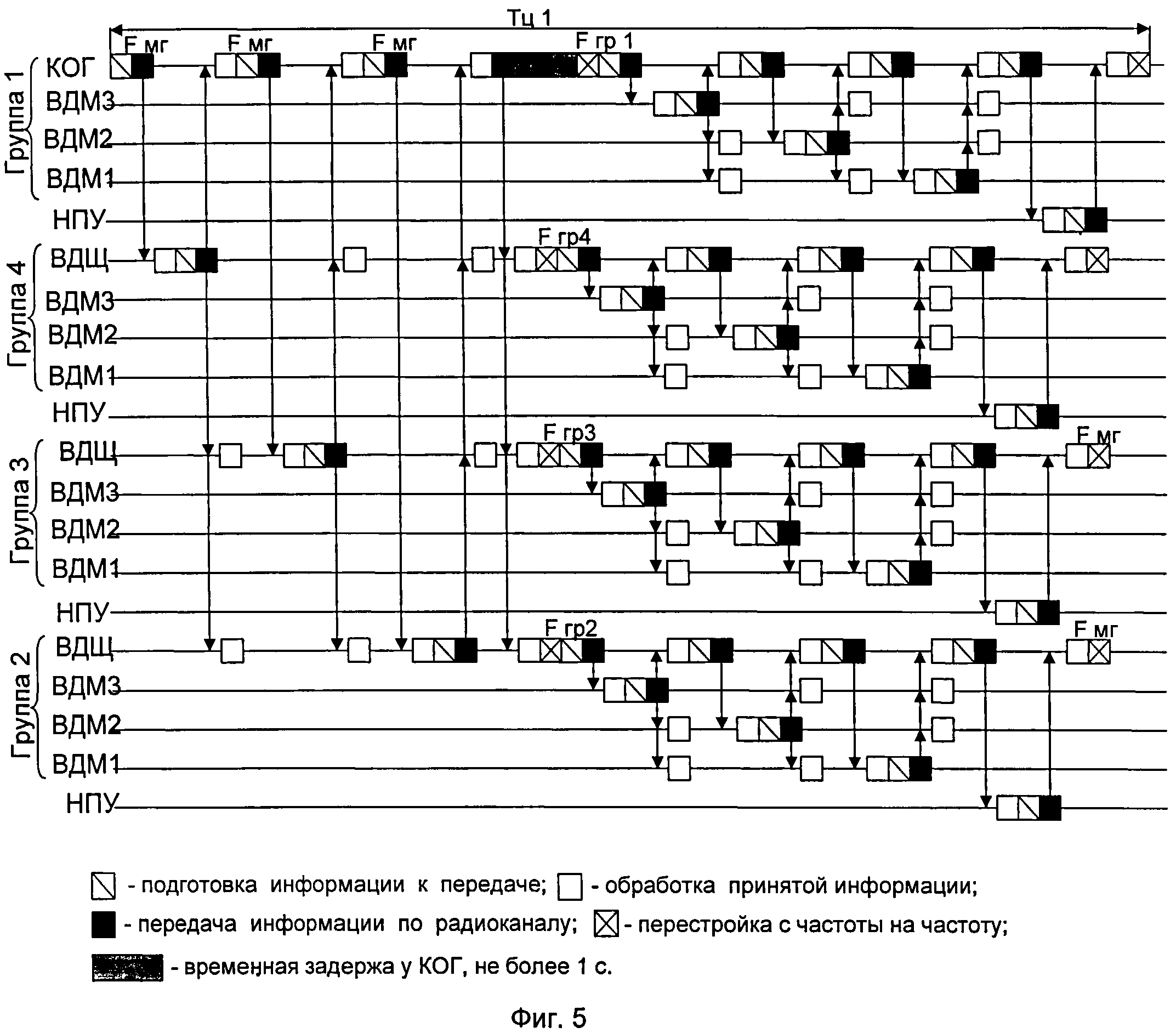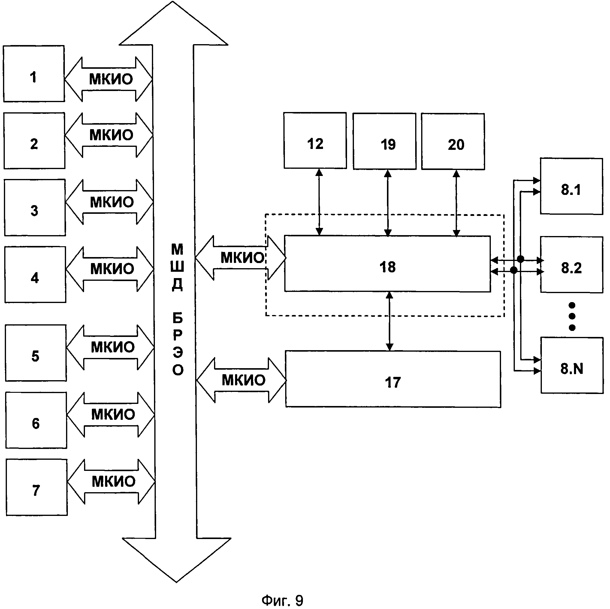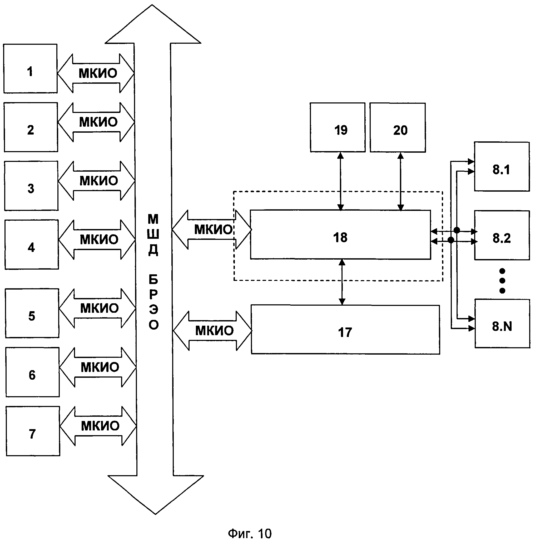Изобретение относится к авиационному оборудованию, более конкретно - к оборудованию, предназначенному для обеспечения боевого применения вооружения летательных аппаратов (ЛА) (боевых самолетов, боевых вертолетов). Оно может быть использовано предприятиями авиационной и оборонной промышленности, ведущими разработку систем управления вооружением (СУВ) и систем передачи/приема данных. Известна система управления вооружением истребителя, предназначенная для обеспечения эффективного поражения воздушных и наземных целей за счет точного выхода в район атаки группы истребителей, взаимного обмена информацией, централизованного сбора данных воздушной и наземной обстановки, обработки данных и последующего решения задач целераспределения (целеуказания) на самолете командира общего боевого порядка. Эта система в предлагаемом техническом решении принята в качестве аналога [Патент №2024818 F41G 3/22 Опубл. 15.12.1994 г.]. В состав современной системы управления вооружением летательного аппарата, например, СУВ ЛА истребителя (фиг.1), независимо от уровней функциональной и конструктивной интеграции оборудования и способов ее соединения: непосредственное подключение друг к другу по локальным линиям мультиплексной связи или через общую самолетную магистральную шину данных (МШД), управляемой вычислительной системой самолета, входят: многофункциональная бортовая радиолокационная станция (БРЛС) 1, предназначенная для обнаружения воздушных и наземных целей на удалениях в пределах радиовидимости станции; бортовая оптико-электронная (в частном случае телевизионная) визирная система 2, предназначенная для обнаружения воздушной цели в пределах оптической видимости (после предварительного выхода в район ее нахождения с помощью указанной выше аппаратуры) и для обеспечения ее автоматического и полуавтоматического сопровождения в расчете на измерение ее координат и параметров движения с помощью измерителей, входящих в состав визирной системы; бортовой комплект аппаратуры наведения 3, телеметрически связанной с аналогичной по назначению аппаратурой, размещенной на командных пунктах наземных и воздушных (летательных аппаратах типа «АВАКС») автоматизированных систем управления (наведения); бортовой комплект навигационного оборудования 4 с датчиками полетной информации, рассчитанный на его использование при прицеливании, а также для осуществления навигации (например, после завершения атаки цели, с заданием возвратиться на аэродром и совершить посадку); вычислительная (информационно-аналитическая) система 5 реального времени, содержащая несколько цифровых вычислительных машин (ЦВМ) и аналоговых вычислителей, предназначенных для обработки информации, получаемой от указанных датчиков и измерителей, для решения задачи прицеливания, для решения навигационной задачи и других вычислительных действий, связанных с подготовкой, применением средств поражения и контролем результатов этого применения, в том числе в учебных полетах; бортовой комплект индикаторов 6, предназначенных для демонстрирования летчику необходимых сведений по результатам работы названной визирной системы, аппаратуры наведения и навигации, а также для представления результатов работы вычислительной системы, реализуемых путем соответствующего пилотирования, в ча