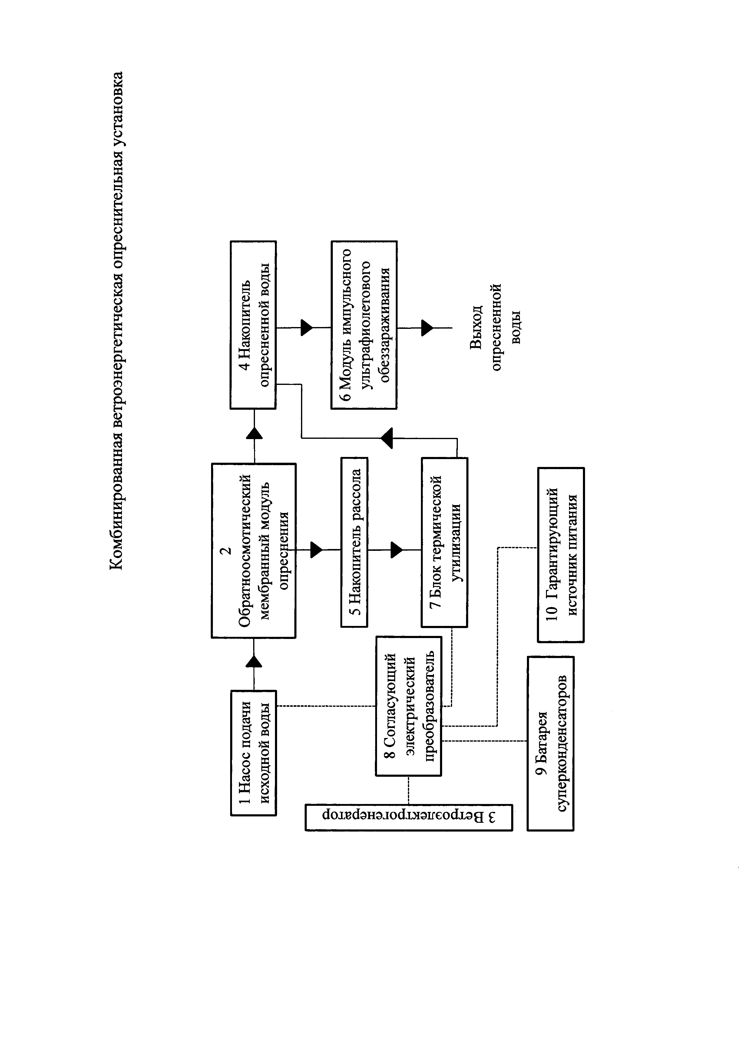 Изобретение относится к технологии опреснения морской воды. Предпочтительная область использования - морские суда и корабли, в частности подводные обитаемые плавсредства и подводные лодки. Известно устройство для опреснения воды обратного осмоса (CN 202358969, кл. C02F 1/44, опубл. 01.08.2012), которое содержит систему генерирования энергии ветра и систему обессоливания обратного осмоса, содержащую обратноосмотический мембранный модуль, насос, подающий соленую или загрязненную воду к обратноосмотическому мембранному модулю. Система генерирования ветровой энергии включает в себя систему генератора ветряных турбин, выпрямитель, инвертор и усилительный трансформатор. Устройство использует энергию ветра для самостоятельной генерации энергии, без загрязнения, имеет преимущества низкого энергопотребления, низкой стоимости, низкий уровень шума, работает безопасно, стабильно, эффективно и надежно. Однако устройство имеет повышенный объем стоков и низкую степень использования ветрового потока. Технической проблемой, на решение которой направлено изобретение, является устранение отмеченных недостатков. Технический результат заключается в создании установки, в которой значительно снижен объем стоков, генерируемых опреснительной установкой, и повышена степень полезного использования энергии ветрового потока. Проблема решается, а технический результат обеспечивается тем, что комбинированная ветровая опреснительная установка содержит обратноосмотический мембранный модуль, насос, подающий соленую или загрязненную воду к обратноосмотическому мембранному модулю, ветроэлектрогенератор, преобразующий энергию ветрового потока в электрическую энергию, блок термической утилизации концентрата, выполняющий функцию упаривания образующегося при работе обратноосмотического модуля рассола, накопитель опресненной воды, накопитель рассола, блок импульсного ультрафиолетового обеззараживания, электрический преобразователь, согласующий напряжения на входах насоса и блока термической утилизации концентрата с выходом ветродвигателя, автоматизированную систему управления, осуществляющую контроль мощности ветродвигателя, насоса, контроль давления и расхода жидкости в мембранном модуле, уровня жидкости в накопителях рассола и опресненной воды, ограничение тока, потребляемого насосом, и подключение блока термической утилизации концентрата при превышении мощности ветроэлектрогенератора над расчетной, необходимой для достижения безопасного давления в обратноосмотическом блоке. К электрическому преобразователю может быть подключена батарея суперконденсаторов с водным или органическим электролитом для выравнивания профиля выдачи мощности ветродвигателя, которая может быть снабжена активной системой контроля и управления, обеспечивающей выравнивание напряжений на элементах батареи и перераспределение энергии от элементов с более высоким уровнем заряда к менее заряженным. К электрическому преобразователю может быть также подключена в качестве гарантирующего источника электропитания электрогенерирующая установка на основе теплового двигателя, использующего органическое топливо, в том числе дизель-генератор, газовая турбина, двигатель Стерлинга, либо электрохимический генератор, либо линия электропитания от цен