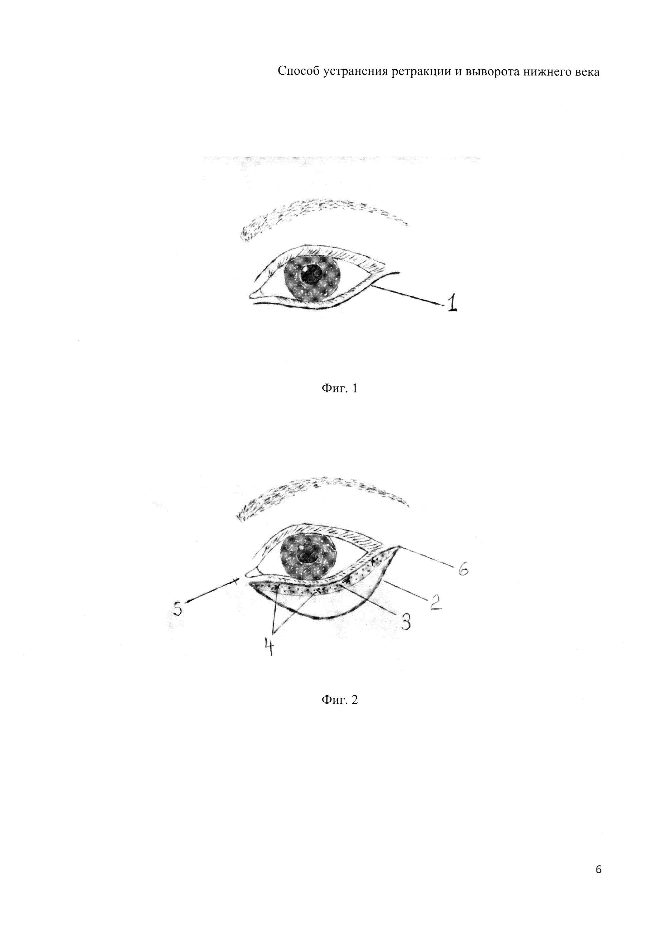 Изобретение относится к области медицины, а именно к челюстно-лицевой, пластической хирургии и нейрохирургии. Для коррекции формы глазной щели при ретракции и вывороте нижних век проводят имплантацию и фиксацию эластичного имплантата, смоделированного по форме тарзальной пластинки. Производят разрез кожи, отступив от ресничного края книзу 2-3 мм. Укладывают в сформированное ложе имплантат и фиксируют его узловыми швами сначала на переднюю поверхность тарзальной пластинки, затем к надкостнице у медиального и латерального края орбиты. При этом используют перфорированный имплантат, выполненный методом фотополимеризации светочувствительной композиции на основе олигомеров и мономеров метакрилового ряда. Способ позволяет эффективно устранить ретракцию и выворот нижнего века, обеспечивая стабильность косметического эффекта и предупреждение рецидивирования со снижением травматичности. 2 з.п. ф-лы, 2 ил.