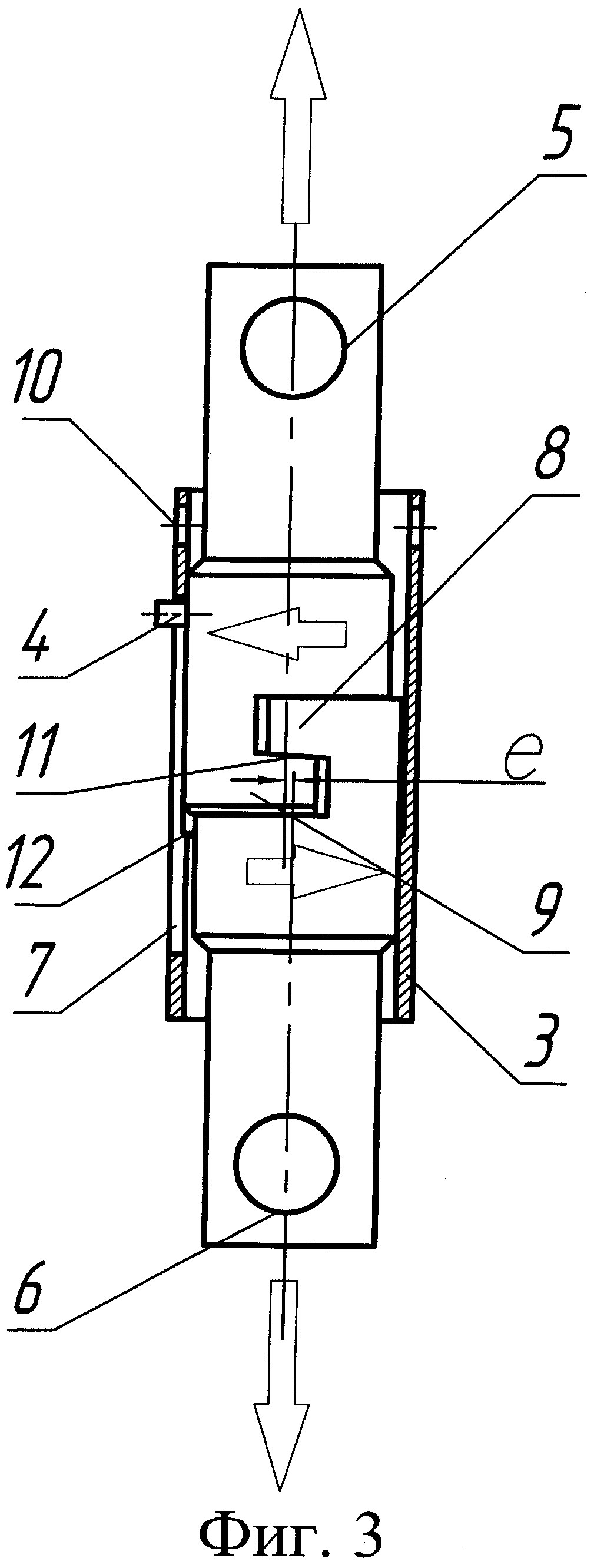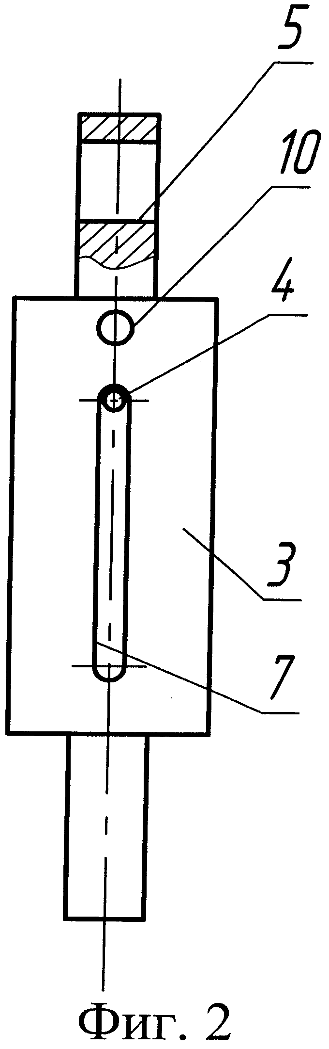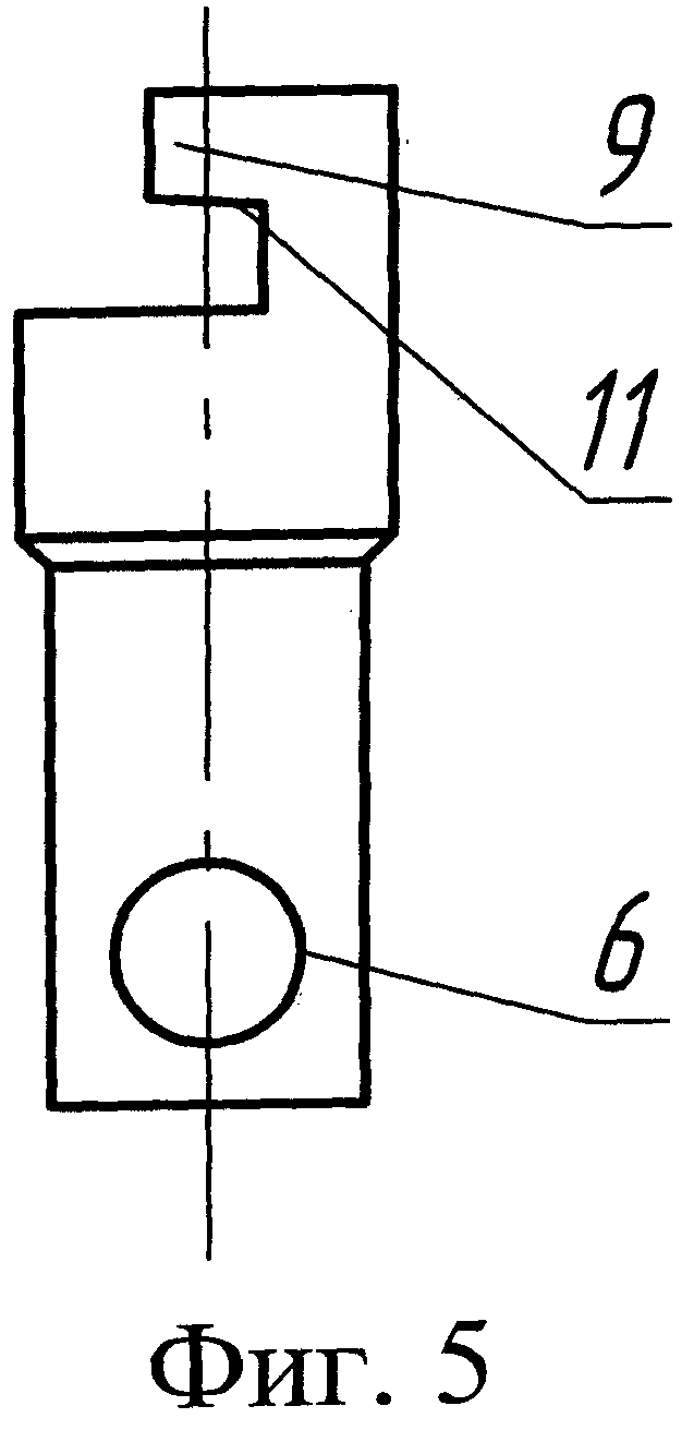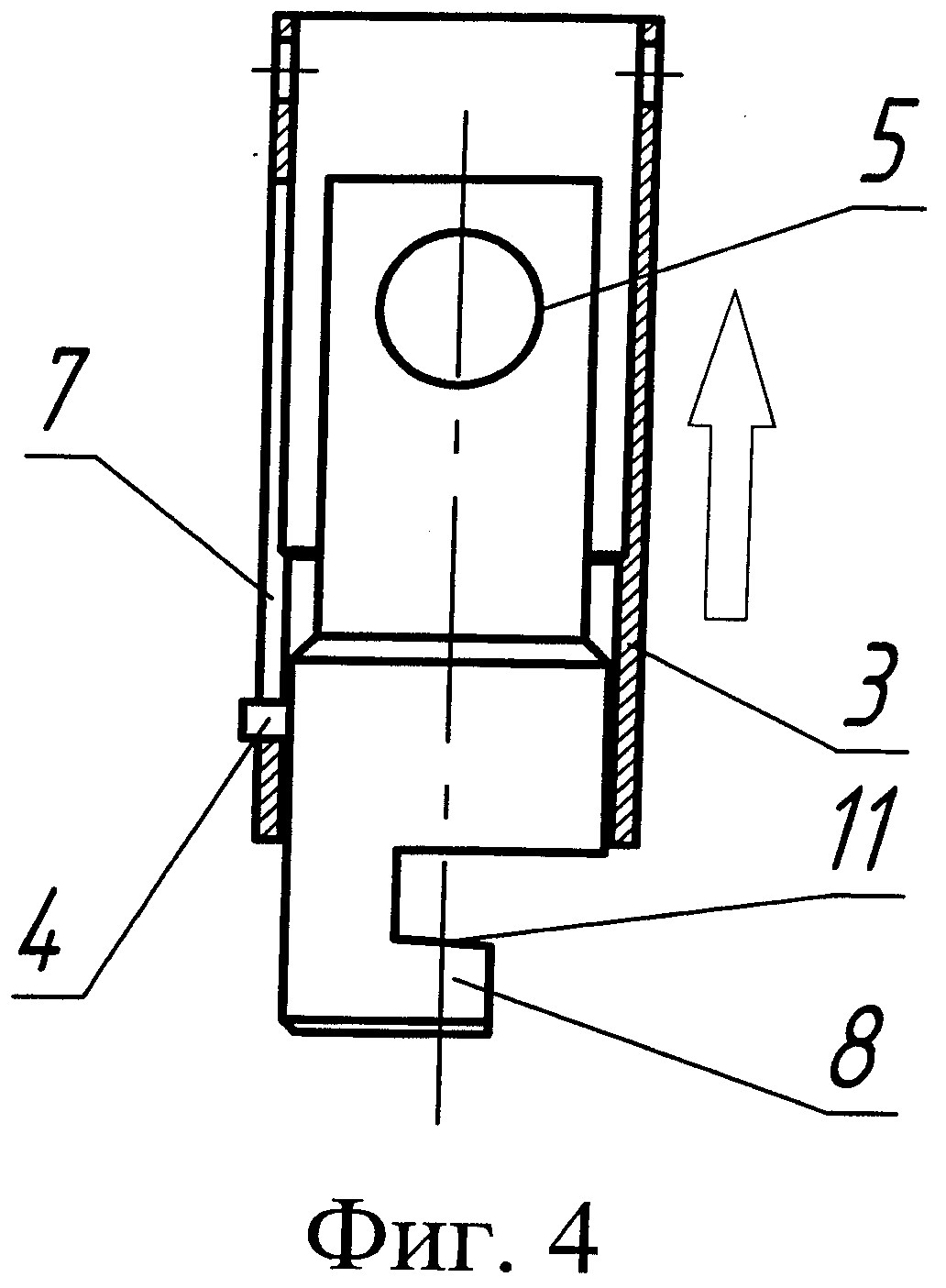 Изобретение относится к разряду соединительных устройств типа карабин с фиксатором, например, используемых для поднятия и перемещения грузов. Возможно применение карабина в спасательной технике и при авиадесантировании людей и грузов. Известен карабин, снабженный защелкой с муфтой. Защелка предназначена для ввода троса во внутреннее тело карабина. Муфта зажимает защелку в месте зацепления защелки с телом карабина. На внутренней поверхности карабина выполнен выступ, трос размещен в карабине с образованием вытянутой коренной петли, ветви которой расположены с противоположных сторон от выступа и с противоположных сторон от плоскости карабина. Патент Российской Федерации №2027458, МПК: А63В 29/02, 1995. Известен карабин, содержащий силовую скобу, шарнирно соединенное с ней замыкающее звено, пружину его возврата в закрытое положение, подпружиненную контровочную муфту, размещенную на замыкающем звене с возможностью вращательно-поступательного перемещения и фиксации на нем посредством пазового пальца, палец закреплен в стенках муфты, а замыкающее звено имеет полость и направляющие пазы под палец, при этом пружина контровочной муфты расположена в полости замыкающего звена между пружиной его возврата и пальцем. Авторское Свидетельство СССР №502534, МПК: А63В 29/00,1983. Известен карабин по дополнительному авторскому свидетельству №502534, содержащий силовую скобу с крюками и спинкой и замыкающее звено с защелкой. Авторское Свидетельство СССР №1094613, МПК: А63В 29/00, 1984. Прототип. Недостаток указанных конструкций карабина с фиксатором заключается в том, что фиксирующий элемент и прижимная пружина находятся на одной оси, которая постоянно испытывает двойное напряжение при эксплуатации и, как следствие, при этом снижается надежность устройства. Кроме того, известные карабины имеют усложненную конструкцию, и при работе с большими грузами карабин сравнительно долго разъединяется. Техническим результатом изобретения является повышение быстродействия нагрузки и разгрузки карабина, упрощение конструкции и возможность дистанционного управления размыканием карабина и отделением от него груза. Технический результат достигается тем, что в карабине, содержащем два звена и запирающую муфту, размещенную на одном из звеньев с возможностью продольного перемещения и фиксации на нем посредством пазового упора, звенья карабина выполнены в виде одинаковых цилиндров, на внешних концах цилиндров выполнены отверстия для крепления фалов, внутренние концы цилиндров содержат симметричные сегментные клиновидные уступы, а вдоль образующей муфты выполнен продольный паз, в верхнем звене через паз муфты жестко установлен пазовый упор. Сущность изобретения поясняется на фиг.1-5. На фиг.1 схематично представлен продольный разрез карабина, где: 1 - верхнее звено, 2 - нижнее звено, 3 - муфта с кольцевым уступом 12, 4 - пазовый упор, 5 и 6 - отверстия для грузовых фалов, 7 - продольный паз, 8 и 9 - сегментные клиновидные уступы, 10 - отверстие для управляющего фала. На фиг.2 схематично представлена профильная проекция карабина, где: 3 - муфта с кольцевым уступом 12, 4 - пазовый упор, 5 - отверстие для грузового фала, 7 - продольный паз, 10 -отверстие для управляющего фала. На фиг.3 схематично представлен продольный разрез карабина при перенесении груза, где: 3 - муфта, 4 - пазовый упор, 5 и 6 - от