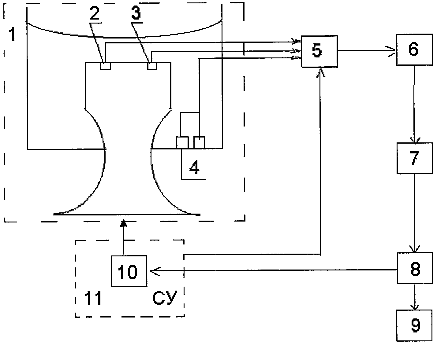 Изобретение относится к способам функционального контроля и диагностирования состояния при испытаниях сложных пневмогидравлических объектов, например жидкостных ракетных двигателей (ЖРД). Способ контроля и диагностирования жидкостного ракетного двигателя заключается в циклическом измерении контролируемых параметров, сравнении их с заданными пороговыми значениями и по результатам сравнения осуществлении контроля и диагностирования двигателя. В качестве измеряемых параметров используют температуру и давление в газовых и жидкостных трактах двигателя, причем дополнительно измеряют давление и температуру среды в двигательном отсеке, сравнивают измеренные параметры с пороговыми значениями и по результатам сравнения фиксируют неисправности в двигателе и его узлах. Изобретение обеспечивает повышение быстродействия системы управления и сокращение времени локализации отказа. 1 з.п.ф-лы, 1 ил.