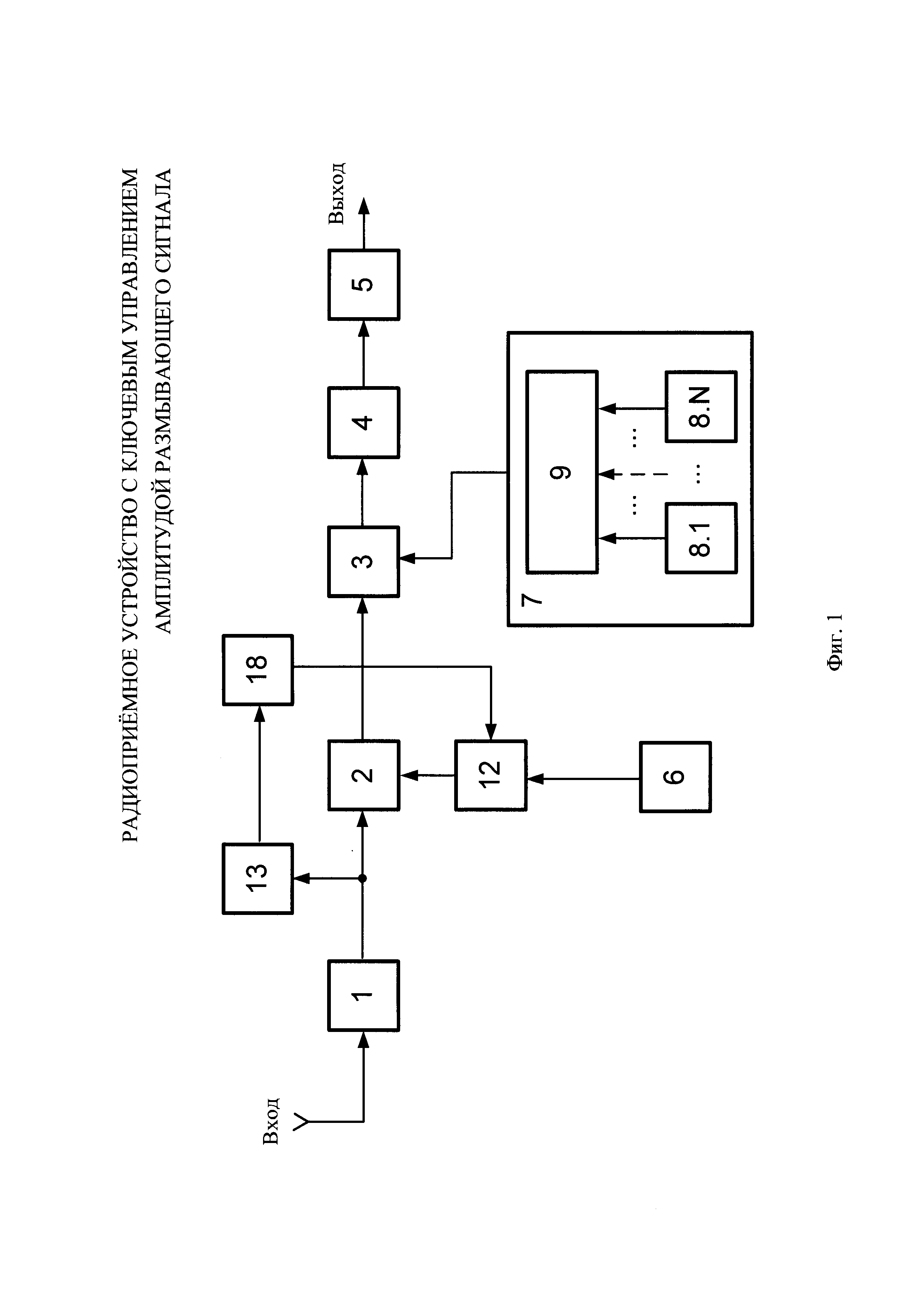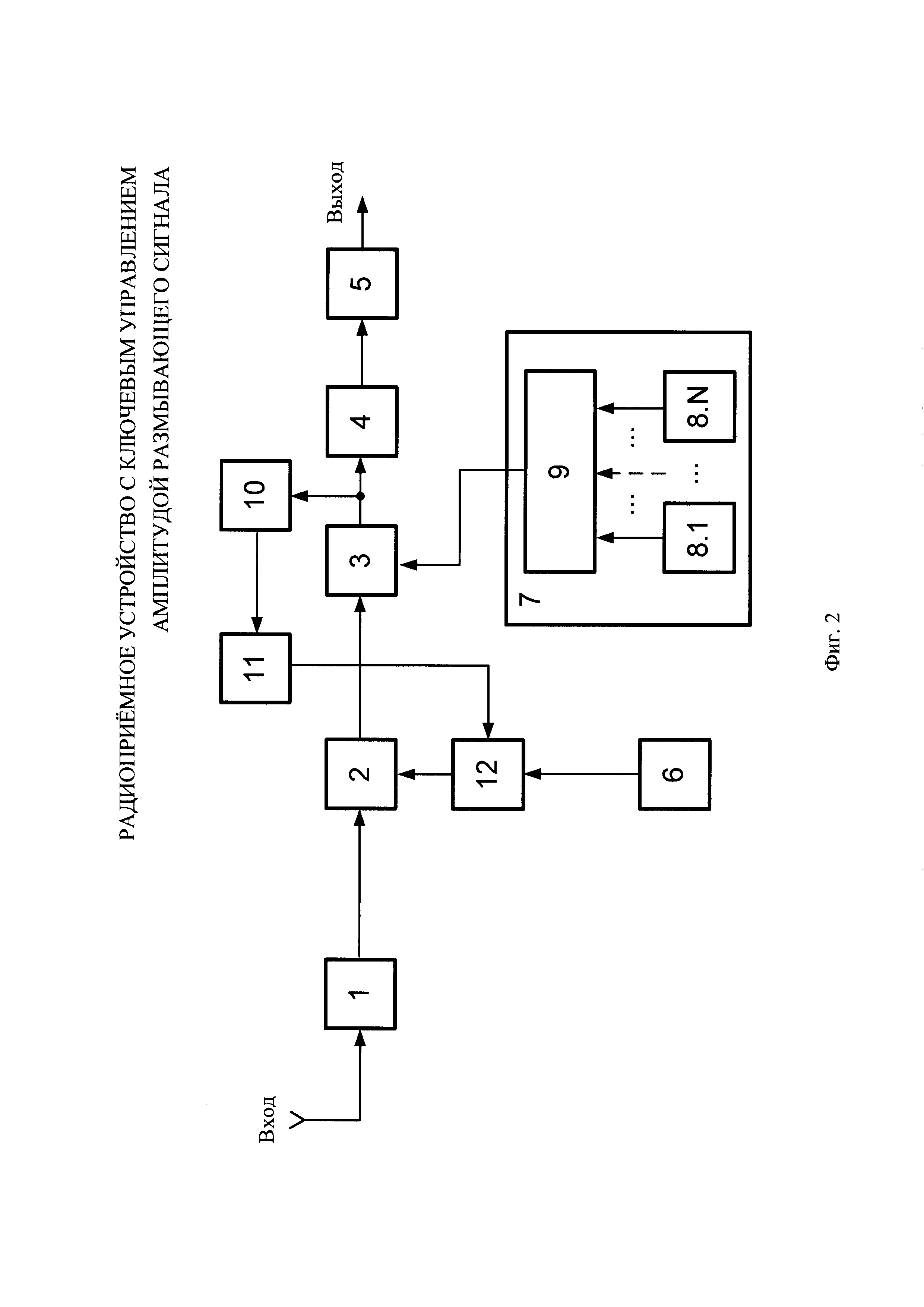Радиоприемное устройство с ключевым управлением амплитудой размывающего сигнала, содержащее последовательно соединенные блок входных цепей и преселектора, сумматор, аналого-цифровой преобразователь (АЦП), цифровой приемный тракт и демодулятор, выход которого является информационным выходом устройства; последовательно соединенные формирователь размывающего сигнала и ключ, выход которого соединен со вторым входом сумматора; источник частоты дискретизации, содержащий N опорных генераторов, выходы которых соединены с соответствующими входами коммутатора, выход которого является выходом источника частоты дискретизации и соединен с тактовым входом АЦП, отличающееся тем, что в него дополнительно введены последовательно соединенные вычислитель амплитуды принимаемого сигнала, вход которого соединен с выходом АЦП, и цифровой компаратор, выход которого подсоединен к первому входу ключа.