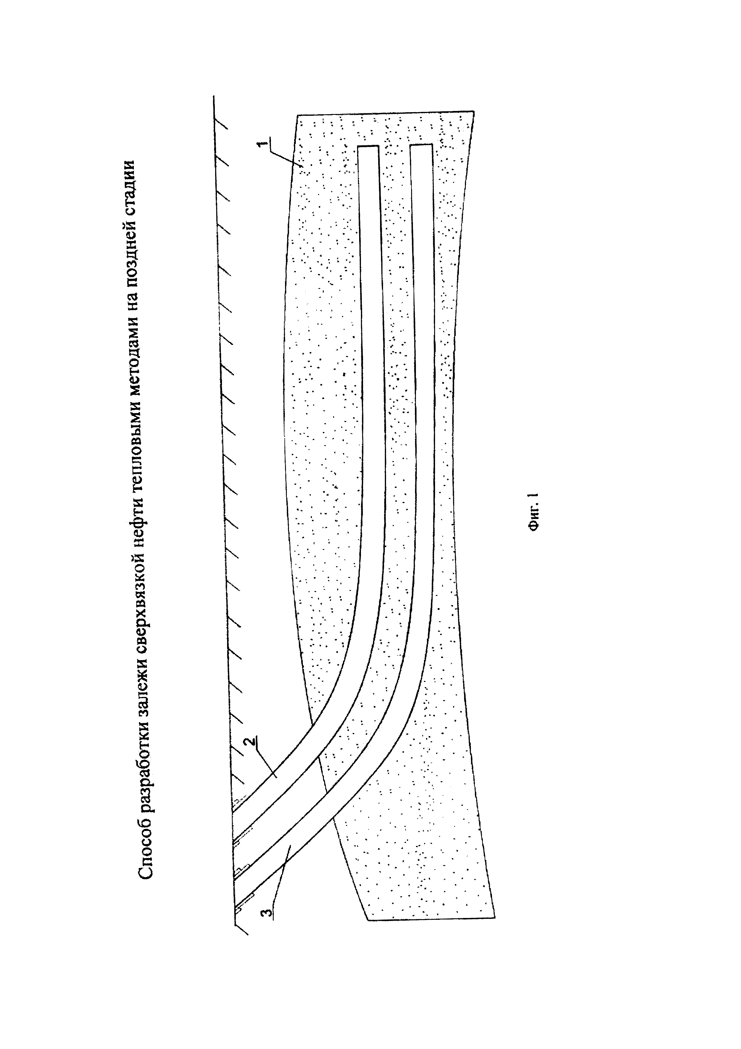 Изобретение относится к нефтедобывающей промышленности, и в частности к разработке залежи сверхвязкой нефти с применением тепла для разогрева продуктивного пласта. Способ разработки залежи сверхвязкой нефти тепловыми методами на поздней стадии разработки, включающий закачку пара в нагнетательные скважины, прогрев продуктивного пласта с созданием паровой камеры, отбор нефти через добывающие скважины, на поздней стадии разработки прекращение закачки пара, определение параметров паровой камеры, закачку горячей воды в пласт и отбор продукции, отличающийся тем, что выбирают пару скважин с термобарическими условиями в верхней нагнетательной скважине ниже температуры парообразования в пластовых условиях, с сокращением дебита по нефти до 1-3 т/сут, после чего останавливают закачку пара в верхнюю скважину, нижнюю скважину переводят под нагнетание воды объемом 30-80 м/сут с температурой 40-65°С, а верхнюю запускают под отбор продукции пласта. Предлагаемый способ разработки залежи сверхвязкой нефти тепловыми методами на поздней стадии разработки позволяет значительно повысить эффективность теплового воздействия при максимально возможном извлечении остаточной нефти из межскважинной зоны, а также снизить материальные и экономические затраты из-за отсутствия закачки газа. 1 ил.