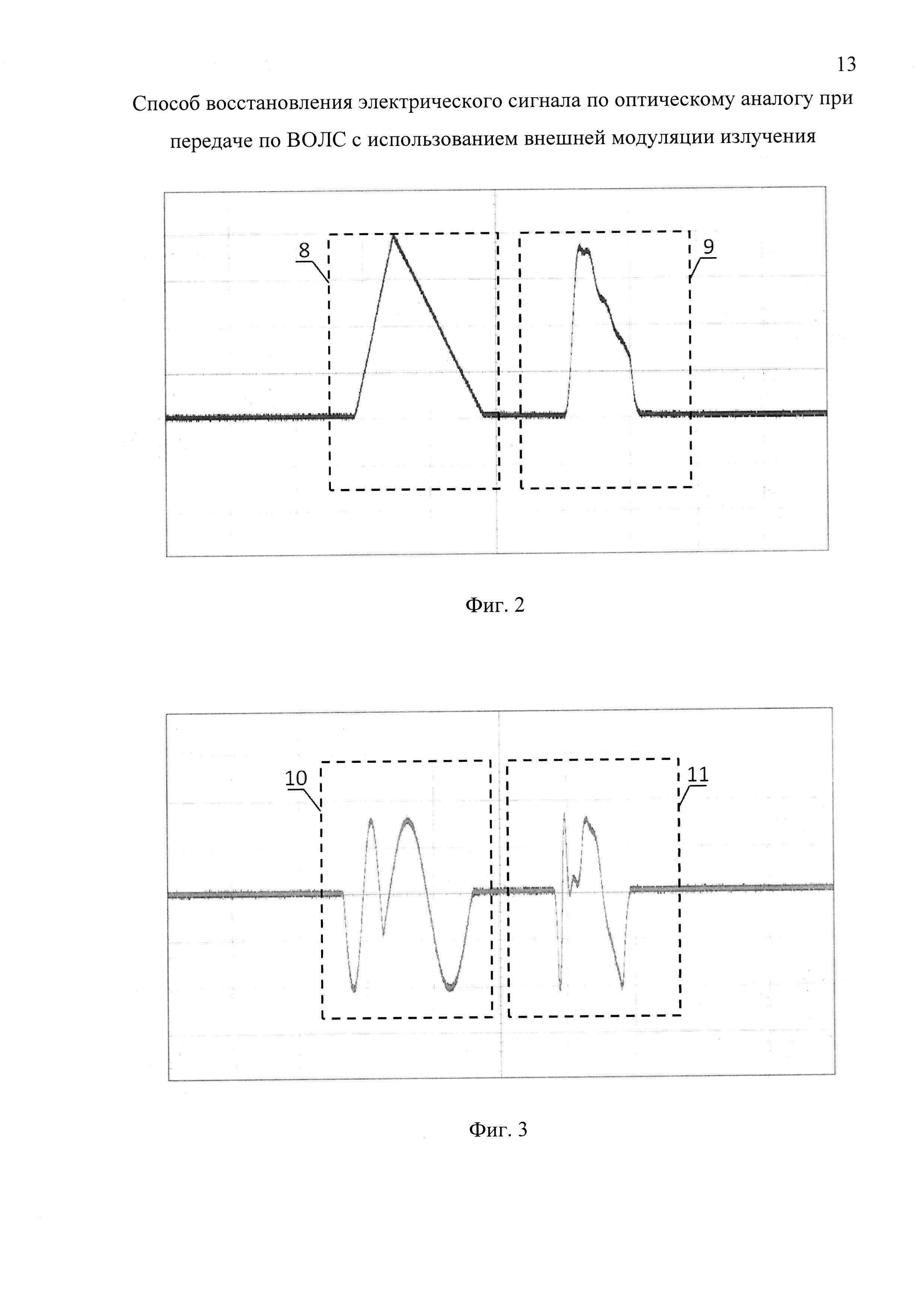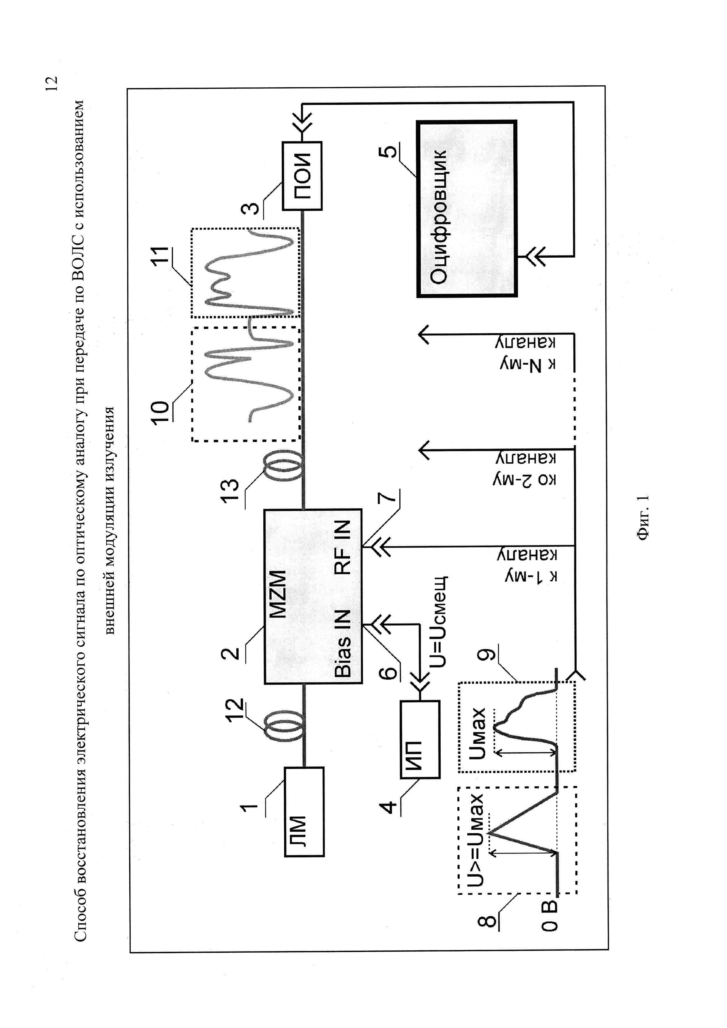 Изобретение относится к системам передачи аналоговых сигналов микро-, наносекундного временного диапазона по волоконно-оптическим линиям связи (ВОЛС) с использованием внешней модуляции излучения и может быть использовано для восстановления формы передаваемого электрического сигнала по оптическому аналогу. Функция пропускания электрооптического модулятора интенсивности по схеме интерферометра Маха-Цандера (далее по тексту модулятор) (зависимость пропускания модулятора от приложенного к электрическому сигнальному входу напряжения) по форме близка к синусоидальной. Поэтому при передаче аналоговых сигналов с использованием таких модуляторов для точного восстановления формы передаваемого сигнала необходимо знать как функцию пропускания (заранее определенную), так и рабочую точку модулятора (пропускание модулятора при отсутствии напряжения на электрическом сигнальном входе). Изменение интенсивности на выходе модулятора при подаче сигнала на электрический сигнальный вход модулятора зависит от положения рабочей точки модулятора. Дрейф рабочей точки (изменение пропускания модулятора с течением времени при отсутствии напряжения на электрическом сигнальном входе модулятора) вызван тепловыми процессами в модуляторе (поглощение лазерного излучения в модуляторе, изменение температуры модулятора и т.д.), поэтому требуется постоянный контроль и стабилизация рабочей точки. В качестве рабочей точки чаще всего выбирают минимум, максимум или середину склона функции пропускания модулятора, так как эти точки наиболее просто поддаются настройке и контролю при помощи специализированных устройств (контроллеров рабочей точки). Определение рабочей точки и функции пропускания для одного модулятора основано на подаче калибровочного электрического сигнала заранее известной (например, пилообразной) формы на электрический сигнальный вход модулятора непосредственно перед подачей на тот же вход передаваемого информационного электрического сигнала, при этом амплитуда калибровочного электрического сигнала должна быть равна или превышать амплитуду передаваемого информационного электрического сигнала. По изменению оптического сигнала после модулятора, вызванному воздействием калибровочного электрического сигнала, точно определяются рабочая точка и функция пропускания модулятора, а по полученным значениям рабочей точки и функции пропускания производится точное восстановление передаваемого информационного электрического сигнала. Метод также применим при многоканальной (N>1) (многоранговой) передаче сигнала, при этом определение рабочей точки и функции пропускания модулятора для каждого канала передачи производится аналогичным способом. Известен способ задания и контроля рабочей точки при помощи специализированного устройства - контроллера рабочей точки и дополнительного источника оптического излучения, описанный в работе Limin Ji «A Novel Electro-Optic Measurement System using Multiple Wavelengths» Submitted in Partial Fulfillment of the Requirement for the Degree Doctor of Philosophy, University of Rochester Rochester, New York 2011 (www.oruturescholar.com//paperpage?docid=574429), где для настройки и стабилизации рабочей точки модулятора используется излучение одного лазерного диода и контроллер рабочей точки, а для передачи информационного сигнала используется излучение лазерного диода с другой длиной волны. Для 