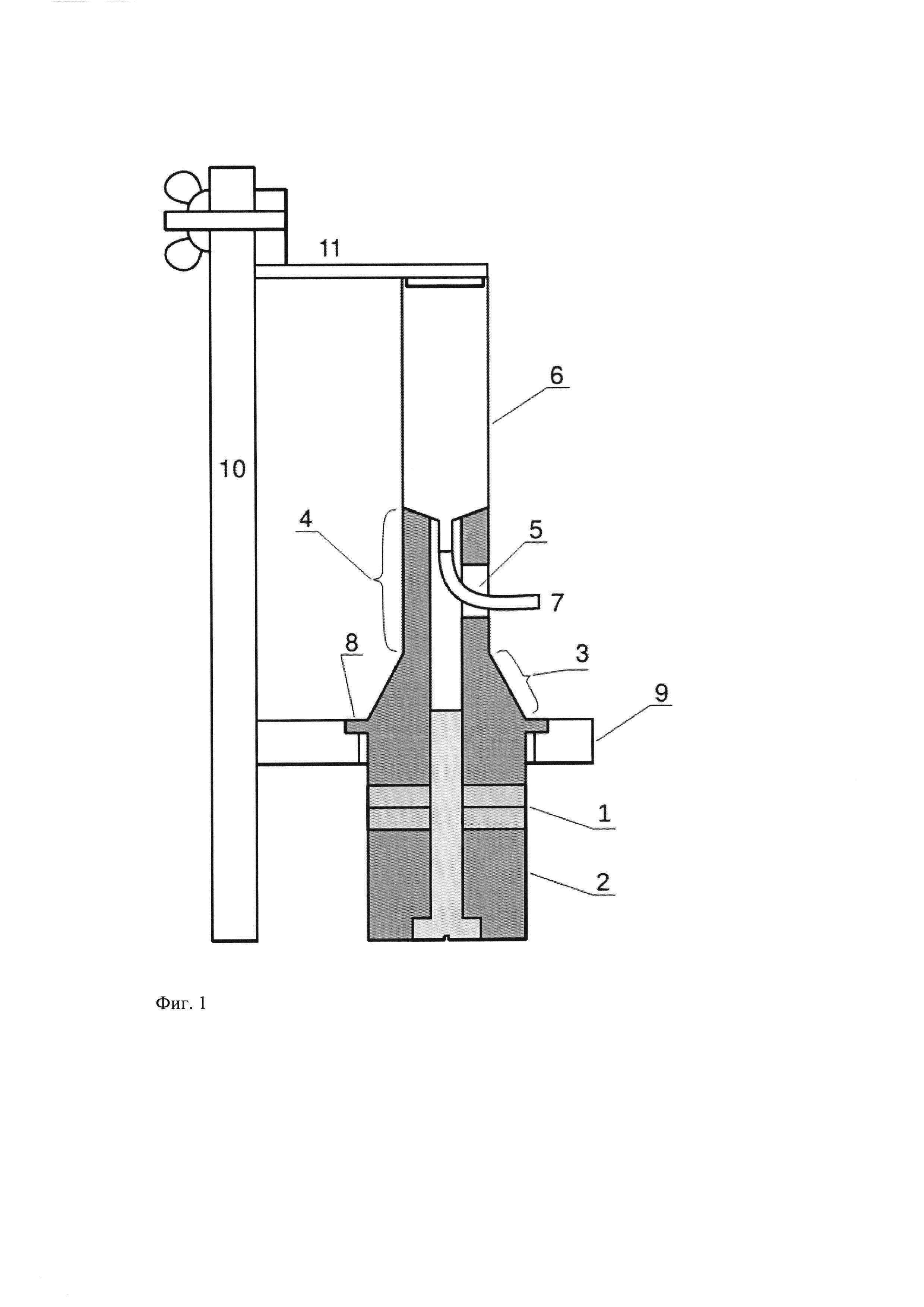 Устройство предназначено для приготовления, а также поддержания во взвешенном состоянии жидких дисперсий в сменных емкостях небольшого объема типа шприцев, пробирок с патрубком в дне или аналогичных и дает возможность в процессе работы подавать в емкость или забирать из нее обрабатываемую жидкость или продувать газ и контролировать внешними приборами или визуально объем и параметры жидкости. Устройство может найти применение в составе лабораторных установок где требуется ультразвуковая обработка жидкостей, в том числе автоматизированных и снабженных системами автоматической подачи жидкости и датчиками уровня и параметров жидкости, а также в качестве самостоятельного прибора там, где требуется сохранение высокой чистоты жидкости при ультразвуковой обработке. Известны и широко применяются устройства для ультразвуковой обработки небольших объемов жидкостей, состоящие из акустоэлектрического преобразователя с отражающей накладкой, акустического трансформатора скоростей и протяженного звукопровода, погружаемые концом звукопровода в открытую емкость с жидкостью, описанные, например, в [1]. Такие устройства при простоте конструкции и применения не лишены недостатков, таких как сложность герметизации емкости с жидкостью при возникновении такой необходимости и кавитационный износ звукопровода, который приводит не только к необходимости его замены, но и к загрязнению обрабатываемой жидкости продуктами износа. Существуют способы уменьшения износа звукопровода, например, прикрепление к его излучающей поверхности защитных накладок [2], но на практике они применяются редко из-за увеличения сложности и уменьшения надежности устройства. Также, ввод ультразвукового излучения в жидкость посредством звукопровода сверху затрудняет применение датчиков уровня жидкости, что необходимо при использовании устройства в составе автоматизированных систем. Также, такие устройства работают только при уровне жидкости, лежащем в определенном диапазоне, а наибольшая эффективность достигается при нахождении излучателя вблизи середины толщи жидкости. Под жидкостью подразумевается в данном случае любое вещество, имеющее жидкое агрегатное состояние, и в том числе, например, органические растворители и их смеси, растворы, и в том числе коллоидные растворы и различные дисперсные системы в которых дисперсионная среда имеет жидкое агрегатное состояние. Также для ультразвуковой обработки жидкостей широко применяют ультразвуковые ванны, в том числе имеющие патрубки для слива жидкости. Ультразвуковые ванны не позволяют обрабатывать напрямую малые объемы жидкости (до 20 мл), имеют неравномерное акустическое поле, большие размеры и массу. Обработка малых объемов жидкостей с помощью ультразвуковых ванн производится путем помещения сосудов с жидкостью (например, пробирок или колб) в ванну, наполненную другой жидкостью, обычно водой, это создает определенные неудобства, снижает эффективность обработки и делает невозможной автоматизацию процесса обработки, слив и залив жидкости в емкость, находящуюся в ванне, без вынимания, приборный контроль ее уровня, а также препятствует перемешиванию жидкости. Известно устройство для ультразвуковой обработки жидкостей в шприцах или пробирках [3], включающее в себя ультразвуковой преобразо