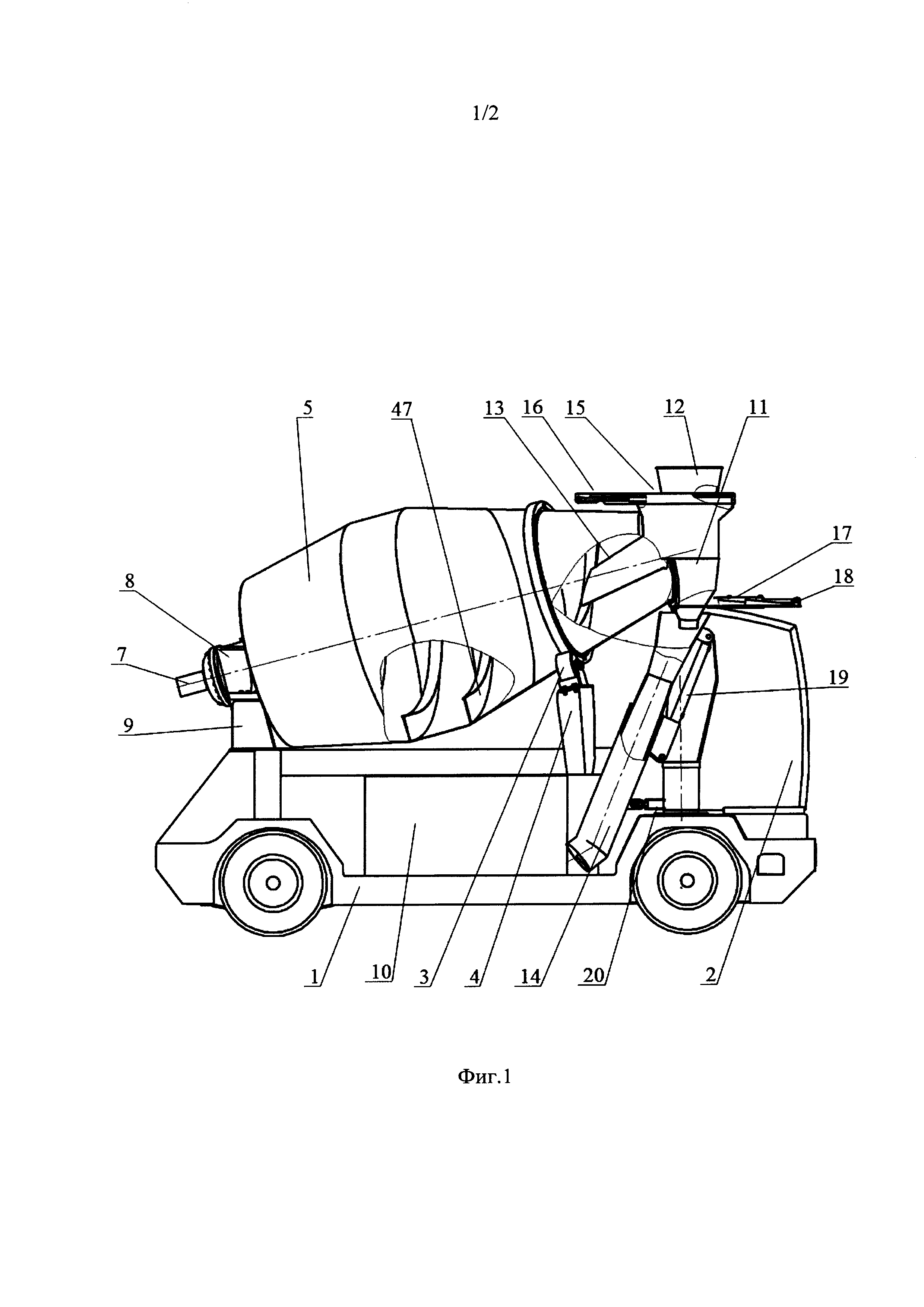 Область техники Изобретение относится к области цветной металлургии, а именно к промышленным машинам для загрузки, внутрицеховой транспортировки сыпучего сырья в виде, например, криолит-глиноземной шихты, загруженной из центральных цеховых бункеров в барабан, и боковой раздачи сырья из барабана по уровню анод/корка, на аноды электролизеров для получения алюминия, с одновременным движением машины вдоль электролизеров. Уровень техники Из уровня техники известен бетоновоз-смеситель (патент RU 2036091, В28С 5/42, В60Р 3/16, опубл. 27.05.1995 г.), предназначенный для доставки и раздачи сырья, состоящий из колесного шасси, установленный на шасси с возможностью вращения от привода барабан с загрузочным люком, жестко смонтированный на шасси бункер с выгрузным окном с возможностью взаимодействия с барабаном. Недостатками аналога является низкая производительность и неудобство при работе из-за расположения загрузочного люка на наружной поверхности вращающегося барабана, от чего для загрузки сырья в барабан требуется время, чтобы точно совместить загрузочный люк барабана и загрузочное окно бункера. Кроме того, при загрузке сырья нельзя включать вращение барабана, что также увеличивает время заполнения барабана и снижает производительность. Кроме того, из-за отсутствия закрываемых заслонок на выгрузном окне возможны потери сырья и загрязнение окружающей среды при работе, что негативно влияет на экологию. Известен автобетоносмеситель (патент RU 103513, В28С 5/42, опубл. 20.04.2011 г.), предназначенный для доставки и раздачи сырья, состоящий из самоходного колесного шасси с кабиной водителя, установленный на шасси с возможностью вращения от привода барабан с выгрузным окном, жестко смонтированный на шасси бункер с загрузочным лотком, имеющий возможность взаимодействия с барабаном и работающий от системы управления. Недостатками аналога является низкая производительность и неудобство при работе из-за расположения места загрузки и раздача сырья в задней, противоположной кабине части машины, из-за чего водителю, при выполнении технологических операций, требуется выходить из кабины и нет возможности производить раздачу сырья на ходу во время движения машины. Кроме того из-за отсутствия закрывающихся заслонок в бункере и на выгрузном окне барабана возможны потери сырья и загрязнение окружающей среды при работе, что негативно влияет на экологию. Наиболее близким по технической сущности является машина загрузки криолит-глиноземной шихты КГК, http://hencon.ru/produktsiya/produkt-1/tekhnika-dlya-korpusov-elektroliza/mashina-zagruzki-kriolit-glinozemnoj-shikhty (сайт продукции Hencon: http://hencon.ru/), предназначенная для доставки и боковой раздачи криолит-глиноземной шихты в электролизеры с одновременным движением машины вдоль электролизеров. Машина состоит из самоходного колесного шасси с кабиной водителя, установленный на шасси с возможностью вращения от гидропривода барабан, жестко смонтированные на шасси бункер, оборудованный загрузочным лотком, одной шиберной заслонкой и выгрузной трубой, смонтированные с возможностью взаимодействия с барабаном, системы управления загрузкой и раздачей. Недостатками аналога является отсутствие закрывающейся заслонки в выгрузной трубе, от чего при загрузке и переездах могут происходить потери сырья и загрязнение окружающей среды, что негативно влияет на экологию, к