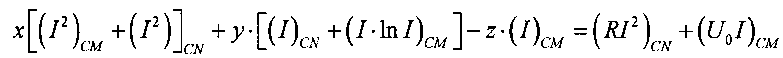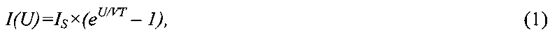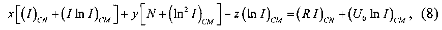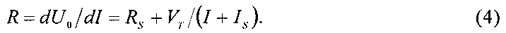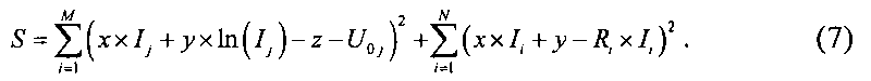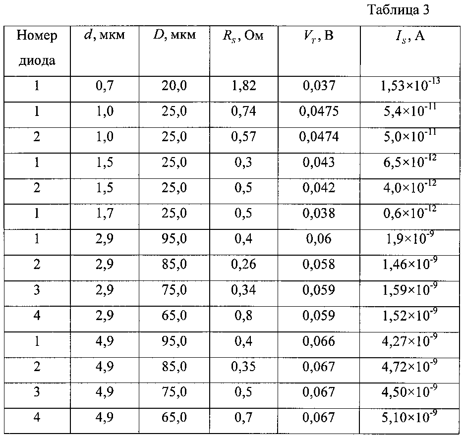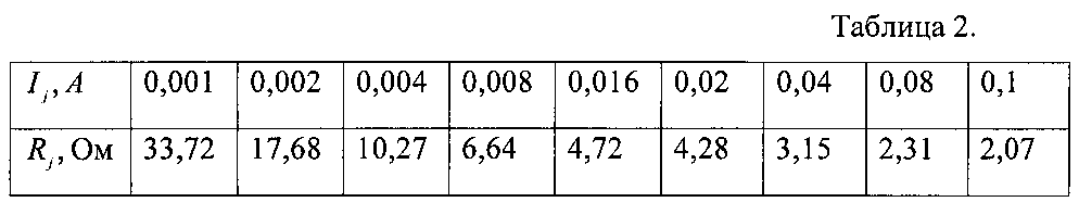 Изобретение относится к электронной технике и может быть использовано при проектировании устройств СВЧ широкого применения. В основе проектирования устройств управления амплитудой сигнала СВЧ (ограничителей, переключателей и т.д.) лежит нелинейная модель диода, которая в простейшем случае описывается эквивалентной схемой с элементами (емкостью, проводимостью, источником тока и т.п.), величины которых являются нелинейными функциями приложенных к этим элементам напряжений. Так зависимость тока от напряжения прибора СВЧ, как правило, представляет собой резко возрастающую функцию. Известен способ определения параметров прибора СВЧ, включающий измерение Μ значений тока Ij, протекающего через прибор, и Μ значений напряжения Uj на электрических контактах прибора при значениях j, равных 1, 2, … М, моделирование работы прибора в виде нелинейной функции этого напряжения на электрических контактах прибора от этого тока и определяемых параметров, собственно определение параметров прибора решением нелинейных уравнений с определяемыми параметрами [1] - прототип. Недостатком этого способа является то, что измерение вольтамперной характеристики прибора осуществляют при сравнительно малых значениях тока, протекающего через прибор. Между тем при работе в устройствах управления амплитудой, особенно в защитных устройствах, ток через прибор СВЧ может достигать большой величины и поэтому точность определения параметров приборов СВЧ данным способом приводит к снижению точности, так что при больших токах способ определения параметров прибора СВЧ приводит к большой погрешности при проектировании устройств СВЧ. Техническим результатом изобретения является повышение точности и расширение функциональных возможностей способа определения параметров прибора СВЧ. Технический результат достигается заявленным способом определения параметров прибора СВЧ включающим измерение Μ значений тока Ij, протекающего через прибор, и Μ значений напряжения Uj на электрических контактах прибора при значениях j равных 1, 2, … М, моделирование работы прибора в виде нелинейной функции этого напряжения на электрических контактах прибора от этого тока и определяемых параметров, собственно определение параметров прибора решением нелинейных уравнений с определяемыми параметрами, в котором дополнительно измеряют N значений тока Ii и N значений дифференциального сопротивления Ri при значениях i, равных 1, 2, … N, дополнительно осуществляют моделирование работы прибора нелинейной функцией дифференциального сопротивления от этих i значений тока и определяемых параметров, а собственно определение параметров прибора решением нелинейных уравнений с определяемыми параметрами осуществляют при их общем числе, равном Μ+N, посредством метода наименьших квадратов. Раскрытие сущности заявленного изобретения Совокупность существенных признаков заявленного способа определения параметров прибора СВЧ, а именно когда: дополнительно измеряют N значений тока Ii и N значений дифференциального сопротивления Ri при значениях i, равных 1, 2,…N, дополнительно осуществляют моделирование работы прибора нелинейной функцией дифференциального сопротивления от этих i значений тока и определяемых параметров, а собственно определение параметров прибора решением нелинейных уравн