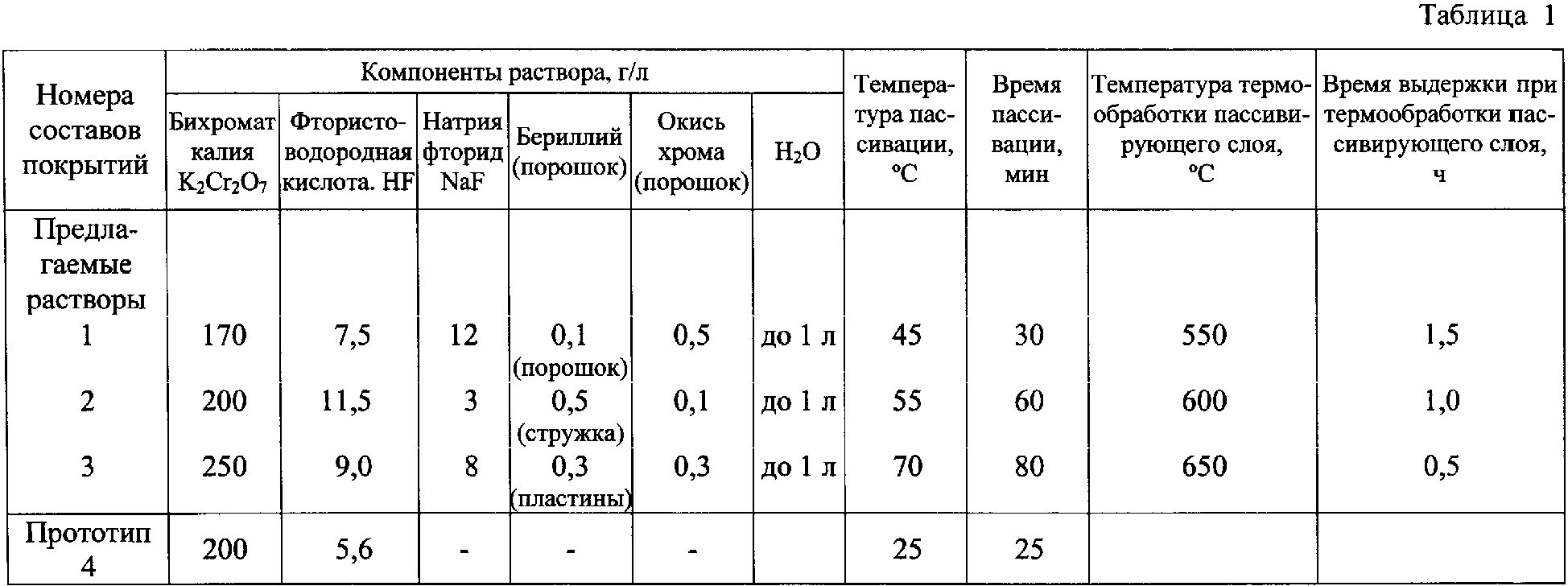 Изобретение относится к области машиностроения и к технике производства изделий из цветных сплавов, в частности к защитным покрытиям от газовой коррозии в процессах длительной эксплуатации и при технологических нагревах в процессе получения высококачественных деталей и полуфабрикатов из бериллия и его сплавов при термической и термомеханической обработке давлением. Бериллий при воздействии высоких температур подвергается поверхностному окислению с выделением токсичных соединений в атмосферу. Общепринятым, наиболее перспективным способом защиты от окисления является применение органических и неорганических защитных покрытий. Известен способ пассивирования бериллия, включающий погружение бериллиевой детали в ванну с водным раствором, содержащим хромовую кислоту (CrO3) и фтористый натрий (NaF). Процесс ведут при рН (1,6-2,0), температуре (15-30)°С в течение (5-15) мин в ванне с ультразвуковым перемешиванием (патент США №4328047). Недостатком указанного способа является низкая температуроустойчивость и термостойкость покрытия к бериллию и его сплавам при рабочих температурах до 1200°С. Известны способы защиты поверхностей алюминия и его сплавов от коррозии в растворах, содержащих, например, азотную кислоту, ионы фторидов и хроматы (патент Великобритании №740805) или растворимый шестивалентный хром, фторсодержащий компонент, растворимую соль редкоземельных металлов и марганец (патент Великобритании №1363438). Недостатком указанного состава является низкая температуроустойчивость и термостойкость покрытия к бериллию и его сплавам при рабочих температурах до 1200°С. Наиболее близким техническим решением, принятым за прототип, является способ получения защитного покрытия на изделиях из бериллия, включающий подготовку поверхности и последующую его пассивацию путем нанесения на поверхность изделия водного раствора, содержащего 200 г/л дигидрат бихромата натрия (Na2Cr2O7·2H2O) и 0,3-9,6 г/л фтористоводородной кислоты (HF). Процесс ведут от 20 сек до 9 мин (патент США №3485682). Недостатками прототипа являются низкая температуроустойчивость и термостойкость покрытия к бериллию и его сплавам при рабочих температурах до 1200°С. Низкая температуроустойчивость и термостойкость покрытия приводят к трещинам покрытия в процессе работы и сопровождаются нежелательным окислением изделия из бериллия и его сплавов при эксплуатации деталей при повышенных температурах. Технической задачей изобретения является создание защитного покрытия на изделии из бериллия и его сплавов, обладающего повышенной температуроустойчивостью до 1200°С и высокой термостойкостью к изделию из бериллия и его сплавам. Поставленная техническая задача достигается тем, что предложен способ получения защитного покрытия на изделии из бериллия и его сплавов, включающий подготовку поверхности изделия и последующую пассивацию путем нанесения на поверхность изделия водного раствора, содержащего бихромат щелочного металла и фтористоводородную кислоту, отличающийся тем, что в раствор дополнительно вводят фторид натрия, бериллий и окись хрома, при следующем соотношении компонентов (г/л): а после пассивации проводят термическую обработку поверхности и нанесение на нее неорганического эмалевого покрытия системы В2О3-PbO-CaO-MgO-Al2O3-Cr2O3-CoO-SiO2. Пассивацию поверхности предпочтительно проводить 