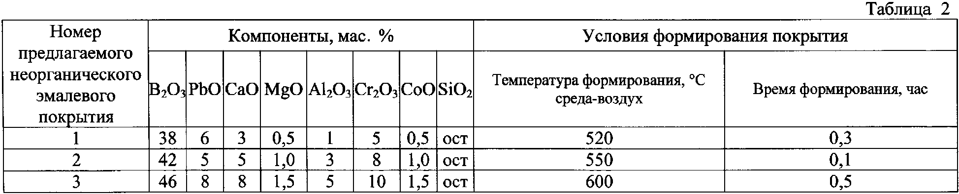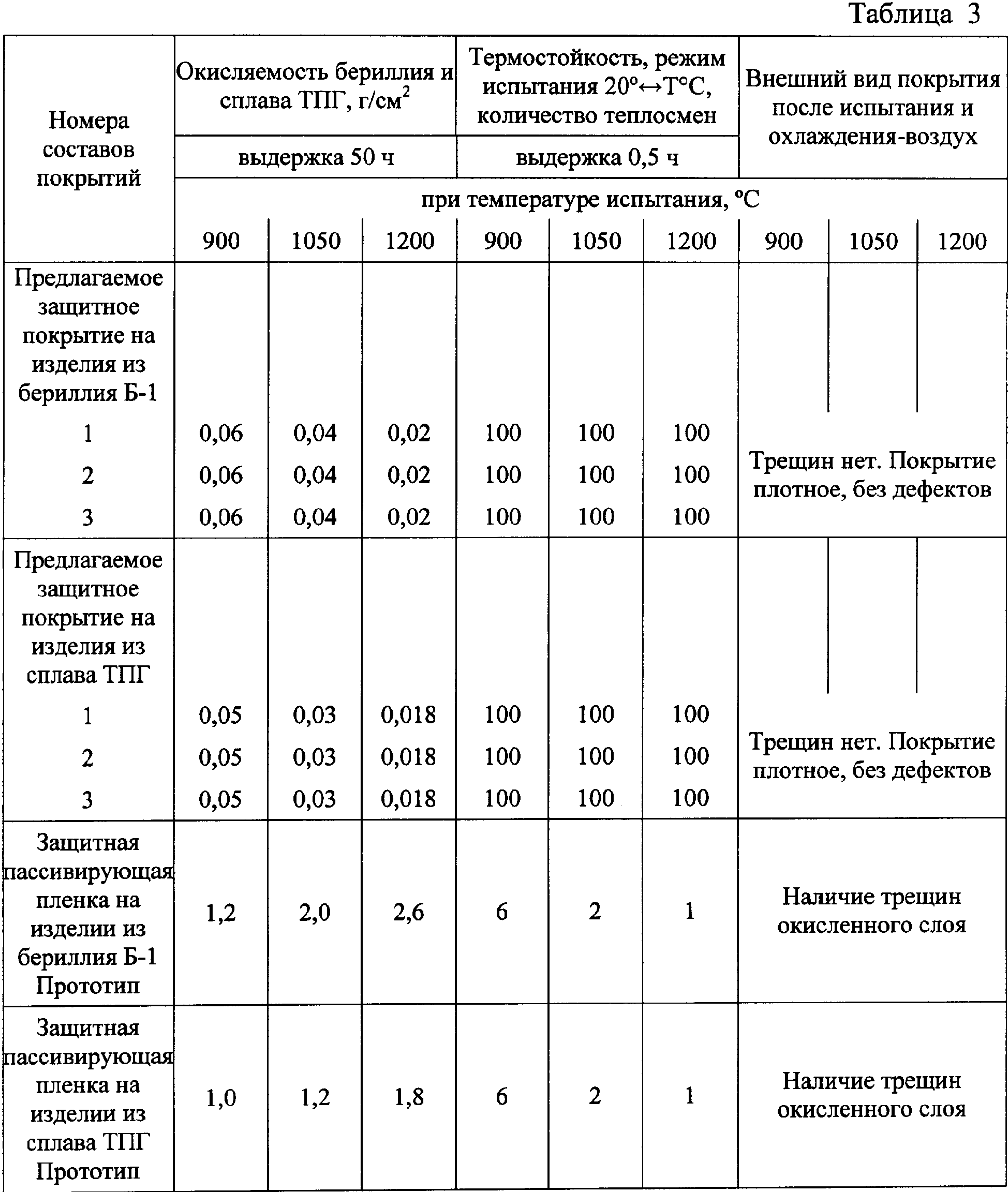Изобретение относится к области машиностроения и к технике производства изделий из цветных сплавов, в частности к защитным покрытиям от газовой коррозии в процессах длительной эксплуатации и при технологических нагревах в процессе получения высококачественных деталей и полуфабрикатов из бериллия и его сплавов при термической и термомеханической обработке давлением. Способ включает подготовку поверхности изделия и последующую ее пассивацию путем нанесения на поверхность изделия водного раствора, содержащего бихромат калия 170-250 г/л, фтористоводородную кислоту 7,5-11,5 г/л, фторид натрия 3-12 г/л, бериллий 0,1-0,5 г/л и окись хрома 0,1-0,5 г/л с последующей термической обработкой этой поверхности и нанесением на нее неорганического эмалевого покрытия системы В2О3-PbO-СаО-MgO-Al2О3-Cr2О3-СоО-SiO2. Пассивацию проводят в течение 30-80 мин при температуре 45-70°С, а термическую обработку пассивирующей поверхности проводят при температуре 550-650°С в течение 0,5-1,5 ч. Формирование неорганического эмалевого покрытия системы B2O3-PbO-CaO-MgO-Al2O3-Cr2O3-CoO-SiO2 проводят при температуре 520-600°С в течение 0,1-0,5 ч. Технический результат - создание защитного покрытия, обладающего повышенной температуроустойчивостью до 1200°С и высокой термостойкостью на изделиях из бериллия и его сплавов. 3 з.п. ф-лы, 3 табл.