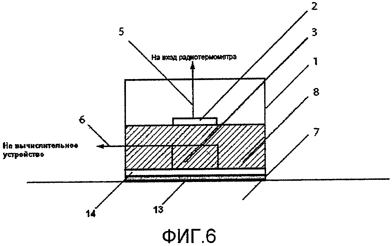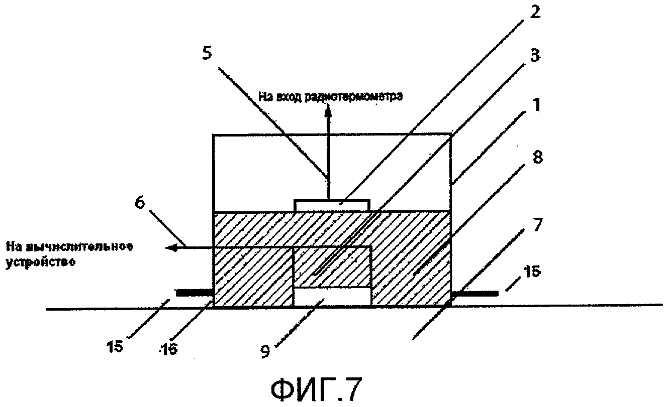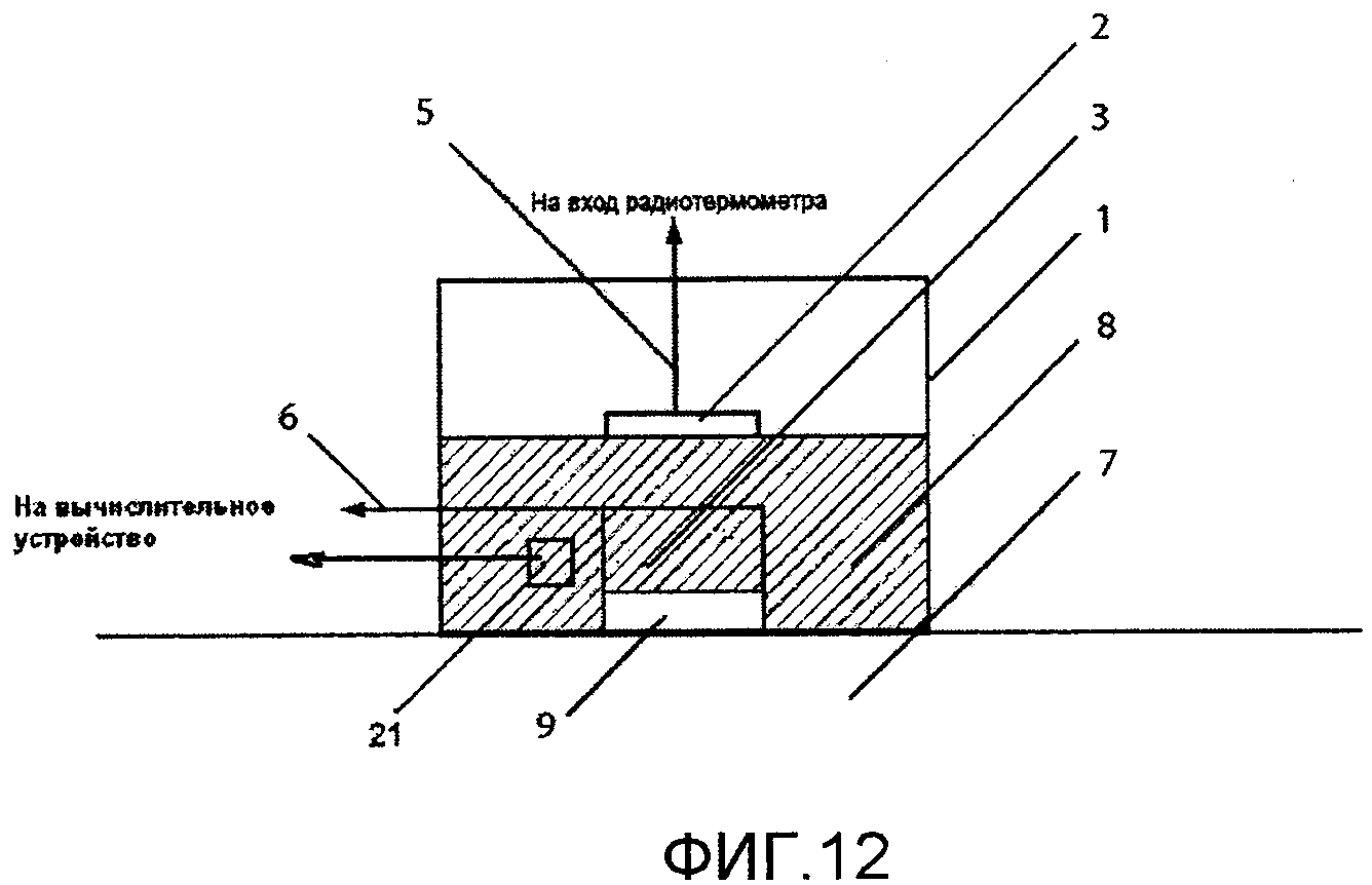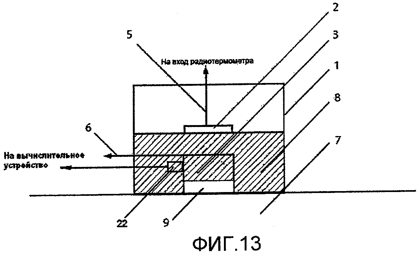 1. Антенна-аппликатор для определения температурных изменений внутренних тканей биологического объекта, содержащая: отрезок волновода, частично или полностью заполненный диэлектриком, имеющий один закрытый конец и противоположный открытый конец, контактирующий с биологическим объектом, 2. Антенна-аппликатор по п.1, отличающаяся тем, что датчик температуры кожи соединен с вычислительным устройством проводниками, расположенными ортогонально вектору электрического поля антенны-аппликатора. 3. Антенна-аппликатор по п.1, отличающаяся тем, что она содержит контактный экранированный датчик температуры, расположенный на открытом конце волновода, контактирующем с биологическим объектом. 4. Антенна-аппликатор по п.1, отличающаяся тем, что она содержит инфракрасный экранированный датчик температуры кожи, расположенный внутри отрезка волновода на расстоянии от открытого конца волновода с зазором между инфракрасным датчиком температуры и биологическим объектом. 5. Антенна-аппликатор по п.1, отличающаяся тем, что она дополнительно содержит разделительный фильтр нижних частот на выходе датчика температуры кожи. 6. Антенна-аппликатор по п.1, отличающаяся тем, что она дополнительно содержит металлизированный фланец, расположенный на расстоянии от открытого конца волновода. 7. Антенна-аппликатор по п.1, отличающаяся тем, что она дополнительно содержит диэлектрическую пластину, частично или полностью выполненную из материала, пропускающего волны ближнего инфракрасного диапазона, расположенную на открытом конце отрезка волновода, причем между диэлектрической пластиной и диэлектриком, заполняющим волновод, имеется зазор, заполненный воздухом или другим диэлектрическим материалом с низкой теплопроводностью, низкой диэлектрической проницаемостью и пропускающий волны инфракрасного диапазона. 8. Антенна-аппликатор по п.1, отличающаяся тем, что она дополнительно содержит систему подогрева. 9. Антенна-аппликатор по п.1, отличающаяся тем, что она содержит один или несколько последовательно соединенных отрезков волновода, имеющих разное поперечное сечение. 10. Антенна-аппликатор по п.1, отличающаяся тем, что она содержит один или несколько последовательно соединенных отрезков круглого волновода, имеющих разное поперечное сечение. 11. Антенна-аппликатор по п.1, отличающаяся тем, что она содержит один или несколько последовательно соединенных отрезков внутреннего волновода и расположенных снаружи от внутреннего волновода одного или нескольких отрезков внешнего волновода, причем зазор между отрезками внутреннего и внешнего волноводов частично или полностью заполнен диэлектриком. 12. Антенна-аппликатор по любому из пп.1-11, отличающаяся тем, что на диэлектрик со стороны открытого конца волновода путем металлизации нанесен согласующий элемент, обеспечивающий использование антенны-аппликатора для тканей с различной диэлектрической проницаемостью. 13. Антенна-аппликатор по любому из пп.1-11, отличающаяся тем, что она дополнительно снабжена датчиком температуры, измеряющим температуру антенны-аппликатора и передающим информацию на вычислительное устройство. 14. Антенна-аппликатор по любому из пп.1-11, отличающаяся тем, что она дополнительно содержит датчик для измерения температуры датчика температуры кожи, расположенный на корпусе датч