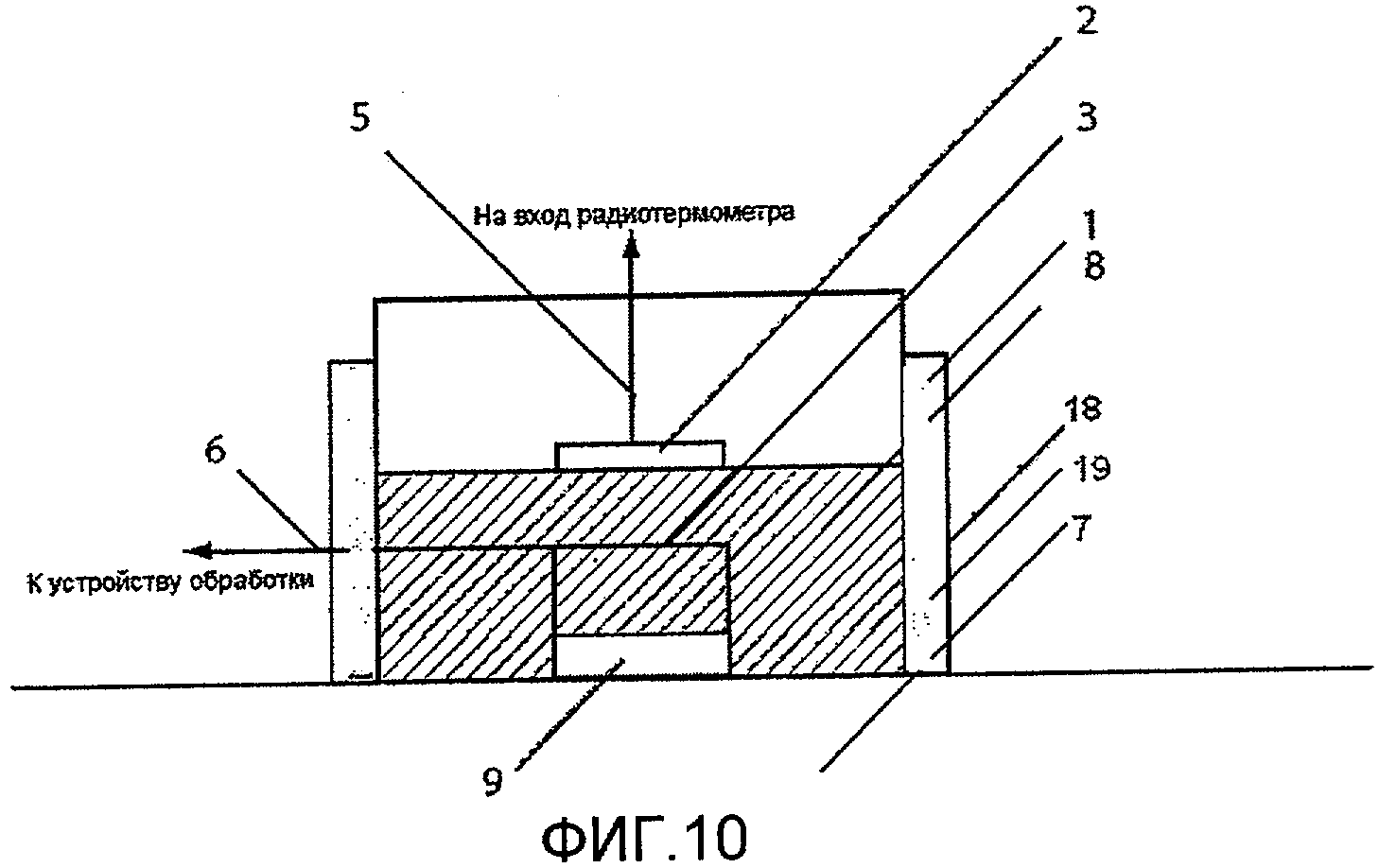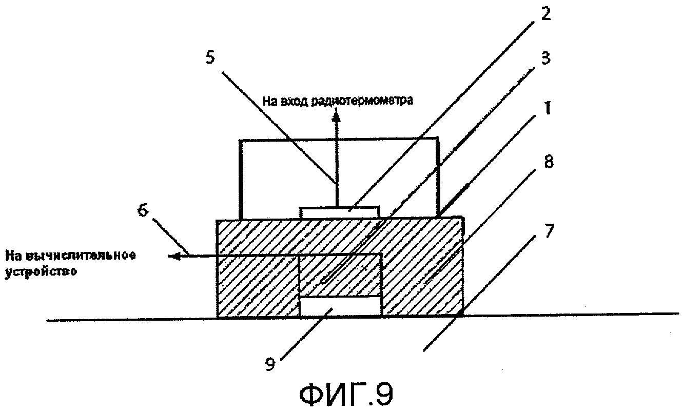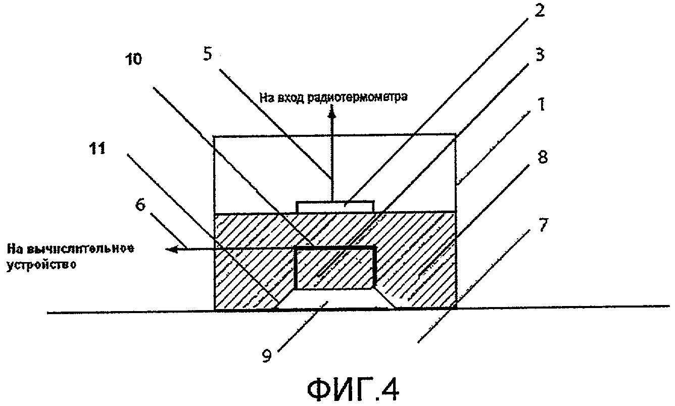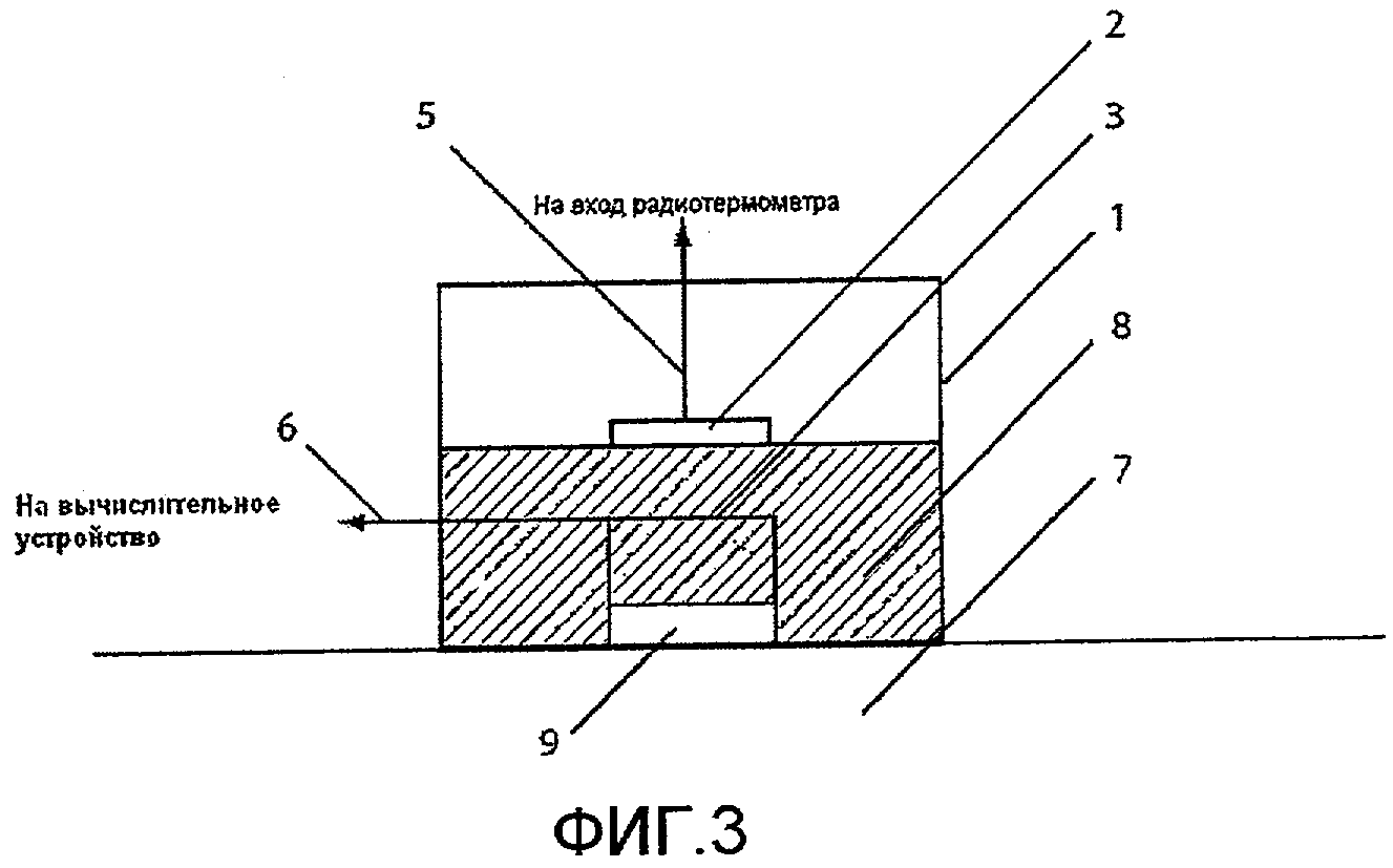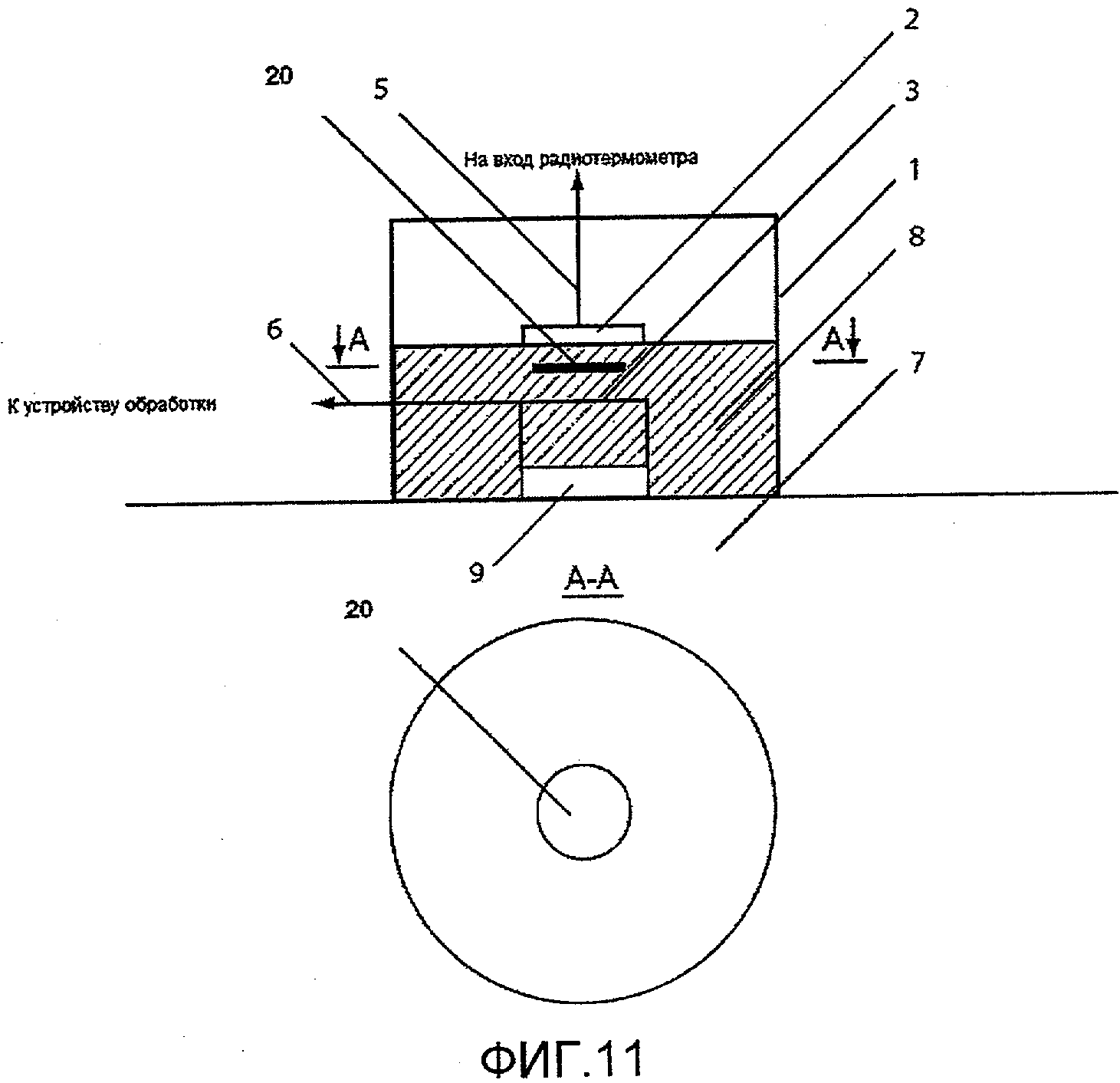 1. Антенна-аппликатор для определения температурных изменений внутренних тканей биологического объекта, содержащая: отрезок волновода, частично или полностью заполненный диэлектриком, имеющий один закрытый конец и противоположный открытый конец, контактирующий с биологическим объектом, 2. Антенна-аппликатор по п.1, отличающаяся тем, что датчик температуры кожи соединен с вычислительным устройством проводниками, расположенными ортогонально вектору электрического поля антенны-аппликатора. 3. Антенна-аппликатор по п.1, отличающаяся тем, что она содержит контактный экранированный датчик температуры, расположенный на открытом конце волновода, контактирующем с биологическим объектом. 4. Антенна-аппликатор по п.1, отличающаяся тем, что она содержит инфракрасный экранированный датчик температуры кожи, расположенный внутри отрезка волновода на расстоянии от открытого конца волновода с зазором между инфракрасным датчиком температуры и биологическим объектом. 5. Антенна-аппликатор по п.1, отличающаяся тем, что она дополнительно содержит разделительный фильтр нижних частот на выходе датчика температуры кожи. 6. Антенна-аппликатор по п.1, отличающаяся тем, что она дополнительно содержит металлизированный фланец, расположенный на расстоянии от открытого конца волновода. 7. Антенна-аппликатор по п.1, отличающаяся тем, что она дополнительно содержит диэлектрическую пластину, частично или полностью выполненную из материала, пропускающего волны ближнего инфракрасного диапазона, расположенную на открытом конце отрезка волновода, причем между диэлектрической пластиной и диэлектриком, заполняющим волновод, имеется зазор, заполненный воздухом или другим диэлектрическим материалом с низкой теплопроводностью, низкой диэлектрической проницаемостью и пропускающий волны инфракрасного диапазона. 8. Антенна-аппликатор по п.1, отличающаяся тем, что она дополнительно содержит систему подогрева. 9. Антенна-аппликатор по п.1, отличающаяся тем, что она содержит один или несколько последовательно соединенных отрезков волновода, имеющих разное поперечное сечение. 10. Антенна-аппликатор по п.1, отличающаяся тем, что она содержит один или несколько последовательно соединенных отрезков круглого волновода, имеющих разное поперечное сечение. 11. Антенна-аппликатор по п.1, отличающаяся тем, что она содержит один или несколько последовательно соединенных отрезков внутреннего волновода и расположенных снаружи от внутреннего волновода одного или нескольких отрезков внешнего волновода, причем зазор между отрезками внутреннего и внешнего волноводов частично или полностью заполнен диэлектриком. 12. Антенна-аппликатор по любому из пп.1-11, отличающаяся тем, что на диэлектрик со стороны открытого конца волновода путем металлизации нанесен согласующий элемент, обеспечивающий использование антенны-аппликатора для тканей с различной диэлектрической проницаемостью. 13. Антенна-аппликатор по любому из пп.1-11, отличающаяся тем, что она дополнительно снабжена датчиком температуры, измеряющим температуру антенны-аппликатора и передающим информацию на вычислительное устройство. 14. Антенна-аппликатор по любому из пп.1-11, отличающаяся тем, что она дополнительно содержит датчик для измерения температуры датчика температуры кожи, расположенный на корпусе датч