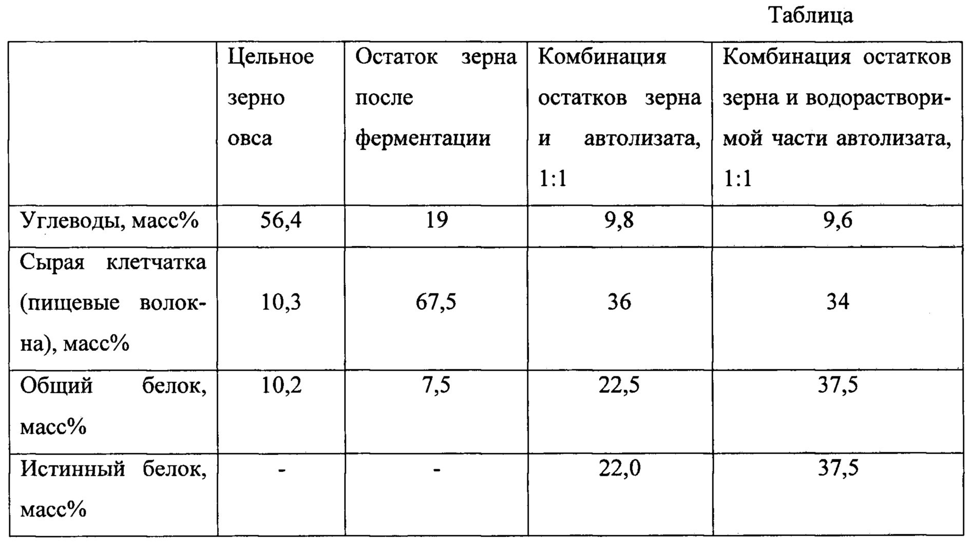 Изобретение относится к пищевой и комбикормовой промышленности и может быть использовано в производстве добавок к пище, производству продуктов функционального назначения, добавок к кормам. Цельное зерно овса, пшеницы или ячменя измельчают до частиц размером 30-200 мк, проводят его ферментативный гидролиз в водной среде термостабильной альфа-амилазой, а затем глюкоамилазой и охлаждают. В ферментолизат вносят суточную культуру дрожжей Saccharomyces cerevisiae и выращивают в условиях аэрации и перемешивания до исчерпывания сахаров в среде. Суспензию дрожжей разделяют на легкую фракцию - культуральную жидкость, среднюю фракцию - биомассу дрожжей, тяжелую фракцию - остатки измельченного зерна. Проводят автолиз биомассы дрожжей в течение 4-24 ч. Автолизат смешивают с остатками измельченного зерна и высушивают при температуре 100-105°C до остаточной влажности 8-9 мас. % или автолизат разделяют на водорастворимую и водонерастворимую фракцию, которую удаляют, а водорастворимую фракцию смешивают с остатками измельченного зерна и высушивают при температуре 100-105°C до остаточной влажности 8-9 мас. %. Автолиз проводят в присутствии олеиновой кислоты и гипохлорита натрия. Обеспечивается повышение питательных свойств ферментированного продукта из зерновой культуры, содержащего пищевые волокна, за счет автолизата дрожжей и/или водорастворимой фракции автолизата дрожжей, состоящей в основном из легкоусвояемых аминокислот и пептидов. 1 з.п. ф-лы, 1 табл., 2 пр.