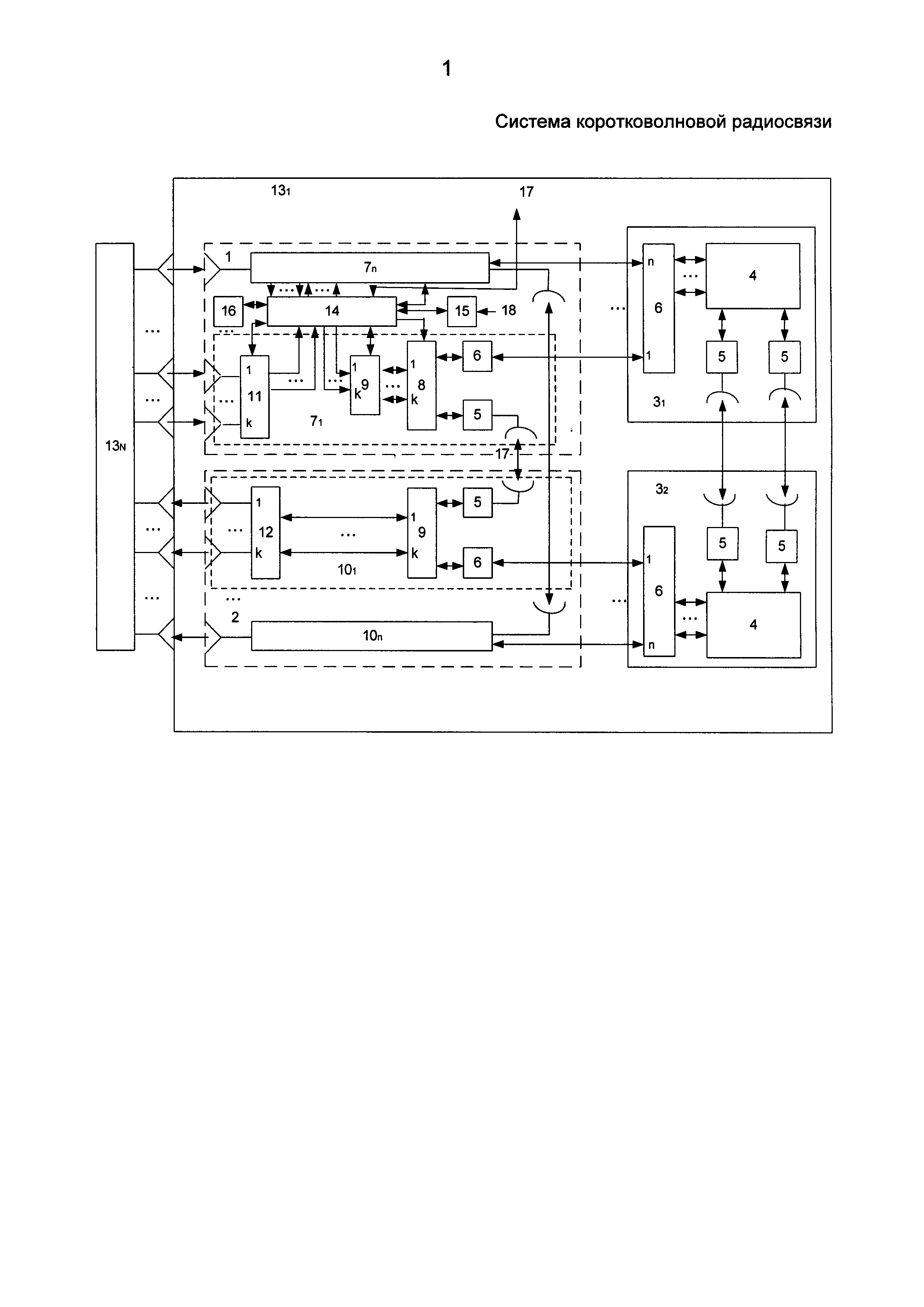 Система коротковолновой радиосвязи, содержащая приемный радиоцентр, соединенный с передающим радиоцентром посредством радиорелейной линии, и первую и вторую станции управления, соединенные между собой посредством радиорелейной линии и состоящие из соответствующих формирователя распределителя сигналов управления, входы-выходы которого соединены с входом-выходом соответствующего приемопередатчика радиорелейной связи (РРС), аппаратуру проводной связи, входы-выходы которой подключены к вторым выходам-входам формирователя распределителя сигналов управления, приемный радиоцентр состоит из n приемных трактов, каждый из которых состоит из коммутатора, выходы-входы которого соединены с входами-выходами приемопередатчика РРС, аппаратуры проводной связи и формирователя сигналов управления, входы-выходы которого соединены с соответствующими выходами-входами коммутатора, соответствующий вход-выход которого соединен с аппаратурой проводной связи, а передающий радиоцентр содержит n передающих трактов, каждый из которых состоит из приемопередатчика РРС, аппаратуры проводной связи и формирователя сигналов управления, причем выходы-входы аппаратуры проводной связи соединены с входами-выходами формирователя сигналов управления, соответствующие входы-выходы которого соединены с входами-выходами приемопередатчика РРС, передающая КB аппаратура с передающими антеннами подключена к соответствующим входам-выходам формирователя сигналов управления передающего радиоцентра, причем первая станция управления соединена с приемным радиоцентром посредством проводной связи, а вторая станция управления соединена с передающим радиоцентром посредством проводной связи, отличающаяся тем, что в нее введены N узлов связи, соединенных между собой по радиоэфиру, причем каждый узел связи содержит приемный радиоцентр, передающий центр, первую и вторую станции, соединенные между собой соответствующими связями, в каждый приемный радиоцентр введен вычислитель, соединенный двухсторонними связями с базой данных с внешним входом, формирователем сигналов управления всех приемных трактов, многотрактовой аппаратурой приема и обработки КB сигналов с приемными антеннами и с блоком управления и отображения, k входов вычислителя соединены с k выходами многотрактовой аппаратуры приема и обработки КB сигналов с приемными антеннами, а его k выходов - с k входами соответствующего формирователя сигналов управления всех приемных трактов, (k+1)-й выход вычислителя соединен с управляющим входом коммутатора приемного тракта, четвертый вход-выход вычислителя является входом-выходом системы.