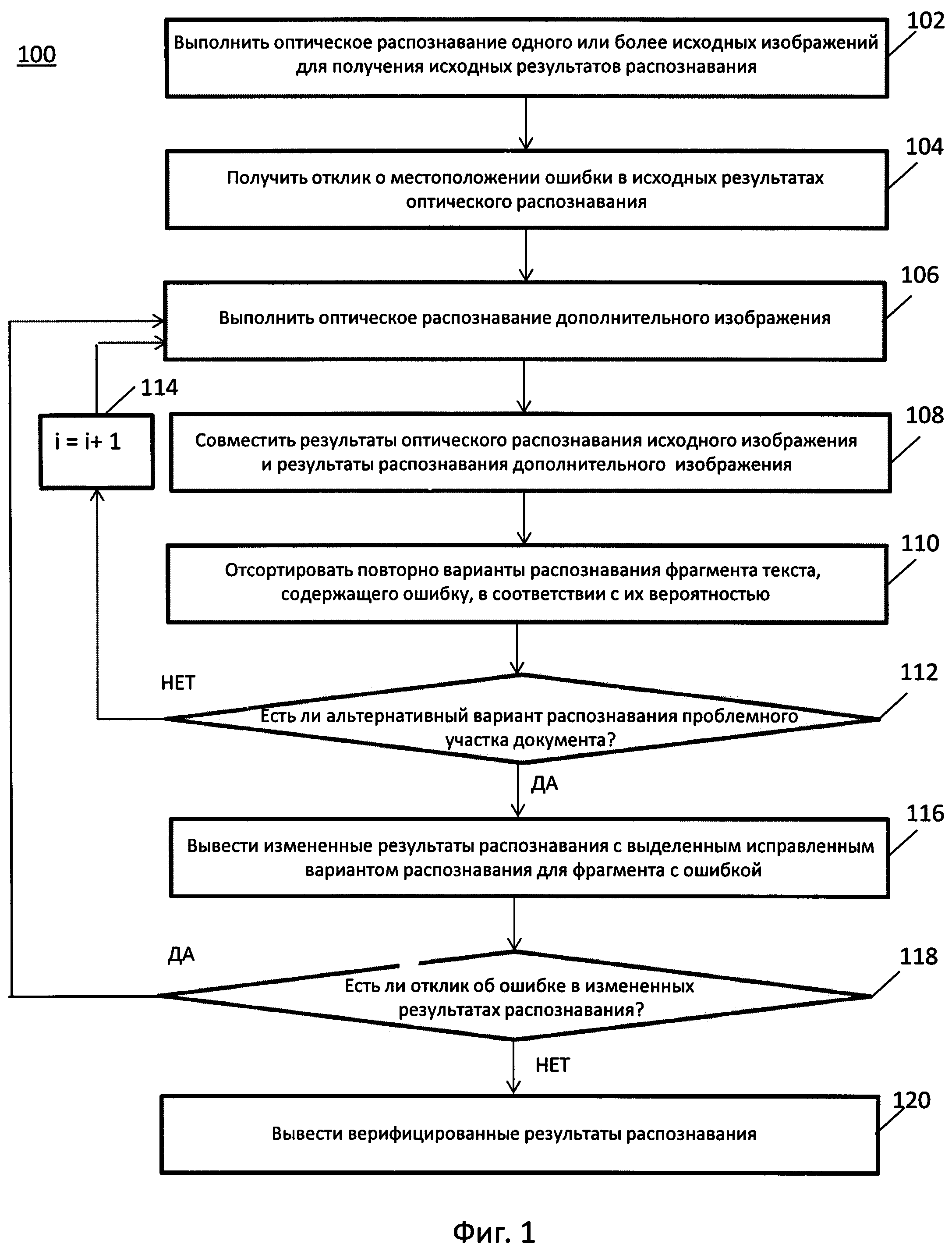 ОБЛАСТЬ ТЕХНИКИ Настоящий документ относится к вычислительным системам, а именно к системам и способам верификации результатов оптического распознавания символов. УРОВЕНЬ ТЕХНИКИ Оптическое распознавание символов (OCR) представляет собой реализованное вычислительными средствами преобразование изображений текстов (включая типографский, рукописный или печатный текст) в машиночитаемые электронные документы. КРАТКОЕ ОПИСАНИЕ ИЗОБРЕТЕНИЯ Одним из вариантов реализации изобретения является способ, включающий: оптическое распознавание символов на одном или более исходных изображениях документа с целью получения исходных результатов оптического распознавания символов и демонстрации исходных результатов оптического распознавания символов документа пользователю; получение от пользователя отклика, содержащего местоположение ошибки в исходных результатах оптического распознавания символов, при этом местоположение ошибки представляет собой положение последовательности неверно распознанных символов в исходных результатах оптического распознавания символов; получение дополнительного изображения документа, при этом дополнительное изображение содержит часть документа, которая соответствует местоположению ошибки, и выполнение оптического распознавания символов дополнительного изображения для получения дополнительных результатов оптического распознавания символов; выявление кластера символьных последовательностей, которые соответствуют местоположению ошибки, с использованием исходных результатов оптического распознавания символов и дополнительных результатов оптического распознавания символов; выявление порядка символьных последовательностей в кластере символьных последовательностей на основе соответствующих им значений вероятности; и демонстрации пользователю измененного результата оптического распознавания символов, который содержит в местоположении ошибки исправленную символьную последовательность, но в остальном идентичен исходному результату оптического распознавания символов, причем исправленная символьная последовательность представляет собой символьную последовательность с максимальным значением вероятности среди символьных последовательностей кластера, отличающихся от искаженной символьной последовательности. Другим вариантом осуществления изобретения является система, включающая: (а) память; (b) дисплей; (с) обрабатывающее устройство, соединенное с памятью и дисплеем, причем обрабатывающее устройство позволяет: выполнять оптическое распознавание символов на одном или более исходных изображениях документа с целью получения исходных результатов оптического распознавания символов и демонстрировать пользователю исходные результаты оптического распознавания символов документа; получать от пользователя отклик, содержащий местоположение ошибки в исходных результатах оптического распознавания символов, при этом местоположение ошибки представляет собой положение последовательности неверно распознанных символов в исходных результатах оптического распознавания символов; получать дополнительное изображение документа, при этом дополнительное изображение содержит часть документа, которая соответствует местоположению ошибки, и выполнять оптическое расп