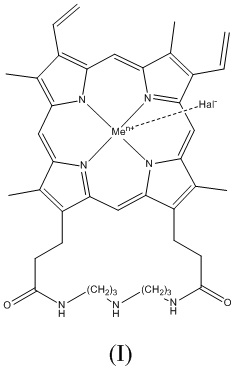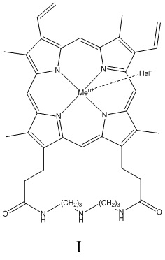 1. Соединение формулы (I) где Men+ представляет собой Fe2+ или Fe3+; Hal- представляет собой F-, Cl-, Br- или I-, или его фармацевтически приемлемая соль. 2. Фармацевтическая композиция, обладающая антибактериальной активностью, включающая в качестве активного ингредиента эффективное количество соединения формулы (I) по п.1 или его фармацевтически приемлемую соль и фармацевтически приемлемый носитель. 3. Фармацевтическая композиция по п. 2, которая представляет собой антибактериальное средство. 4. Фармацевтическая композиция по п.2, которая проявляет активность в отношении грамположительных бактерий. 5. Фармацевтическая композиция по п.4, где бактерии представляют собой грамположительные бактерии рода Staphylococcus, Enterococcus. 6. Фармацевтическая композиция по п.5, где бактерии представляют собой грамположительные бактерии рода Staphylococcus aureus, Staphylococcus haemolyticus, Enterococcus faecalis. 7. Фармацевтическая композиция по п.5, где бактерии относятся к резистентным штаммам Enterococcus faecalis, Staphylococcus aureus, Staphylococcus haemolyticus. 8. Антибактериальное средство, содержащее соединение формулы (I) по п.1. 9. Антибактериальное средство по п. 8, которое проявляет активность в отношении грамположительных бактерий. 10. Антибактериальное средство по п. 9, где бактерии представляют собой грамположительные бактерии рода Staphylococcus, Enterococcus. 11. Антибактериальное средство по п. 10, где бактерии представляют собой грамположительные бактерии рода Staphylococcus aureus, Staphylococcus haemolyticus, Enterococcus faecalis. 12. Антибактериальное средство по п. 11, где бактерии относятся к резистентным штаммам Enterococcus faecalis, Staphylococcus aureus, Staphylococcus haemolyticus. 13. Антисептическоеое средство, содержащее соединение формулы (I) по п.1. 14. Антисептическое средство по п. 13, которое проявляет активность в отношении грамположительных бактерий. 15. Антисептическое средство по п. 14, где бактерии представляют собой грамположительные бактерии рода Staphylococcus, Enterococcus. 16. Антисептическое средство по п. 15, где бактерии представляют собой грамположительные бактерии рода Staphylococcus aureus, Staphylococcus haemolyticus, Enterococcus faecalis. 17. Антисептическое средство по п. 16, где бактерии относятся к резистентным штаммам Enterococcus faecalis, Staphylococcus aureus, Staphylococcus haemolyticus. 18. Дезинфицирующая композиция, содержащая соединение формулы (I) по п.1. 19. Дезинфицирующая композиция по п.18, которая проявляет активность в отношении грамположительных бактерий. 20. Дезинфицирующая композиция по п. 19 где бактерии представляют собой грамположительные бактерии рода Staphylococcus, Enterococcus. 21. Дезинфицирующая композиция по п. 21, где бактерии представляют собой грамположительные бактерии рода Staphylococcus aureus, Staphylococcus haemolyticus, Enterococcus faecalis. 22. Дезинфицирующая композиция по п. 21, где бактерии относятся к штаммам Staphylococcus aureus, Staphylococcus haemolyticus, Enterococcus faecalis. 23. Способ лечения заболеваний, вызываемых бактериями, включающий введение нуждающемумся в этом пациенту - млекопитающему, в том числе человеку, соединения формулы (I) по п.1. 24. Способ лечения заболеваний, вызываемых бактериями, включающий введение нуждающемумся в этом пациенту - млекопитающему, в том числе человеку, фармацевтической композиции на основе соединения формулы (I) по п.1. 25. Применение соединения формулы (I) по п.1 для лечения заболеваний, вызываемых бактериями, в том числе резистентными, у пациента - млекопитающего, в том числе человека. 26. Применение соединения формулы (I) по п.1 для получения лекарст