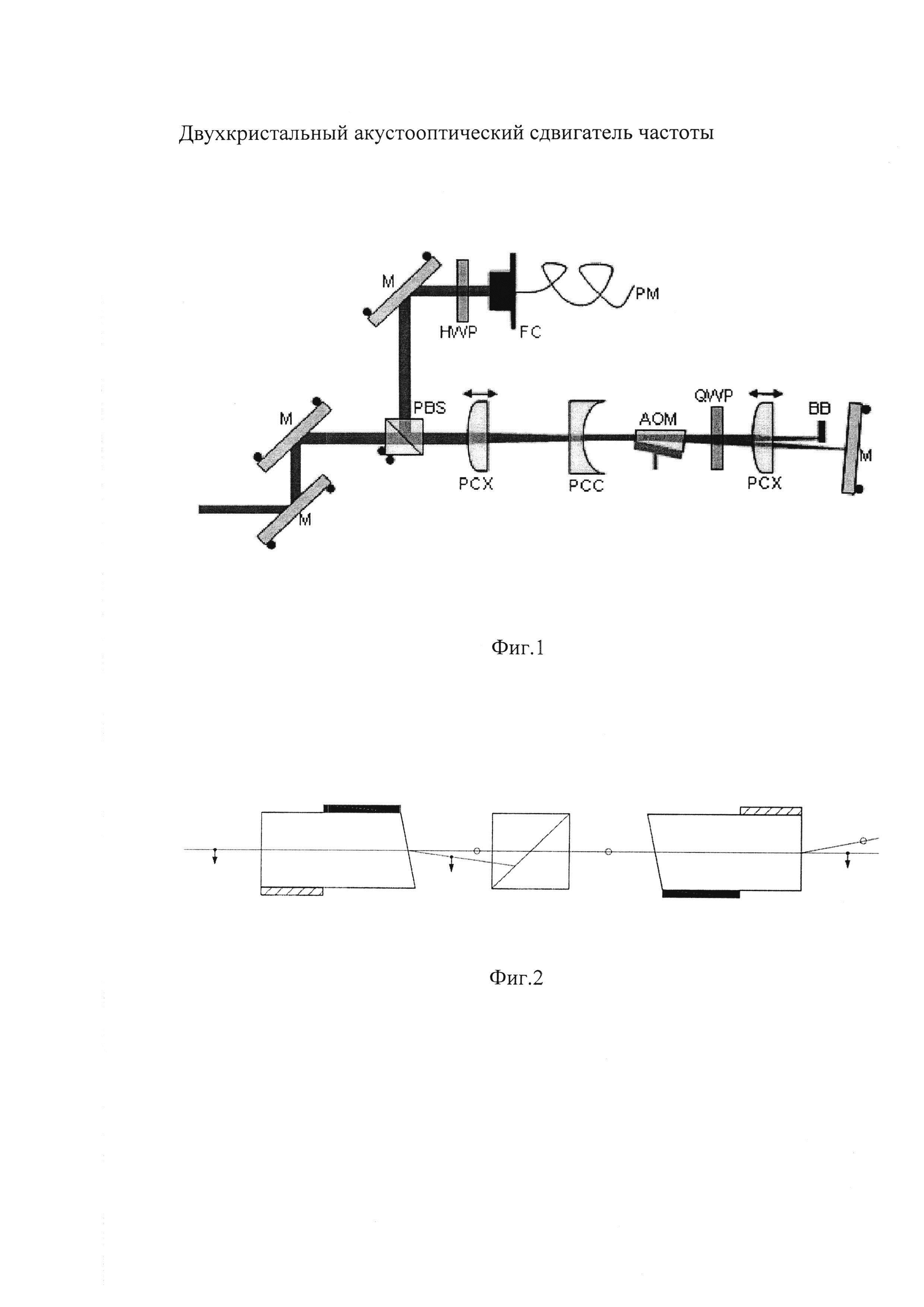 Изобретение относится к прикладной оптике и может быть использовано в системах стабилизации частоты оптического излучения, создания реперов частоты оптического излучения, измерения частоты оптического излучения, в системах типа «Фонтан» эталонов частоты. Известны различные конструкции с двигателей частоты, например, представленный на Фиг. 1 (Review of scientific instrument 76,063112 (2005) Double-pass acousto-optic modulator system. E.A. Donley, T.P. Heavner, F. Levi, M.O. Tataw and S.R. Jefferts) и выбранный за прототип. Двухкристальный акустооптический сдвигатель частоты (ДАОСЧ), в котором происходит последовательная дифракция светового излучения, в отличие от одинарных, обладает таким важным достоинством: как простота юстировки ДАОСЧ. В ДАОСЧ нет необходимости использовать фазовую пластину, объектив типа «кошачий глаз» и отражающее зеркало. Объектив типа «кошачий глаз» и отражающее зеркало необходимо очень точно юстировать. Кроме того, в отличие от АО ячеек СЧ, использующих объектив «кошачий глаз», в ДАОСЧ используются АО ячейки с анизотропной дифракцией. Эффективность анизотропной акустооптической дифракции на кристаллах парателлурита в десятки раз выше, чем эффективность изотропной акустооптической дифракции. Соответствующим образом снижается и управляющая мощность. Недостатком такого устройства является существенно большая управляющая мощность, использование дополнительных оптических элементов (фазовой пластины, объектива типа «кошачий глаз» и зеркала, требующих точной юстировки). Также известен АОСЧ, использующий анизотропную дифракцию, но направление распространения продифрагировавшего излучения в нем зависит от частоты сдвига. Таким образом, необходимо механически подстраивать приемный тракт для каждой частоты сдвига. Недостатком такого устройства является то, что при изменении значения сдвига частоты необходима механическая юстировка положения приемного объектива. Решаемая настоящим изобретением задача - создание АОСЧ, лишенного недостатков ранее разработанных устройств. Разработанный ДАОСЧ не изменяет направление распространения оптического луча при изменении величины сдвига частоты оптического излучения, требует меньшей управляющей мощности, нет необходимости в использовании дополнительных оптических элементов, требующих прецизионной юстировки. Технический результат достигается за счет того, что устройство двухкристального акустооптического сдвигателя частоты оптического излучения с двукратным сдвигом по частоте и стабильность углового положения выходного пучка обеспечивается за счет последовательной дифракции светового пучка в двух симметрично расположенных акустооптических ячейках с одинаковой геометрией акустооптического взаимодействия, при этом между ячейками устанавливается устройство подавления непродифрагировавшей в первой ячейке части пучка света с поляризацией, аналогичной поляризации входного пучка. В двухкристальном АОСЧ в качестве материала АОЯ используется кристалл парателлурита. В качестве устройства подавления не продифрагировавшей в первой ячейке части пучка света может быть использован поляризатор. Роль устройства подавления непродифрагировавшего пучка может выполнять АОЯ, изготовленная таким образом, что последовательное отражение от одной грани и прохождение света через другую грань из первой АОЯ 