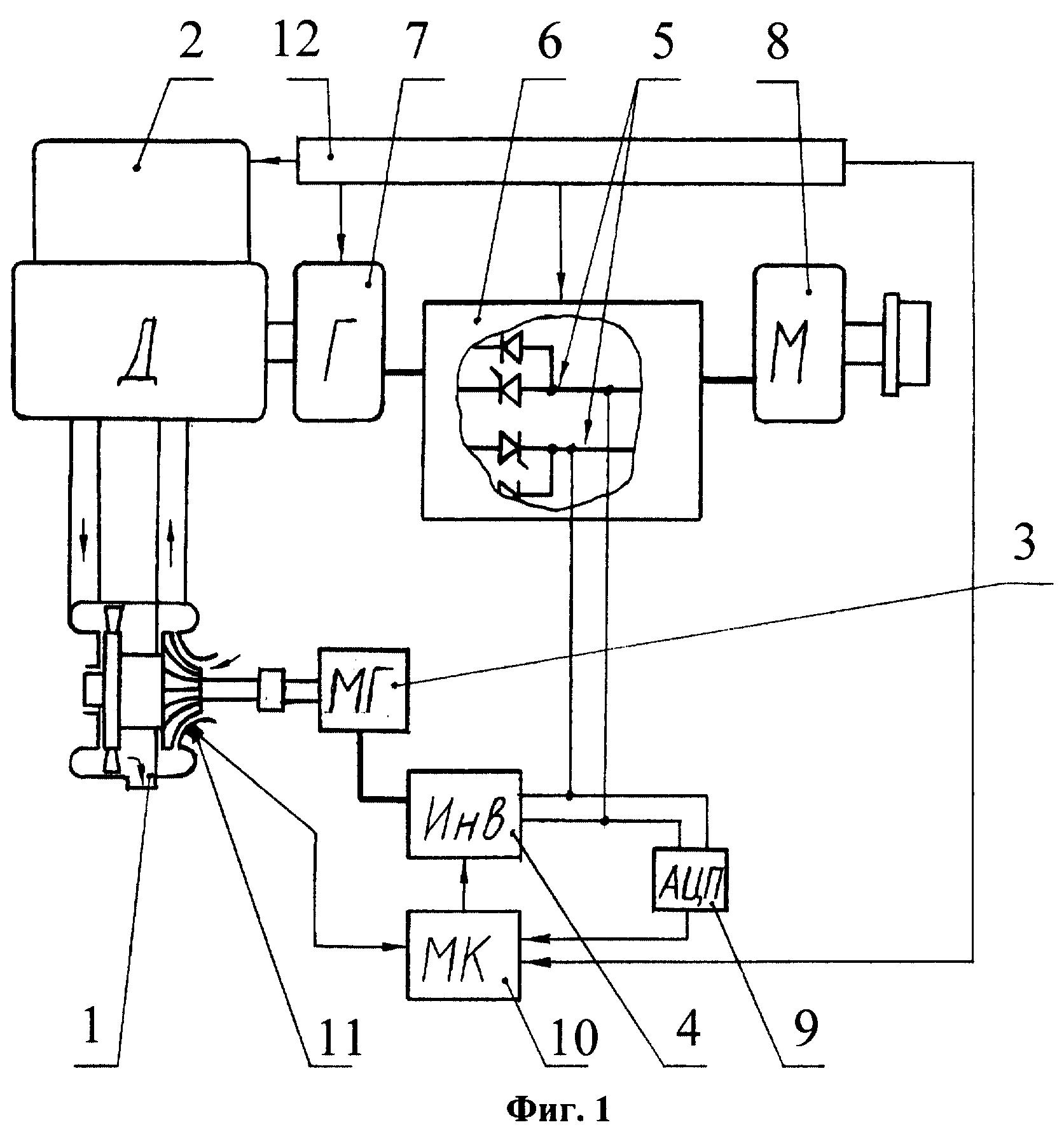 звена электрической цепи передачи, а ее выход соединен с микропроцессорным контроллером. 2. Система управляемого турбонаддува дизельного двигателя по п. 1, отличающаяся тем,