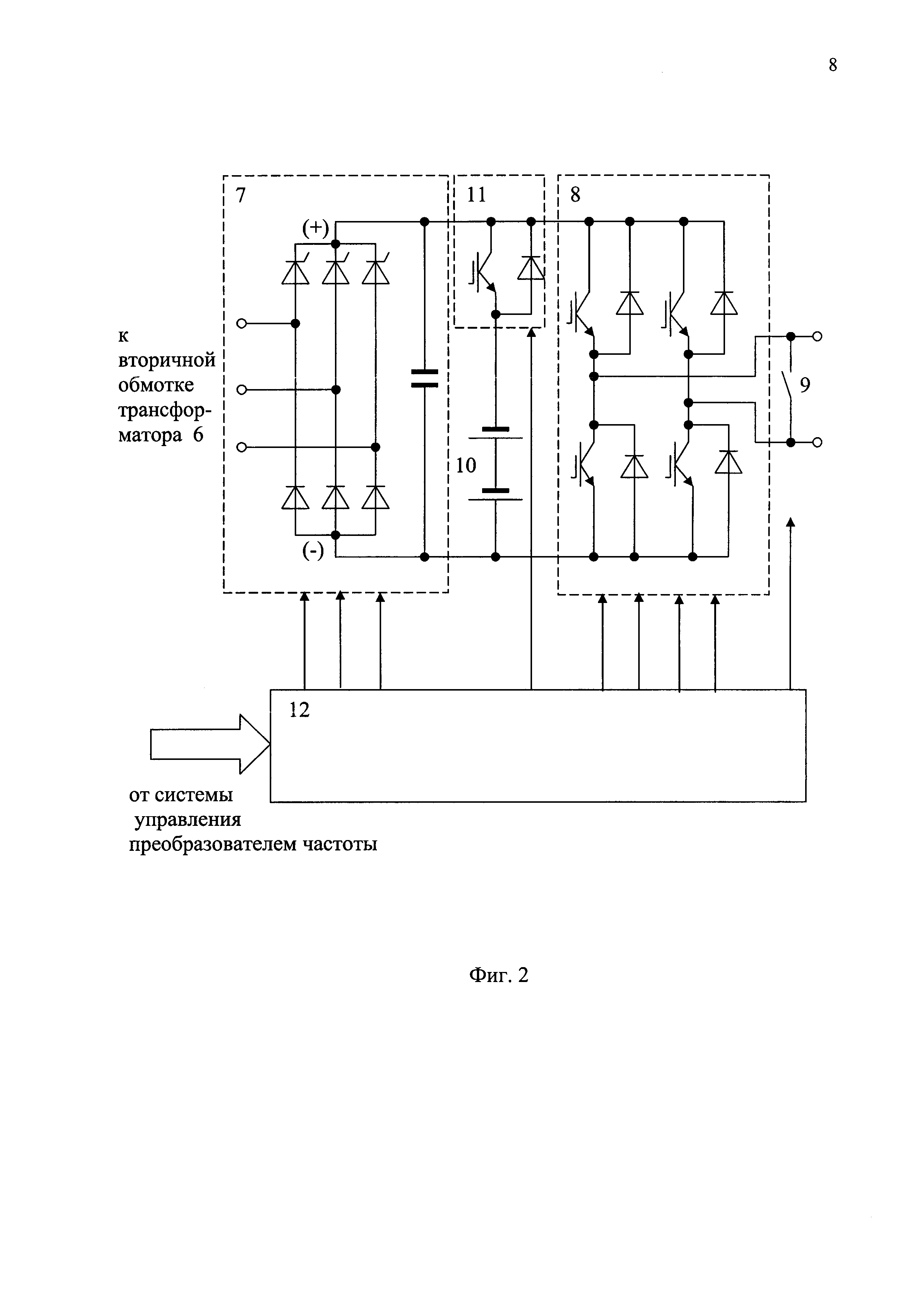 Область техники Изобретение относится к электротехнике и может быть применено в многокаскадных высоковольтных преобразователях частоты, фазы которых состоят из группы последовательно соединенных силовых преобразовательных ячеек. Уровень техники Известны многокаскадные высоковольтные преобразователи частоты, содержащие многообмоточный силовой трансформатор, к вторичным обмоткам которого в каждой фазе преобразователя подключены входы последовательно соединенных однофазных ячеек, каждая из которых содержит управляемый выпрямитель, инвертор напряжения с широтно-мпульсной модуляцией, выход которого шунтирован коммутатором, и блок управления [RU 85275, RU 2289191, RU 2397597]. Недостатком указанных аналогов является нестабильность потребляемой из сети электроэнергии, напрямую зависящей от колебаний нагрузки преобразователя, которая может значительно различаться, например, в дневное и ночное время. В качестве прототипа может быть выбран патент RU 2397597. Сущность изобретения Технический результат изобретения - уменьшение колебаний электроэнергии, потребляемой преобразователем из сети при изменениях его нагрузки. Заявляемый высоковольтный преобразователь частоты содержит многообмоточный силовой трансформатор, к вторичным обмоткам которого в каждой фазе преобразователя частоты подключены входы последовательно соединенных однофазных ячеек, каждая из которых содержит управляемый выпрямитель, инвертор напряжения с широтно-мпульсной модуляцией, выход которого шунтирован первым коммутатором, и блок управления. Отличие заявляемого преобразователя частоты состоит в том, что в каждой его фазе по меньшей мере одна однофазная ячейка снабжена накопителем электроэнергии, который через второй коммутатор подключен к выходу выпрямителя, а блок управления выполнен с возможностью перевода указанной ячейки в режим накопления энергии с включенными управляемым выпрямителем, первым и вторым коммутаторами и выключенным инвертором напряжения и в режим выдачи накопленной энергии с выключенным первым коммутатором, выключенным управляемым выпрямителем и включенным вторым коммутатором. Это позволяет получить указанный технический результат, практически сохранив среднюю (например, среднесуточную) величину потребляемой из сети электроэнергии. Осуществление изобретения На фиг. 1 приведена блок-схема предлагаемого высоковольтного трехфазного преобразователя частоты, на фиг. 2 - схема его однофазной силовой ячейки, снабженной накопителем электроэнергии. На фиг. 1 показаны последовательно соединенные в каждой фазе (А, В и С) трехфазного преобразователя однофазные ячейки 1-5, обозначения которых снабжены соответствующим индексом фазы. Входы всех ячеек 1-5 подключены к вторичным обмоткам многообмоточного силового трансформатора 6. Преобразователь частоты имеет систему управления (на фиг. 1 не показана). Каждая однофазная ячейка 1-5 содержит (фиг. 2) управляемый выпрямитель 7, который получает трехфазное питание от отдельной группы вторичных обмоток трансформатора 6, соединенных в треугольник. К выходу управляемого выпрямителя 7 подключен инвертор напряжения с широтно-импульсной модуляцией. Выход инвертора 8 шунтирован первым коммутатором 9. В каждой из фаз А, В и С преобразователя часть однофазных ячеек (по меньшей мере одна ячейка, как 