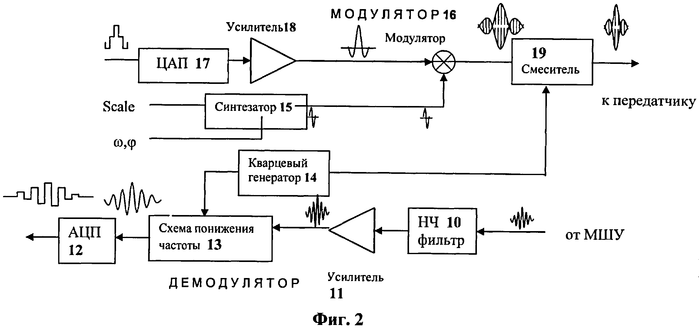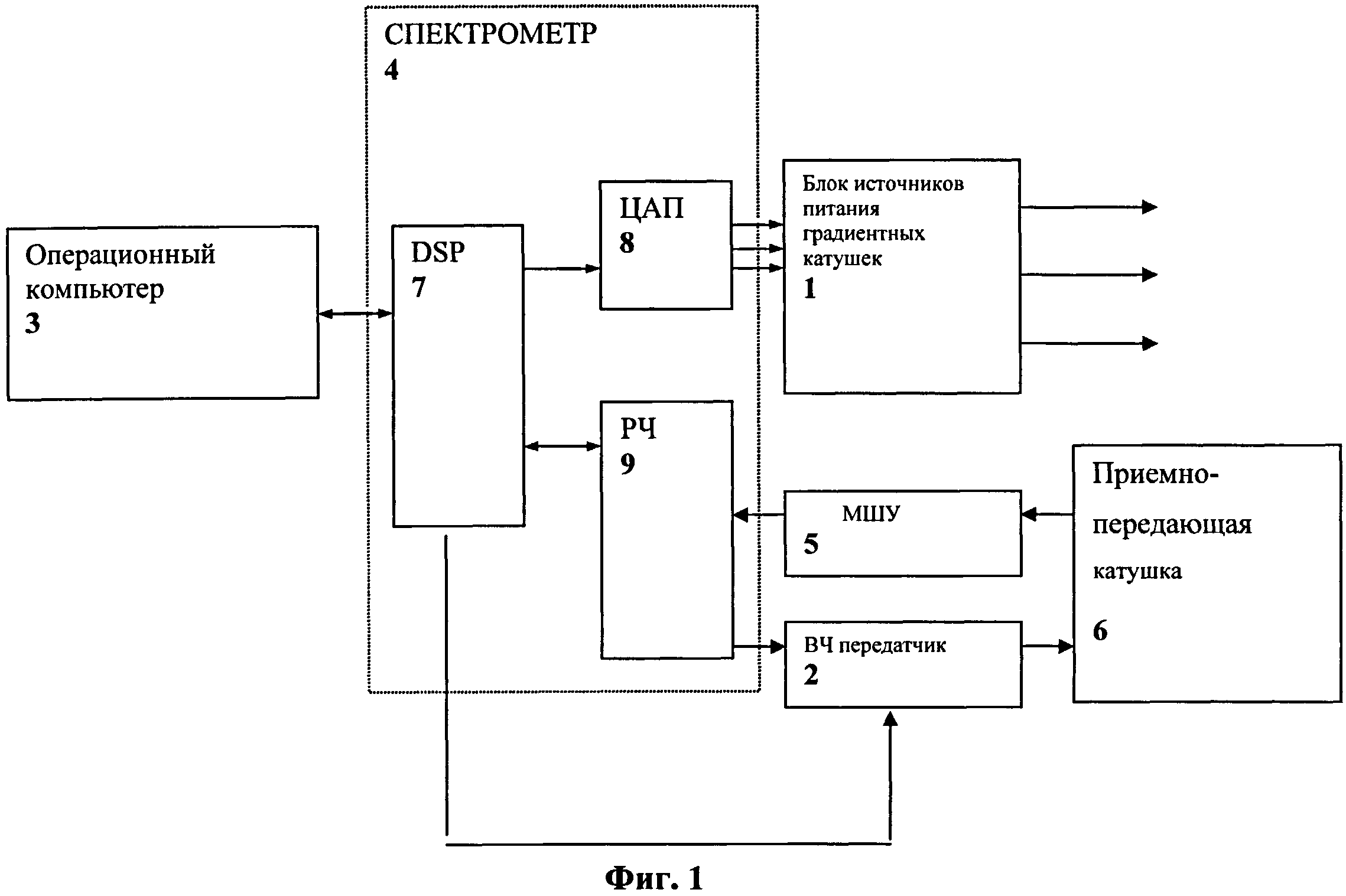 1. Ортопедический магнитно-резонансный томограф, содержащий блок источников питания градиентных катушек, высокочастотный передатчик, операционный компьютер, спектрометр, малошумящий усилитель, передающую и приемную радиочастотные катушки, при этом выходы спектрометра соединены со входами источников питания градиентных катушек и входом высокочастотного передатчика, а вход - с выходом малошумящего усилителя, вход которого соединен с выходом приемной радиочастотной катушки, а вход передающей радиочастотной катушки соединен с выходом высокочастотного передатчика, отличающийся тем, что спектрометр выполнен в виде трех печатных плат - платы сигнального процессора, платы цифроаналогового преобразователя градиентов и радиочастотной платы, размещаемых в системном блоке операционного компьютера, управляющий вход высокочастотного передатчика соединен с цифровым выходом платы сигнального процессора, приемная часть радиочастотной платы содержит кварцевый генератор, соединенный со схемой понижения частоты, аналогово-цифровой преобразователь с частотой оцифровки f>fв/4, где fв - частота высшей гармоники выходного сигнала схемы понижения частоты, а передающая часть радиочастотной платы содержит цифровой синтезатор с возможностью модуляции по фазе и частоте, модулятор и смеситель, второй вход которого соединен с кварцевым генератором, а выход - со входом высокочастотного передатчика, при этом передающая и приемная радиочастотные катушки совмещены в одной приемопередающей катушке, снабженной схемой переключения с передачи на прием и обратно. 2. Томограф по п.1, отличающийся тем, что второй цифровой выход платы сигнального процессора соединен с его цифровым входом через резистор и конденсатор, смонтированный в схеме радиочастотной катушки.