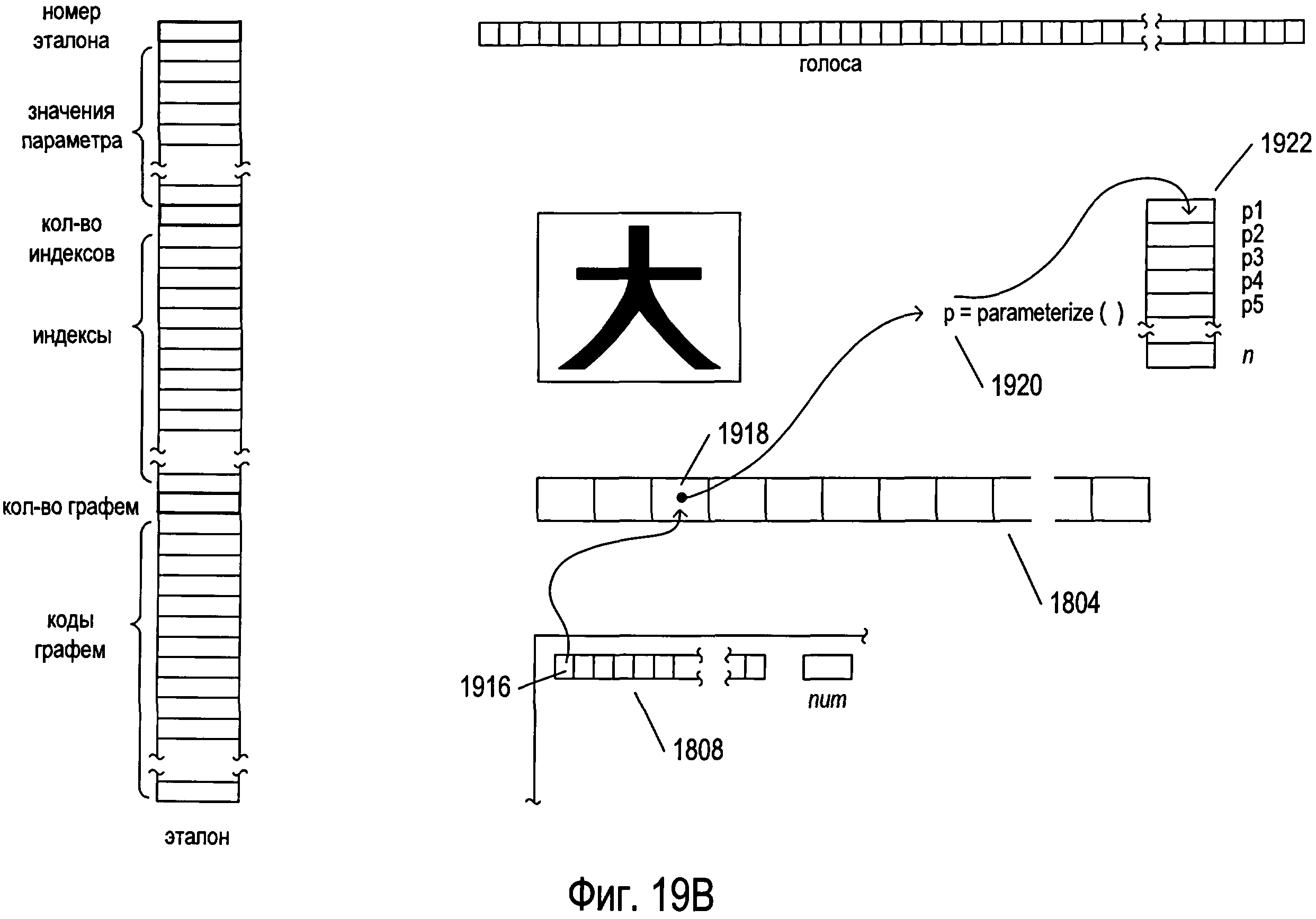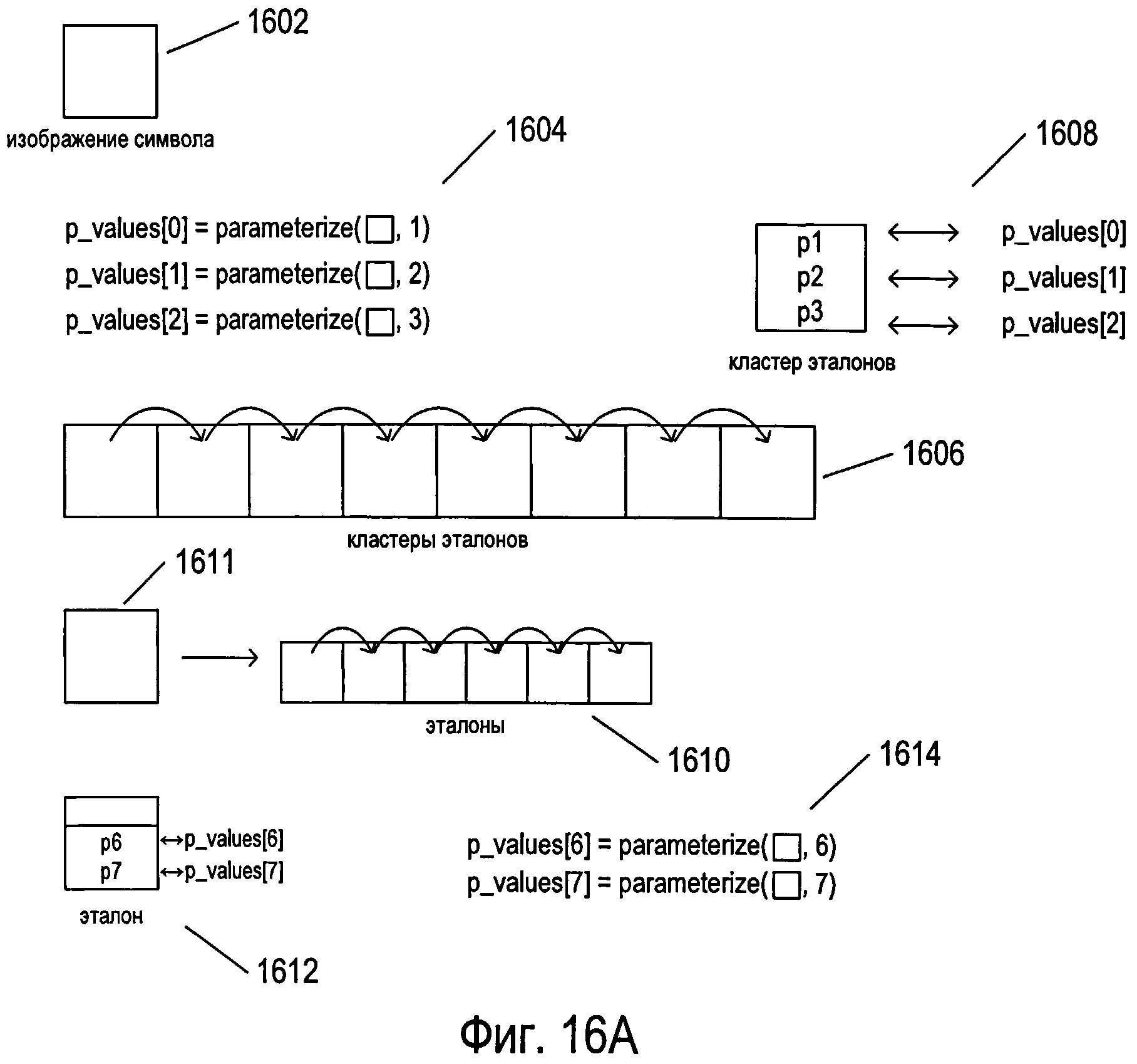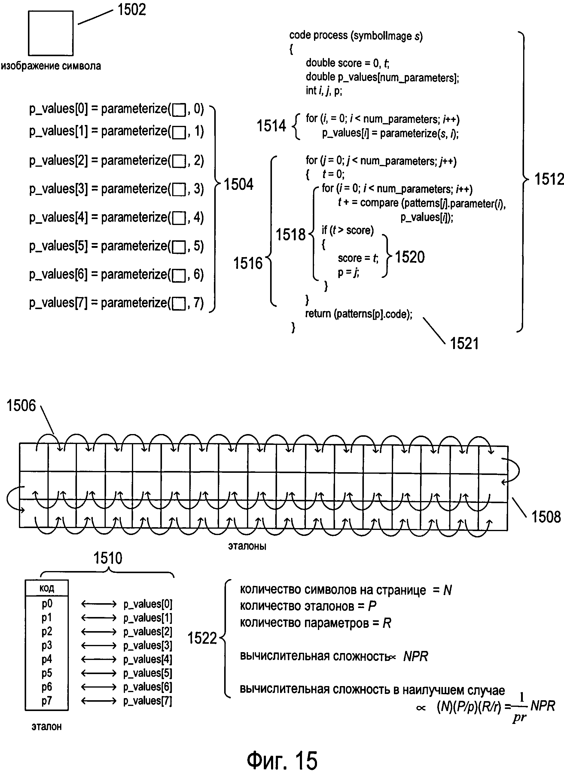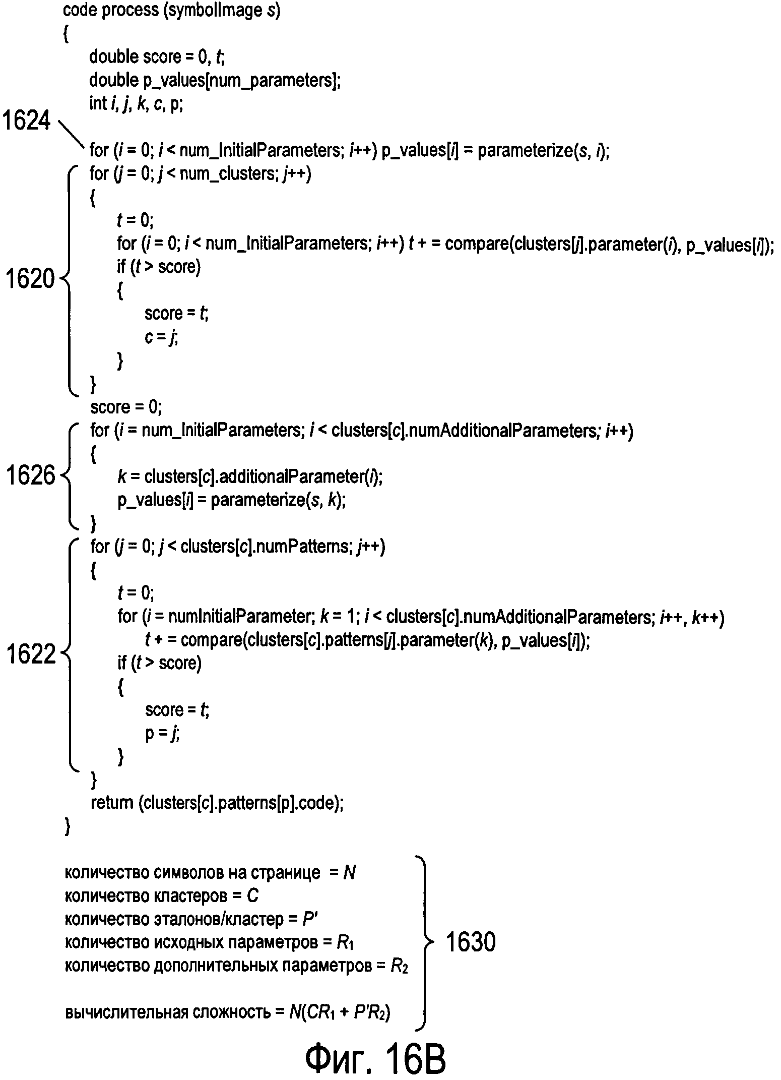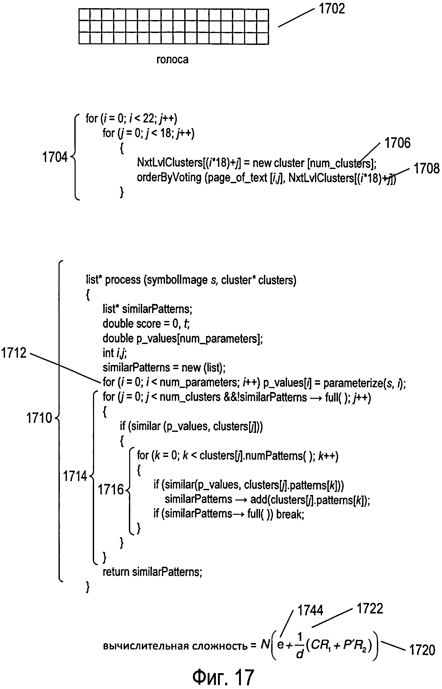 1722. Существует, конечно, штраф за начальную предварительную обработку, представленный коэффициентом «е» 1744. Однако, как указывалось выше, количество обрабатываемых изображений символов N по существу значительно меньше значения параметров P или Р′ для таких языков, как китайский, японский и корейский, и, следовательно, третий способ реализации подпрограммы «process» обеспечивает значительное снижение вычислительной сложности по сравнению как с первым, так и со вторым способами реализации, рассмотренными выше. Что более важно, третий способ реализации подпрограммы «process» гарантирует просмотр всех кластеров, пока не будет обнаружено некоторое максимальное количество потенциально соответствующих символов. Когда порог сходства для кластеров имеет относительно низкое значение, а порог сходства для эталонов имеет относительно высокое значение, существует очень большая вероятность, что список потенциально соответствующих символов, возвращаемый подпрограммой «process», будет включать в себя именно тот символ, который наиболее точно соответствует входному изображению символа.