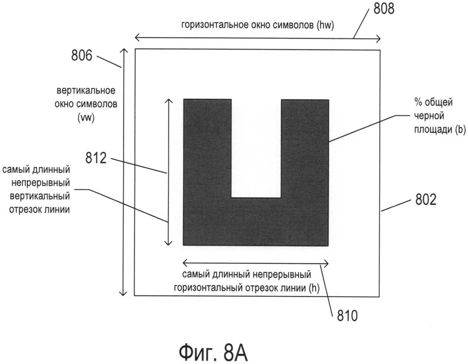 , 908; (4) количество внутренних вертикальных полос, vs, 910; (5) количество внутренних горизонтальных полос, hs, 912; (6) общее количество внутренних вертикальных и горизонтальных полос, vs+hs, 914; и (7) отношение самого длинного непрерывного вертикального отрезка к самому длинному непрерывному горизонтальному отрезку,