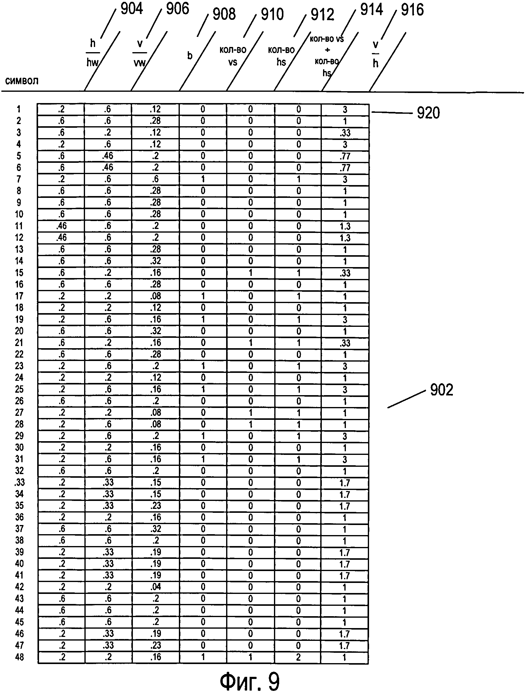 , 916. Как и следовало ожидать, в первой строке 920 таблицы 902, представленной на фигуре 9, первый символ множества (606 на фигуре 6) представляет собой вертикальную черту, и численное значение параметра