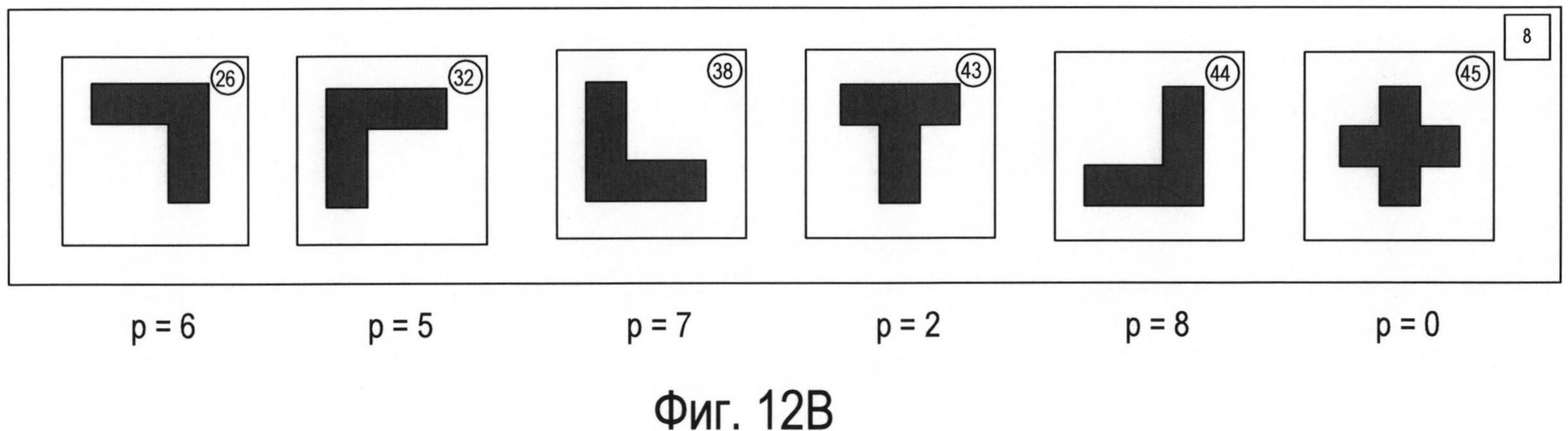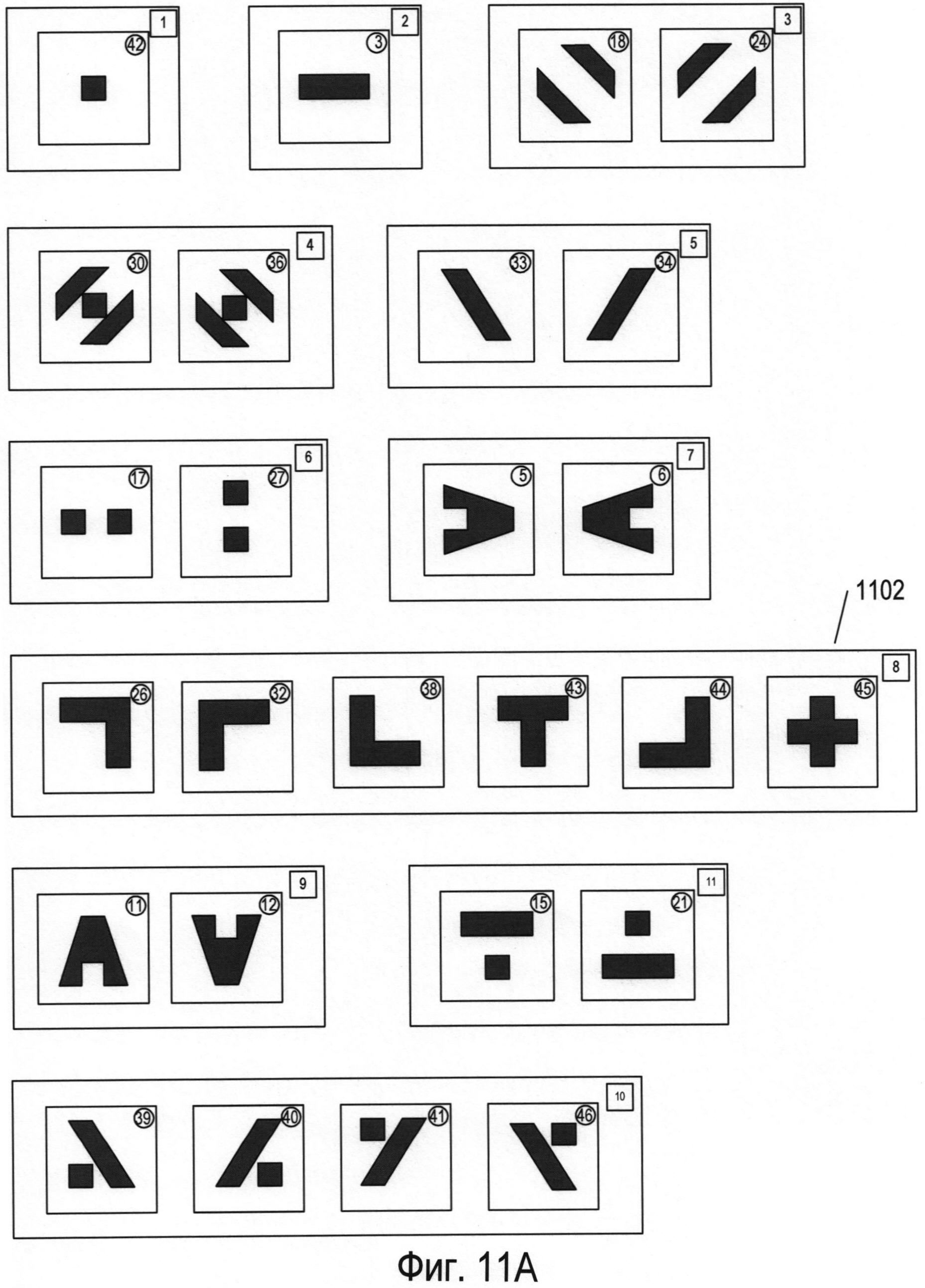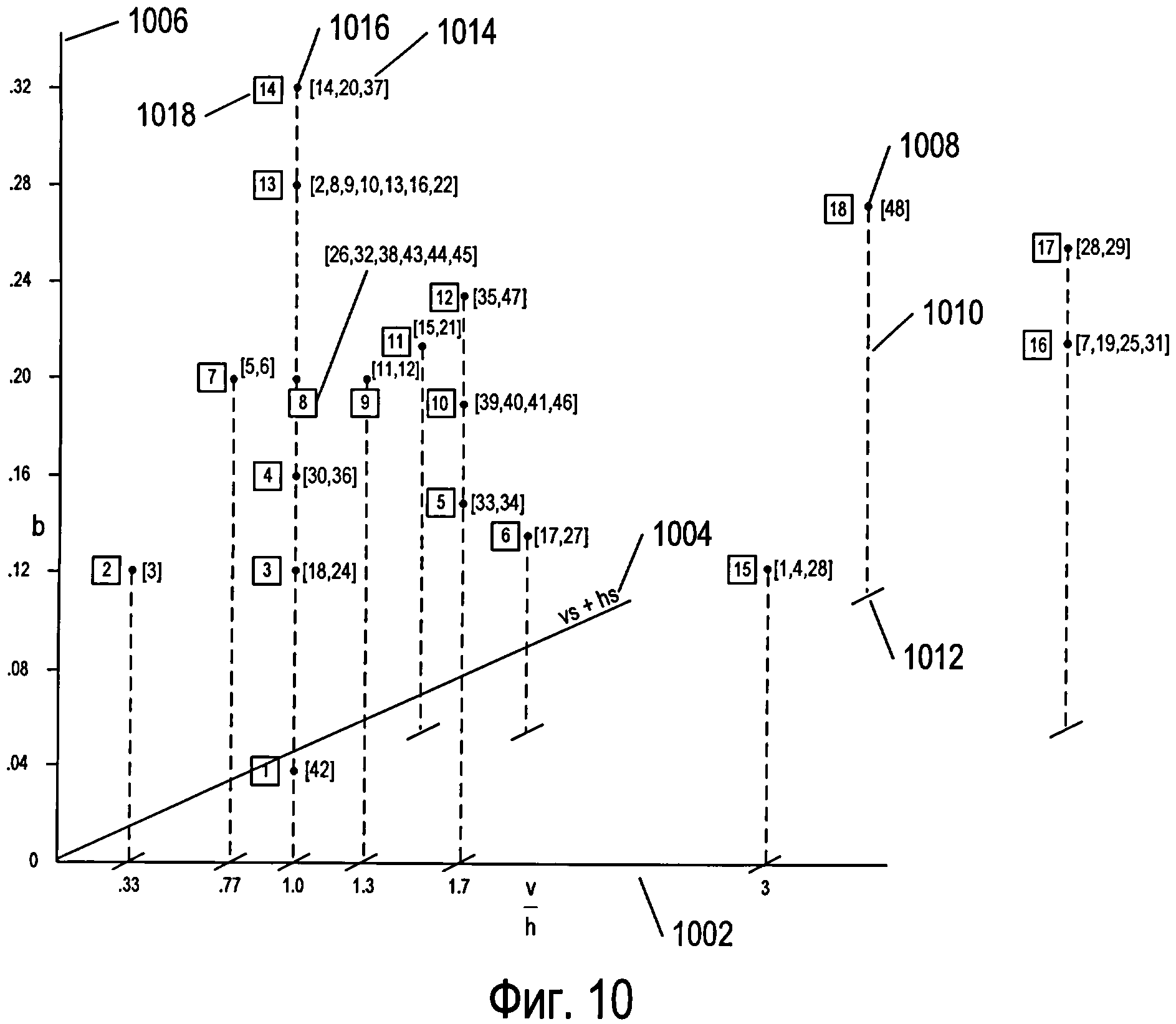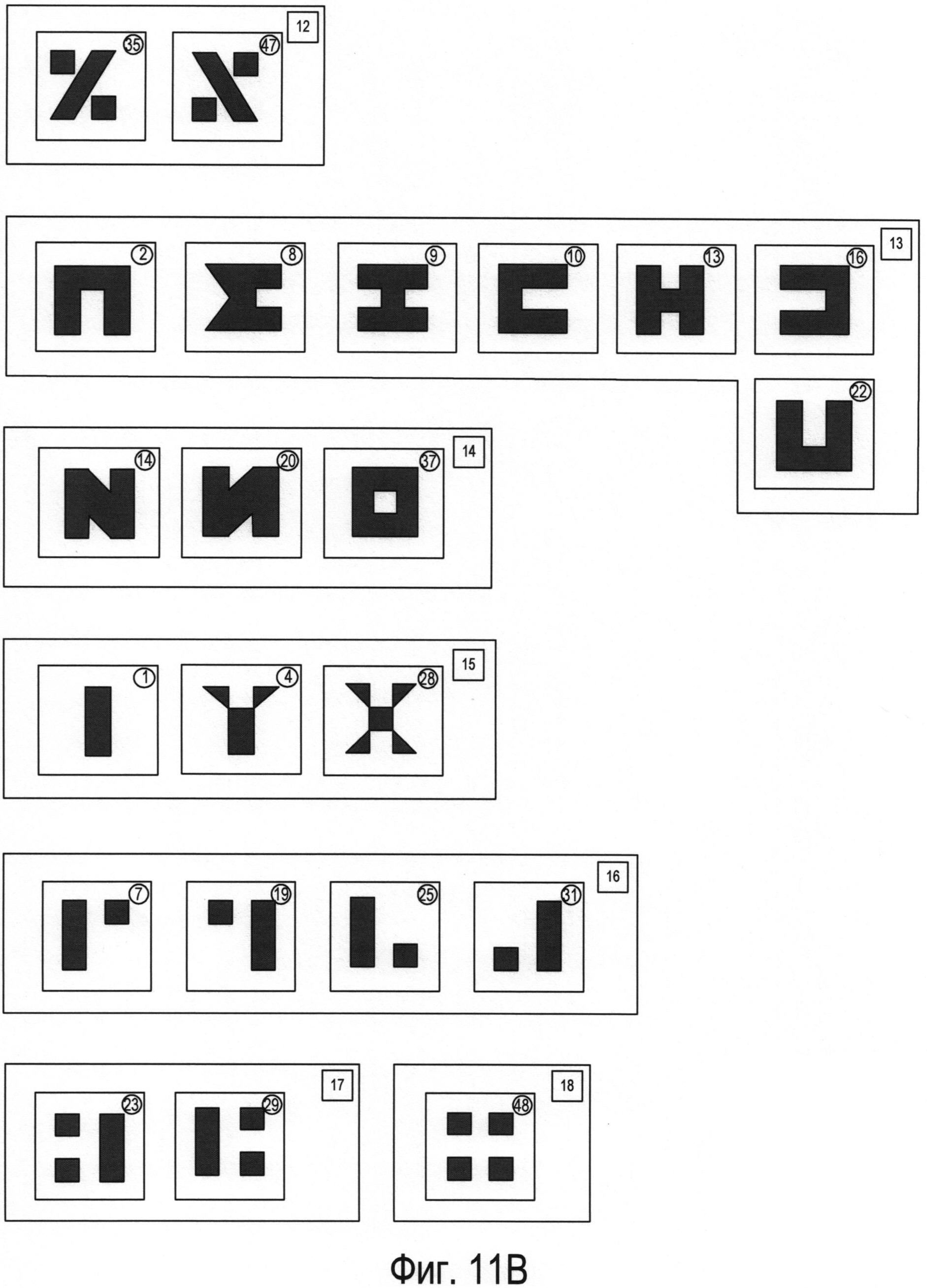 (916 на фигуре 9), вторая горизонтальная ось 1004 представляет параметр+hs (914 на фигуре 9), а третья вертикальная ось 1006 представляет параметр b (908 на фигуре 9). На график нанесены 18 различных точек (таких как нанесенная точка 1008), каждая из которых представлена в виде небольшого черного диска с вертикальной проекцией на горизонтальную плоскость, проходящую через оси 1002 и 1004; эта проекция представлена в виде вертикальной пунктирной линии, такой как вертикальная пунктирная линия 1010, соединяющая точку 1008 с ее проекцией на горизонтальную плоскость 1012. Код, или номер последовательности, символов, которые соответствуют определенной точке на графике, представлен в скобках справа от соответствующей точки. Например, символы 14, 20 и 37 (1014) соответствуют одной точке 1016 с координатами (1, 0, 0, 32) относительно осей 1002, 1004 и 1006. Каждая точка связана с номером части или кластера, который указан в небольшом прямоугольнике слева от точки. Например, точка 1016 связана с кластером под номером «14» 1018. На фигурах 11А-В показаны символы, содержащиеся в каждом из кластеров, представленных точками трехмерного пространства, изображенного на фигуре 10. Рассмотрев символы, входящие в состав этих кластеров или частей, можно легко заметить, что три параметра, используемые для распределения символов в трехмерном пространстве, представленном на фигуре 10, эффективно разбивают 48 символов, используемых в качестве примера, на связанные множества символов.