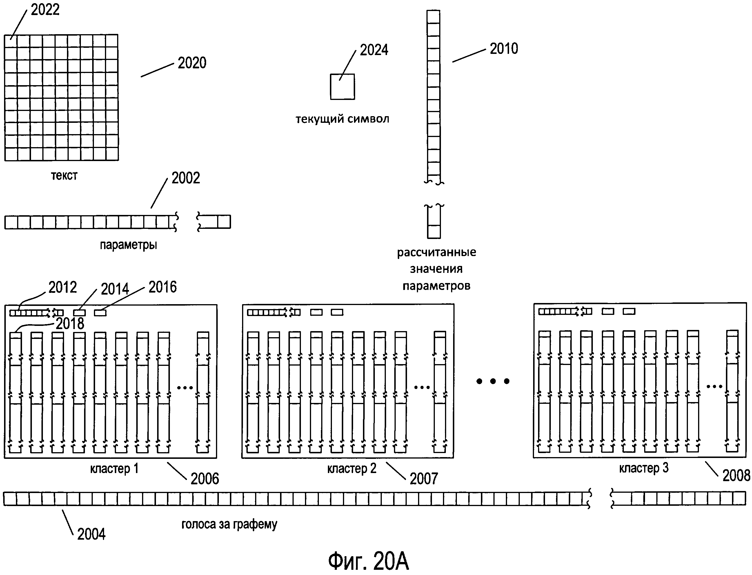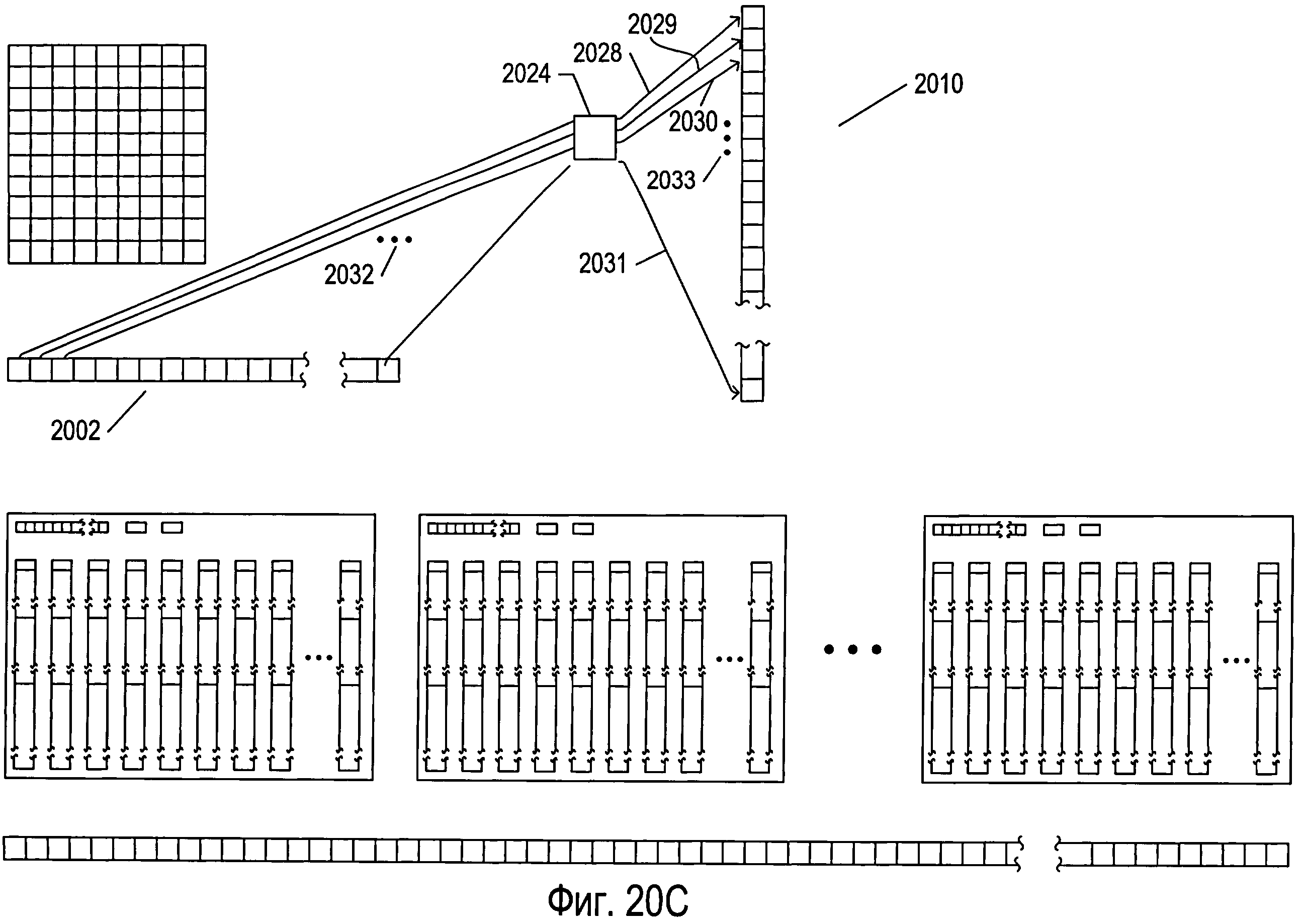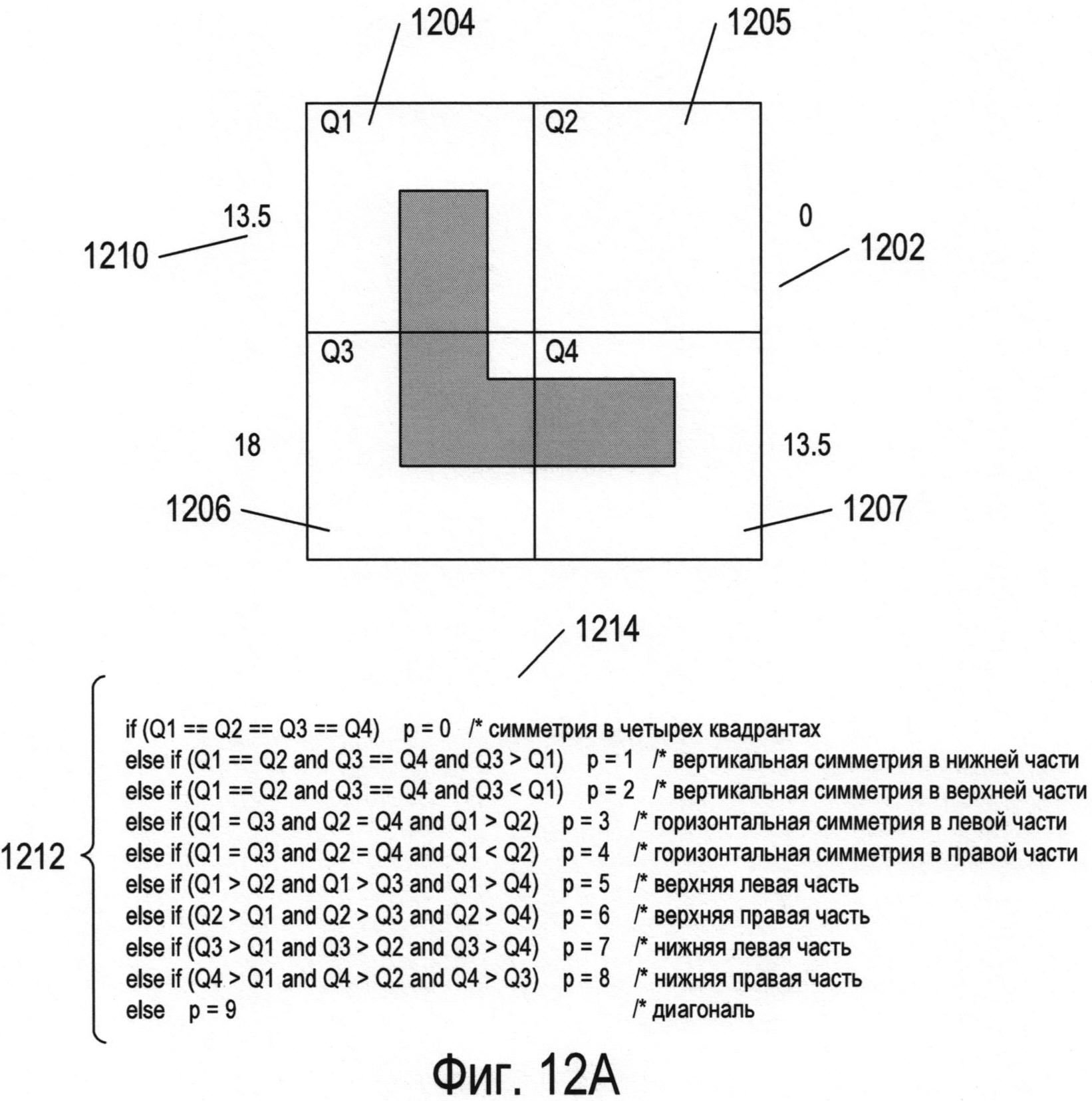 (916 на фигуре 9), вторая горизонтальная ось 1004 представляет параметр+hs (914 на фигуре 9), а третья вертикальная ось 1006 представляет параметр b (908 на фигуре 9). На график нанесены 18 различных точек (таких как нанесенная точка 1008), каждая из которых представлена в виде небольшого черного диска с вертикальной проекцией на горизонтальную плоскость, проходящую через оси 1002 и 1004; эта проекция представлена в виде вертикальной пунктирной линии, такой как вертикальная пунктирная линия 1010, соединяющая точку 1008 с ее проекцией на горизонтальную плоскость 1012. Код, или номер последовательности, символов, которые соответствуют определенной точке на графике, представлен в скобках справа от соответствующей точки. Например, символы 14, 20 и 37 (1014) соответствуют одной точке 1016 с координатами (1, 0, 0, 32) относительно осей 1002, 1004 и 1006. Каждая точка связана с номером части или кластера, который указан в небольшом прямоугольнике слева от точки. Например, точка 1016 связана с кластером под номером «14» 1018. На фигурах 11А-В показаны символы, содержащиеся в каждом из кластеров, представленных точками трехмерного пространства, изображенного на фигуре 10. Рассмотрев символы, входящие в состав этих кластеров или частей, можно легко заметить, что три параметра, используемые для распределения символов в трехмерном пространстве, представленном на фигуре 10, эффективно разбивают 48 символов, используемых в качестве примера, на связанные множества символов.