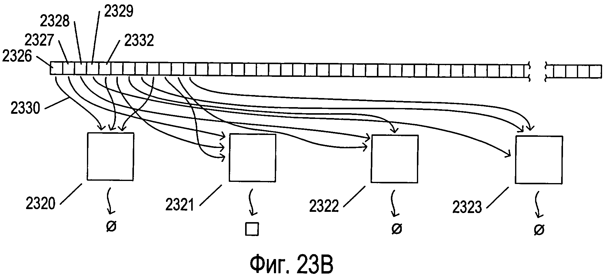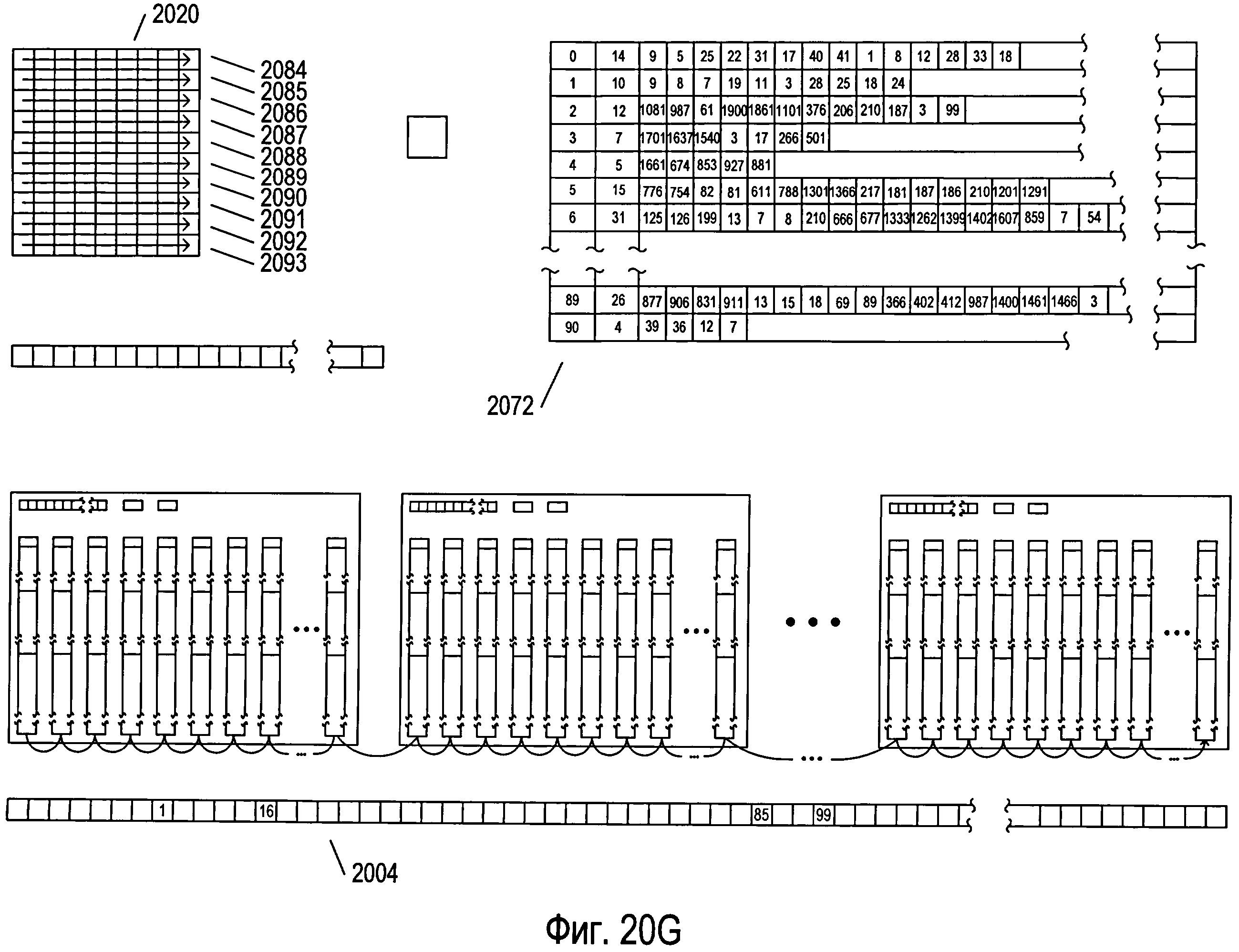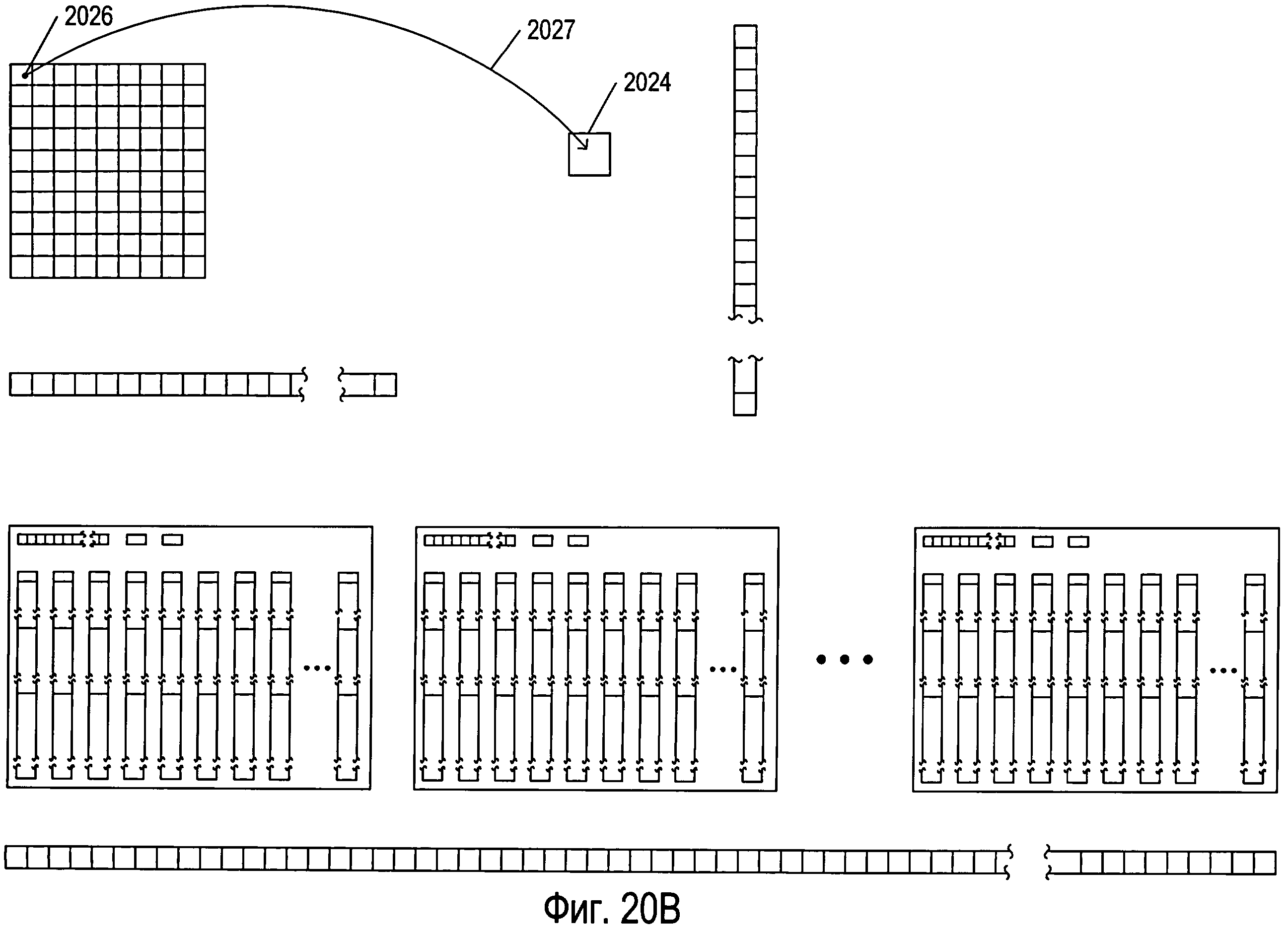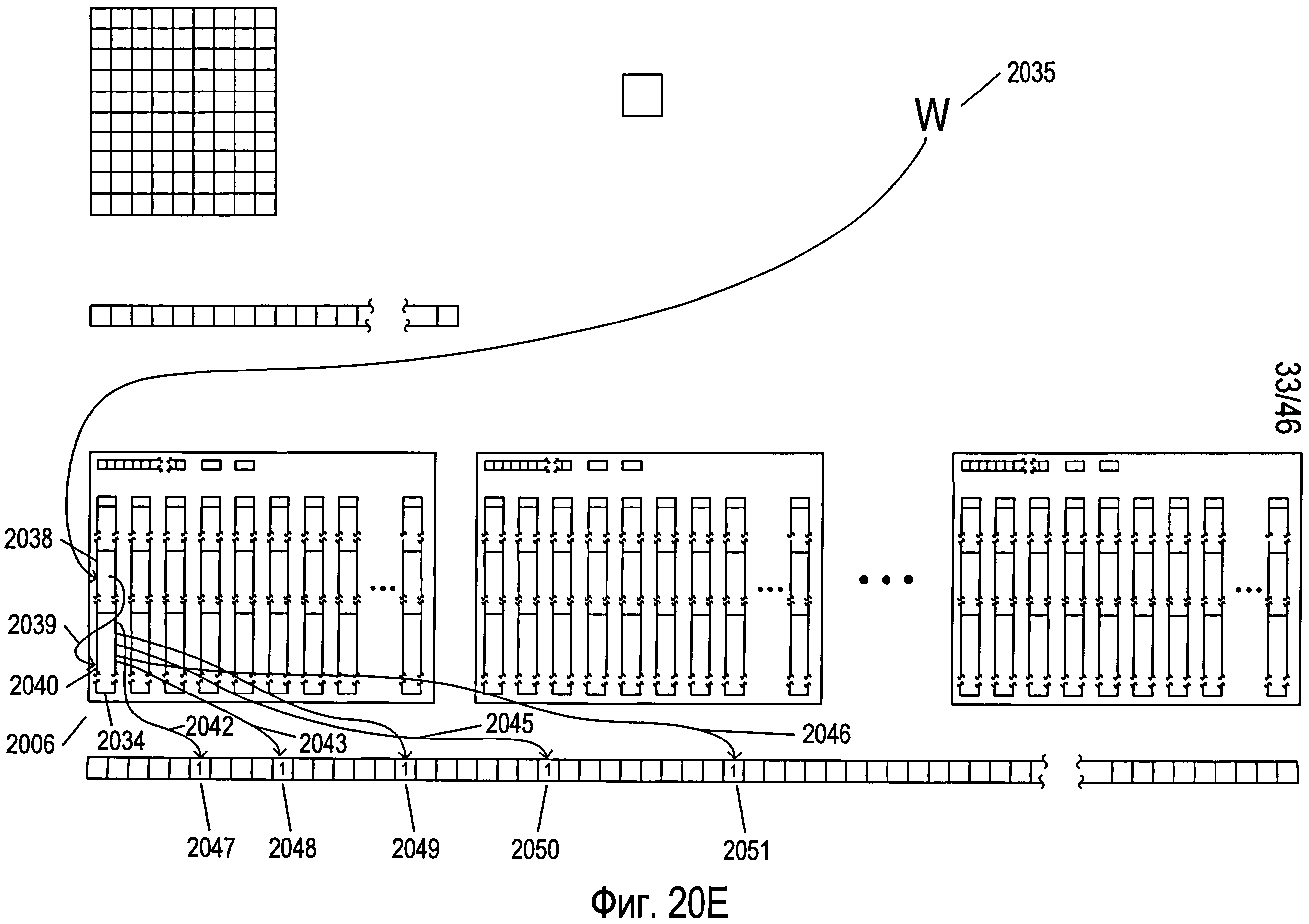 (916 на фигуре 9), вторая горизонтальная ось 1004 представляет параметр+hs (914 на фигуре 9), а третья вертикальная ось 1006 представляет параметр b (908 на фигуре 9). На график нанесены 18 различных точек (таких как нанесенная точка 1008), каждая из которых представлена в виде небольшого черного диска с вертикальной проекцией на горизонтальную плоскость, проходящую через оси 1002 и 1004; эта проекция представлена в виде вертикальной пунктирной линии, такой как вертикальная пунктирная линия 1010, соединяющая точку 1008 с ее проекцией на горизонтальную плоскость 1012. Код, или номер последовательности, символов, которые соответствуют определенной точке на графике, представлен в скобках справа от соответствующей точки. Например, символы 14, 20 и 37 (1014) соответствуют одной точке 1016 с координатами (1, 0, 0, 32) относительно осей 1002, 1004 и 1006. Каждая точка связана с номером части или кластера, который указан в небольшом прямоугольнике слева от точки. Например, точка 1016 связана с кластером под номером «14» 1018. На фигурах 11А-В показаны символы, содержащиеся в каждом из кластеров, представленных точками трехмерного пространства, изображенного на фигуре 10. Рассмотрев символы, входящие в состав этих кластеров или частей, можно легко заметить, что три параметра, используемые для распределения символов в трехмерном пространстве, представленном на фигуре 10, эффективно разбивают 48 символов, используемых в качестве примера, на связанные множества символов.