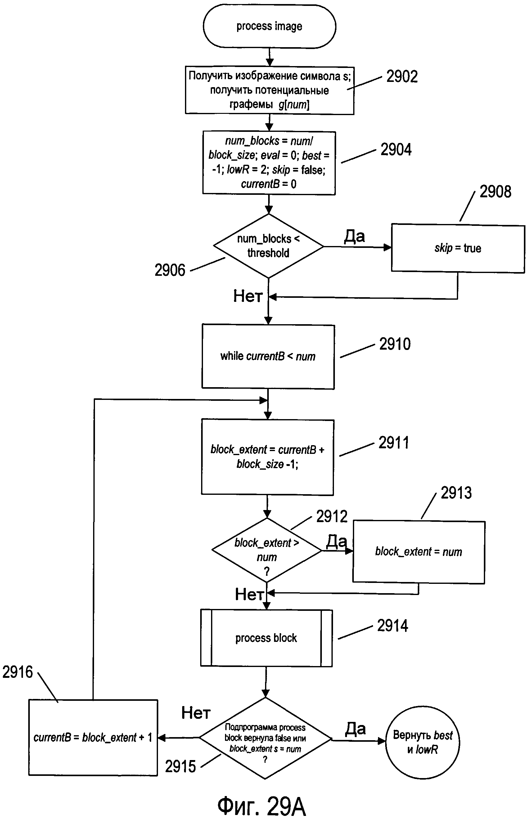 последующую оценку каждой последовательной группы из одной или более потенциальных графем относительно возможного изображения символа, обновление указателя на наилучшую из наблюдаемых потенциальных графем и указателя на значение сравнения, сформированного путем сравнения наилучшей из наблюдаемых потенциальных графем с возможным изображением символа; причем наилучшая из наблюдаемых потенциальных графем содержит потенциальную графему, которая при сравнении с возможным изображением символа формирует значение сравнения, показывающее, что наилучшая из наблюдаемых потенциальных графем соответствует изображению символа по меньшей мере настолько точно, насколько и любая другая потенциальная графема, оцененная относительно возможного изображения символа.
