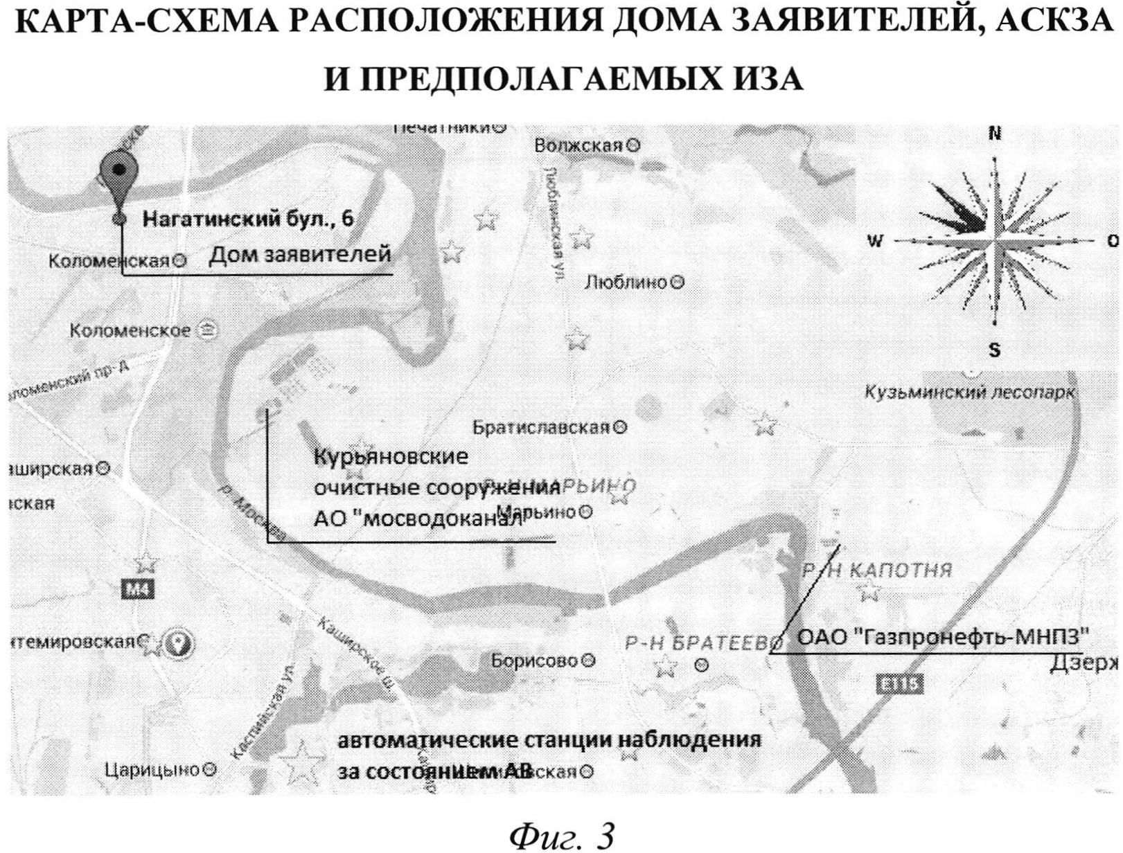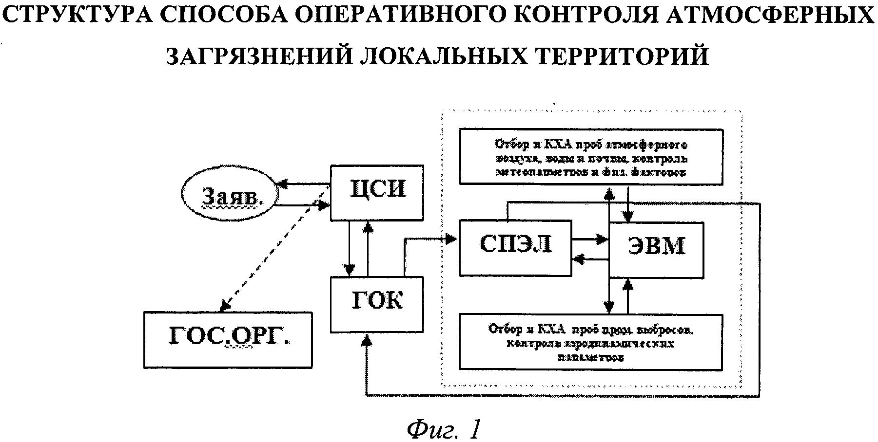 Изобретение относится к области охраны окружающей среды и может быть использовано в системе городского экологического мониторинга для оперативного выявления на локальных территориях источников возможного загрязнения атмосферного воздуха и других объектов окружающей природной среды. Целью изобретения является создание группы последовательных действий, выполнение которых позволит достоверно определять источник сверхнормативного загрязнения атмосферного воздуха и других объектов окружающей природной среды на локальной городской территории. Известен способ организации наблюдений за уровнем загрязнения атмосферы с использованием постов трех категорий (стационарного, передвижного, маршрутного) с ограниченным количеством контролируемых параметров, изложенный в Руководящем документе РД 52.04.186-89. Руководство по контролю загрязнения атмосферы [1]. Однако получаемая с использованием этого способа информация отражает лишь фактическое состояние воздуха в районе установки поста наблюдения и может быть использована лишь для констатации существующего положения, а не для выявления или установления источника несанкционированных выбросов специфических веществ. Известны способы организации и проведения экологического контроля промышленных выбросов, изложенные в Общесоюзном нормативном документе «Руководство по контролю источников загрязнения атмосферы. ОНД-90» [2], методических рекомендациях по отбору проб при определении концентраций вредных веществ: (газов и паров) ПНД Ф 12.1.1-99 [3] и взвешенных частиц (пыли) ПНД Ф 12.1.2-99 [4], заключающиеся в разовых (или периодических) отборах проб и дополнительном при этом контроле термодинамических параметров потока в источнике загрязнения атмосферы: температуры и влажности, скорости движения газа, давления-разрежения в газоходе и др. Способы реализуются с помощью различных технических систем, включающих пробоотборные зонды, фильтры, магистрали транспортировки газа, устройств охлаждения, аспираторов, газоанализаторов и др. Недостатком этих способов является периодичность контроля, отсутствие одновременных замеров атмосферы в подфакельной зоне и моделирования процессов рассеивания вредных веществ, позволяющего решать обратную задачу: определение вклада отдельных источников в общий уровень загрязнения воздуха (а также воды и почвы) в городском микрорайоне. Прототипом предлагаемого способа оперативного контроля атмосферных загрязнений локальных территорий является «Система экологического мониторинга атмосферного воздуха промышленного региона» [5], сущность которой заключается в содержании двух групп датчиков экологического контроля за состоянием среды, средств радиосвязи датчиков второй группы с аппаратурой городской телефонной сети, центрального диспетчерского пункта. Дополнительно в нее введены быстродействующие газовые датчики экологического контроля состояния атмосферы, система GPS, мобильная телефонная система, установленные на электротранспортных единицах, а также метеостанция, группа датчиков замеров концентраций загрязняющих веществ непосредственно с источников загрязнения, центр моделирования, центр обработки и сравнения данных, причем быстродействующие газовые датчики экологического контроля состояния атмосферы и система GPS соединены посредс