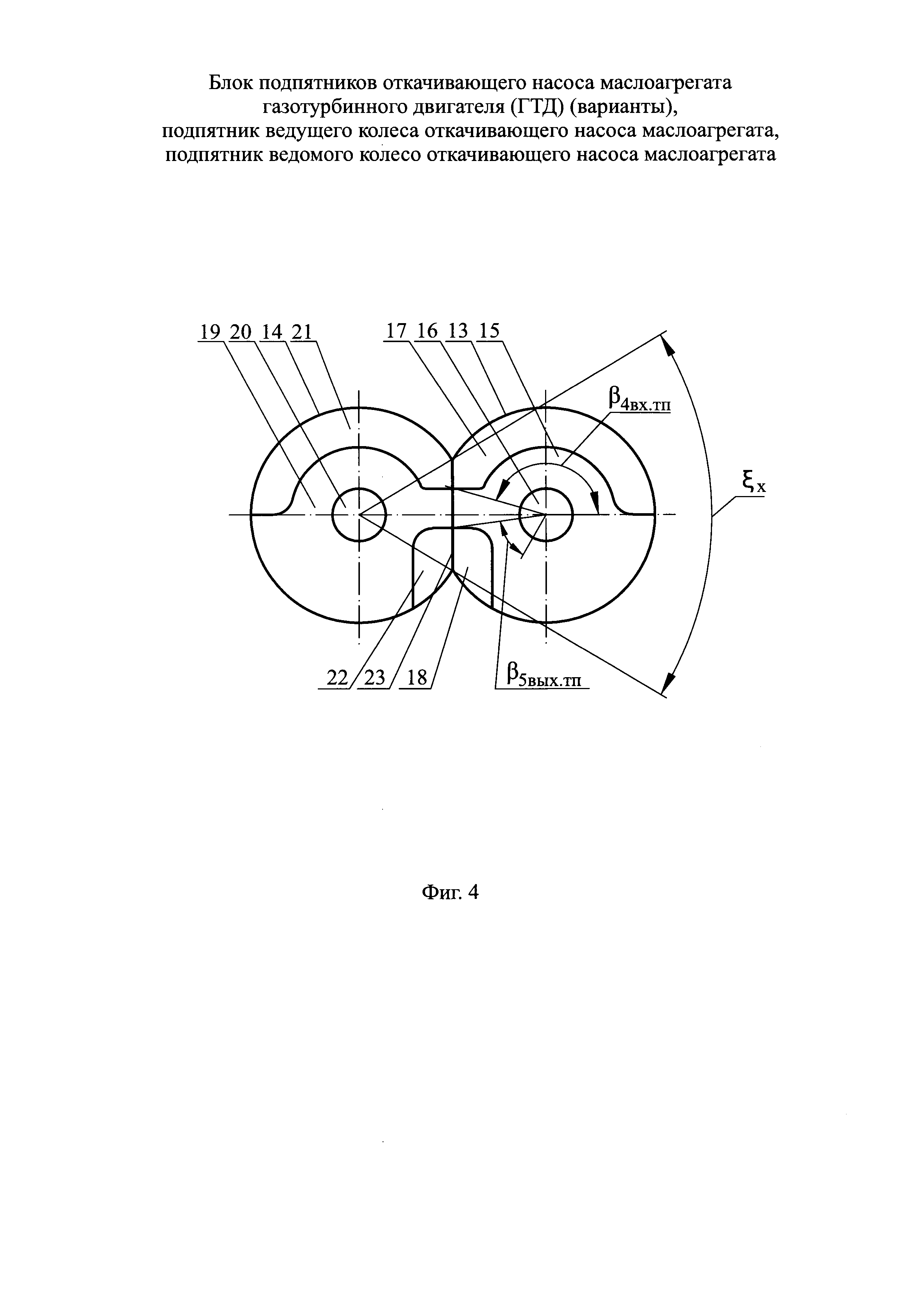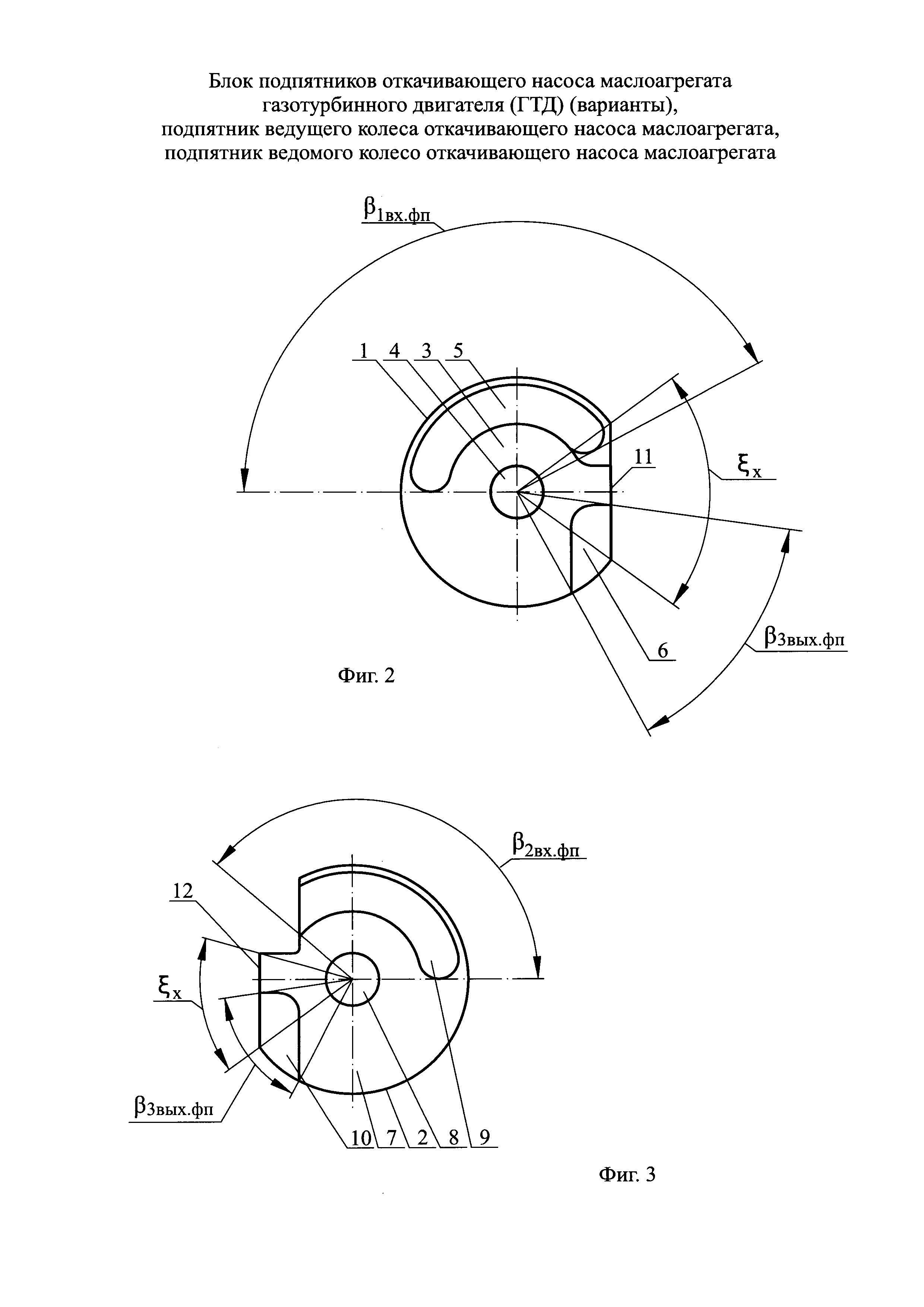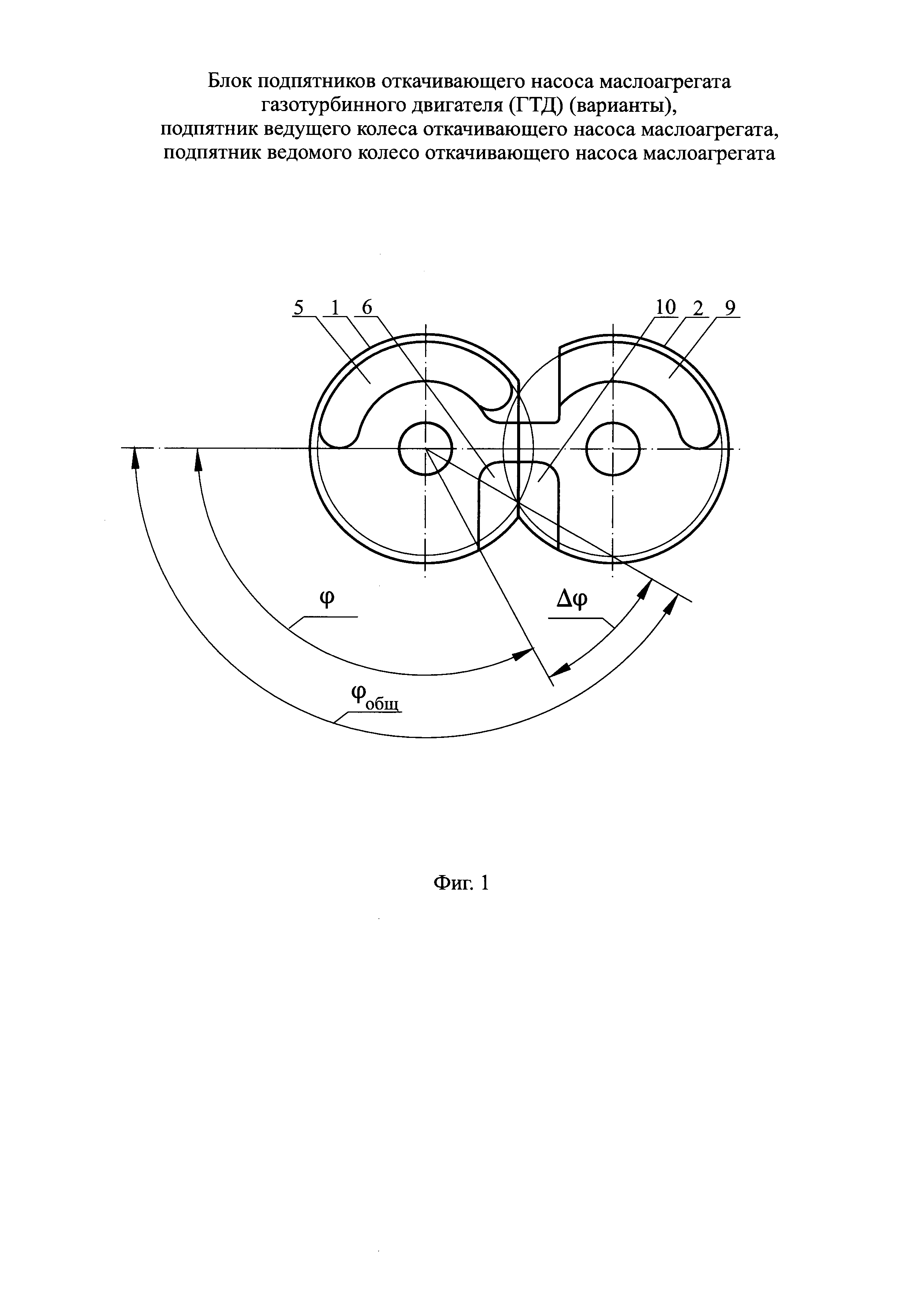 1. Блок подпятников откачивающего насоса (ОН) маслоагрегата (МА) двухвального двухконтурного газотурбинного двигателя (ГТД) газотурбинной установки (ГТУ) газоперекачивающего агрегата (ГПА), имеющего коробку приводов агрегатов (КПА) и маслосистему, включающую магистрали подачи очищенного и охлажденного масла к нагруженным узлам двигателя и откачки отработанного масла в маслобак с фильтром тонкой очистки, характеризующийся тем, что включает два фронтальных подпятника, которые установлены в нижнем корпусе маслоагрегата, выполнены состоящими каждый из осевого диска и наделены входным и выходным каналами, формирующими совместно с соответствующим ведущим и ведомым шестеренными колесами рабочего органа ОН последовательные участки масляного тракта, при этом подпятники выполнены каждый с центральным отверстием, конгруэнтным диаметру соответствующего вала ОН маслоагрегата, конструктивно и гидродинамически адаптированными под рабочие параметры зубьев и межзубных впадин зубчатых венцов ведущего и ведомого шестеренных колес рабочего органа насоса, одновременно экспонируемых в потоке перекачиваемой среды, включая охват входным каналом диска полной высоты и необходимого количества подвергаемых одномоментному заполнению межзубных впадин взаимодействующих шестеренных колес, причем каждый подпятник выполнен в виде усеченного диска с образованием лыски, обеспечивающей в сборе смыкание дисков подпятников по лыскам сегментов в корпусе ОН по смещенным касательным к делительным окружностям зубьев в зубчатых венцах колес рабочего органа насоса, что обеспечивает выход за лыску до половины высоты зуба каждого зубчатого венца в стадии положения на линии центров взаимодействующих шестеренных колес рабочего органа насоса, при этом входной канал подпятника ведущего колеса выполняют в виде сквозного радиально-дугового проема, ограниченного в угловом секторе β1вх.фп, определенном в диапазоне значений β1вх.фп=(2,37÷3,04) [рад], а соответствующий входной канал подпятника ведомого колеса выполняют с частично несквозным радиально-дуговым проемом, ограниченным в угловом секторе β2вх.фп, определенном в диапазоне значений β2вх.фп=(2,18÷2,79) [рад], кроме того диск каждого подпятника имеет дуговую площадку удержания и переноса откачиваемой среды в межзубных впадинах венца шестеренного колеса, определенную в угловом диапазоне ϕобщ. от границы канала заполнения впадин до начала зоны выдавливания откачиваемой среды, ϕобщ.=(ϕ+Δϕ)=(2,22÷3,11) [рад], где ϕ соответствует угловому сектору удержания откачиваемой среды по торцам межзубных впадин венца колеса подпятниками, Δϕ соответствует угловому сектору продолжения удержания в межзубных впадинах избыточным давлением откачиваемой среды на выходе из межзубных впадин шестеренных колес. 2. Блок подпятников откачивающего насоса маслоагрегата по п. 1, отличающийся тем, что выходной канал подпятника ведомого колеса выполнен симметричным относительно выходного канала подпятника ведущего колеса, при этом выходные каналы каждого подпятника выполнены в виде несквозного в осевом направлении проема, ограниченного в угловом секторе β3вых.фп, определенном в диапазоне значений β3вых.фп=(0,77÷1,1) [рад]. 3. Блок подпятников откачивающего насоса маслоагрегата по п. 1, отличающийся тем, что подпятники ведущего и ведо