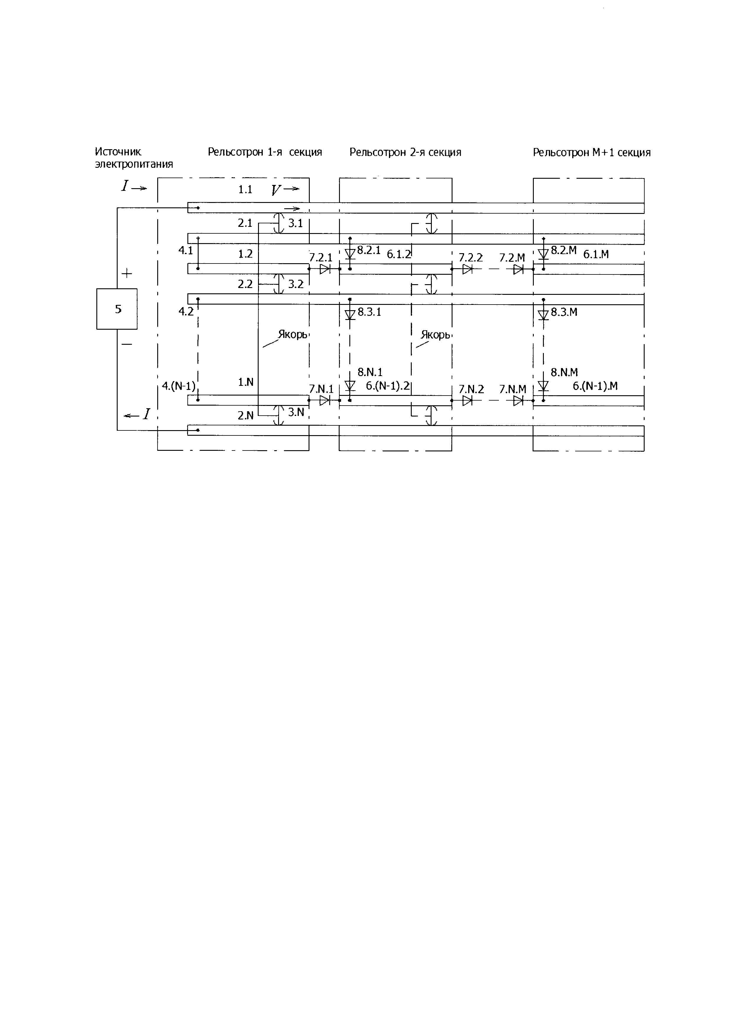 Область техники, к которой относится изобретение Данное изобретение относится к линейным электрическим двигателям и может быть применено для разгона твердого тела (якоря) относительно большой массы. Уровень техники Известен рельсотрон с распределенным вдоль канала вводом энергии [Структура электрической части рельсотрона с распределенным вдоль канала вводом энергии. Коммутация токов индуктивных накопителей / Потоцкий А.П., Халимуллин Ю.А., Крылов М.К., Кузнецов В.В., Савичев В.В., Галанин М.П. // Препринт ГНЦ РФ ТРИНИТИ 0082-А, ЦНИИАТОМИНФОРМ 2001 г. С. 26.], содержащий канал, образованный парой электрически изолированных параллельных рельсов и ускоряемый якорь, содержащий токовую перемычку, скользящую по паре рельсов. Электропитание рельсотрона осуществляется от секционированного индуктивного накопителя энергии. Точки подвода электроэнергии к рельсам от гальванически развязанных секций индуктивного накопителя распределены равномерно вдоль рельсов. Рельсы соединены с секциями индуктивного накопителя через сильноточные коммутаторы. Кроме того, секции индуктивного накопителя соединены между собой и с зарядным устройством сильноточными размыкателями. Подключение секции индуктивного накопителя осуществляется в момент прохождения токовой перемычки якоря точек подключения данной секции. Благодаря переходу части энергии магнитного поля в пройденном участке рельсотрона в объем следующего участка, достигается повышение коэффициента полезного действия [с. 19, рис. 12]. Недостатком такого устройства является усложнение конструкции источника электрической энергии и токопроводов для передачи электрической энергии от источников к ускорительному каналу за счет включения в схему сильноточных коммутаторов. Выбранным за прототип, как наиболее близким по технической сущности и достигаемому техническому результату, является рельсотронный ускоритель (многовитковый рельсотрон) [Рельсотронный ускоритель: пат. 2154890. Рос. Федерация: МПК7 H02N 11/00, H02K 57/00, 33/00 / Полтанов А.Е., Кондратенко А.К., Павлов И.П., Рындин В.Н.; заявитель и патентообладатель Троицкий институт инновационных и термоядерных исследований (РФ) - №98123735/06 заявл. 22.12.1998; опубл. 20.08.2000 Бюл. №23. - 10 с.: 9 ил.], содержащий ускорительный канал, образованный N одинаковыми парами электрически изолированных токопроводящих параллельных рельсов, установленных неподвижно в электроизоляционном корпусе так, что первые рельсы всех пар и вторые рельсы всех пар расположены с изоляционными промежутками соответственно друг над другом стопой, и якорь, содержащий N электрически изолированных друг от друга электропроводных перемычек, каждая из которых установлена на соответствующем изоляторе ускоряемого якоря с возможностью скольжения по соответствующей паре рельсов. Кроме того, содержатся N-1 сериесных электропроводных перемычек, соединяющих на входе вторых рельсов i-й пары с первыми рельсами (i+1)-й пары (где i=1…N-1), а первый рельс первой пары и второй рельс N-й пары выведены для подключения источника электрической энергии. Таким образом, N пар рельсов соединены последовательно (сериесно) неподвижными перемычками, образуя N-витковый рельсотрон. В данном рельсотронном ускорителе используется один источник электрической энергии, что позволяет упростить конструкцию токоподвода и снизить потери э