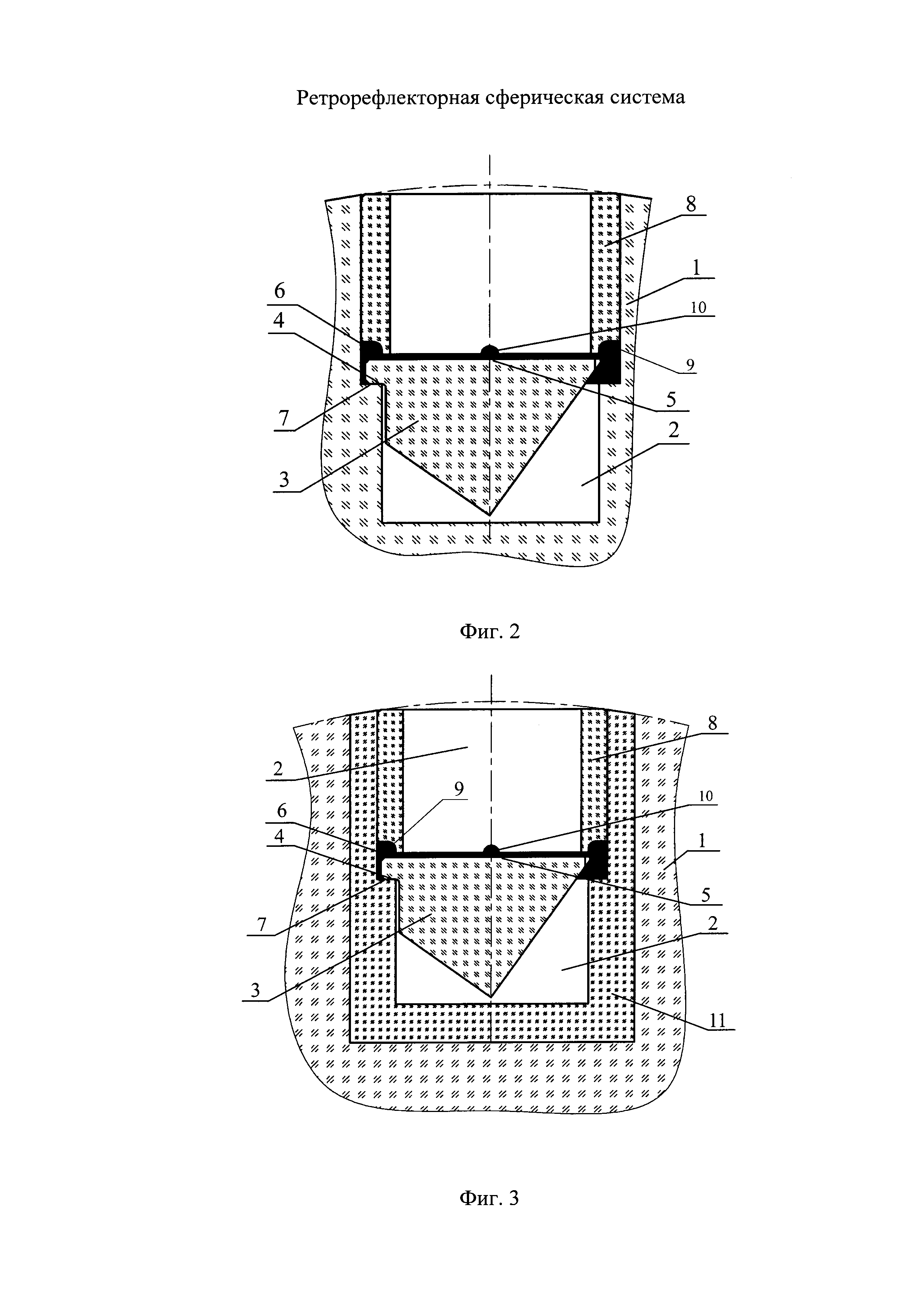 1. Ретрорефлекторная сферическая система, содержащая равномерно расположенные в однородном шарообразном корпусе, например, по три штуки на каждой из двадцати граней икосаэдра, вписанного в сферу, несквозные отверстия, внутри которых установлены уголковые призменные световозвращатели из стекла кварцевого оптического с боковыми гранями в форме треугольника и срезами углов у входной грани, и бленды, отличающаяся тем, что шарообразный корпус и бленда выполнены из диэлектрика, например из тяжелого флинта ТФ5, несквозные отверстия имеют боковые стенки ступенчатого профиля с кольцевой расточкой со стороны входа бленды, а призменные световозвращатели, выполненные скругленными, имеют по три площадки, параллельные входной грани, и установлены на демпфирующий герметик на ступени боковых стенок несквозных отверстий, и зафиксированы блендами, которые выполнены в виде отдельных цилиндров с внешней кольцевой и радиальной проточками на торцах со стороны фиксации призменных световозвращателей, и приклеены к боковым стенкам несквозных отверстий заподлицо с поверхностью сферы, кроме того, радиус RCB световой апертуры призменного световозвращателя, высота бленды hбл, угол поля зрения ±θ единичного световозвращателя с блендой, высота призмы hCB световозвращателя и число N световозвращателей в шарообразном корпусе взаимосвязаны между собой соотношениями где n - показатель преломления материала световозвращателя. 2. Ретрорефлекторная сферическая система, содержащая равномерно расположенные в однородном шарообразном корпусе, например, по три штуки на каждой из двадцати граней икосаэдра, вписанного в сферу, несквозные отверстия, внутри которых установлены уголковые призменные световозвращатели из стекла кварцевого оптического с боковыми гранями в форме треугольника и срезами углов у входной грани, и бленды, отличающаяся тем, что каждое несквозное отверстие дополнительно содержит цилиндрический корпус в виде втулки, являющийся оправой для световозвращателя и бленды, при этом шарообразный корпус, цилиндрический корпус и бленда выполнены из диэлектрика, например из тяжелого флинта ТФ5, причем внутренние стенки цилиндрического корпуса имеют ступенчатый профиль с кольцевой расточкой со стороны входа бленды, а призменные световозвращатели, выполненные скругленными, имеют по три площадки, параллельные входной грани, и установлены на демпфирующий герметик на ступени внутренних стенок цилиндрических корпусов, и зафиксированы блендами, которые выполнены в виде отдельных цилиндров с внешней кольцевой и радиальной проточками на торцах со стороны фиксации световозвращателей, и приклеены к внутренним стенкам цилиндрических корпусов заподлицо с поверхностью сферы, кроме того, радиус RCB световой апертуры призменного световозвращателя, высота бленды hбл, угол поля зрения ±θ единичного световозвращателя с блендой, высота призмы hCB световозвращателя и число N световозвращателей в шарообразном корпусе взаимосвязаны между собой соотношениями где n - показатель преломления материала световозвращателя.