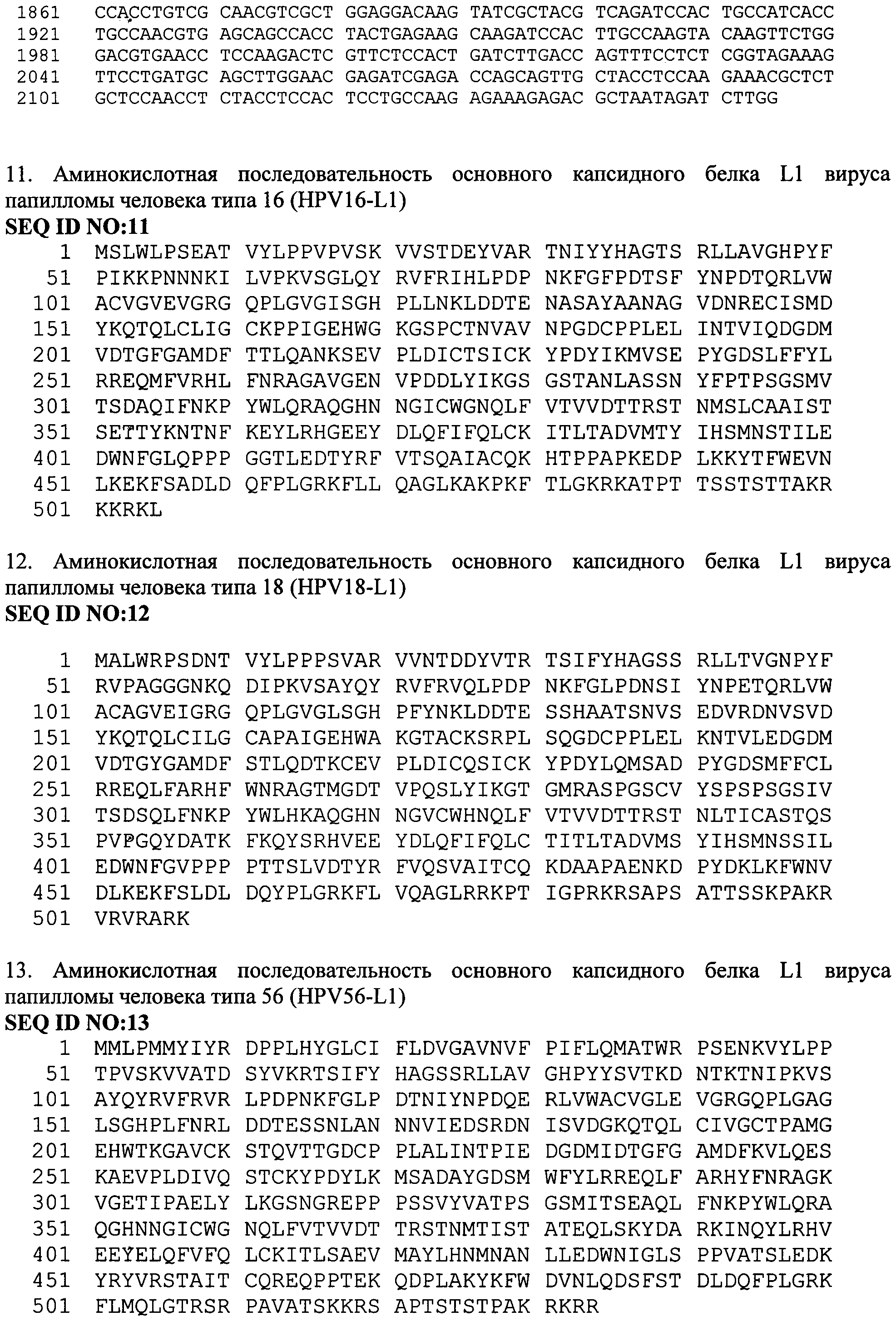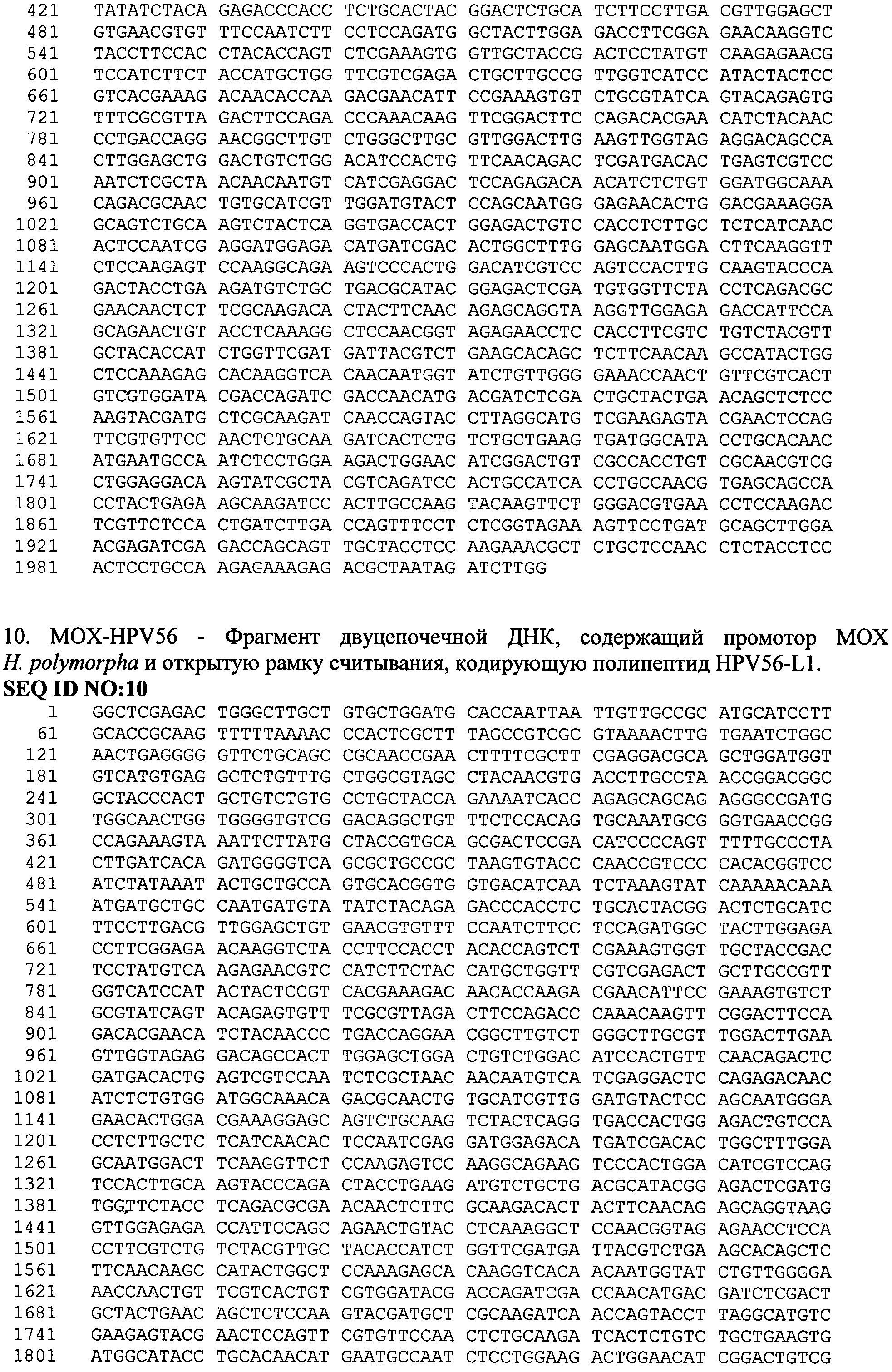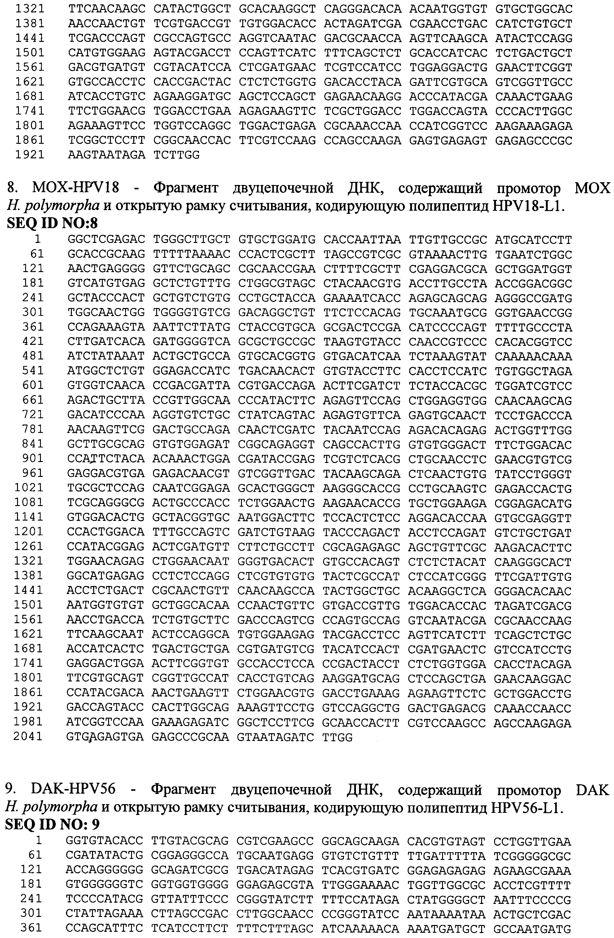 Изобретение относится к области биотехнологии, а именно генной инженерии, и касается рекомбинантной вакцины для профилактики папилломавирусной инфекции, содержащей в своем составе в качестве активного компонента рекомбинантный капсидный белок L1 вируса папилломы человека типа 16 и 18, и/или 56, полученный путем культивирования рекомбинантных клеток дрожжей Hansenula polymorpha, а также способа получения вакцины. Вирус папилломы человека (HPV - Human Papilloma Virus), поражая эпителиальные клетки, вызывает различные заболевания у человека. В зависимости от типа инфицирующего вируса, который на основании данных о гомологии последовательности ДНК классифицирован более чем в 70 типов, папилломавирусная инфекция проявляется в виде образования доброкачественных бородавок, незлокачественных кондилом или папиллом на слизистой половых органов или дыхательных путей. Вирус папилломы человека типа 16 и 18 вызывает эпителиальную дисплазию слизистой половых органов, именно эти типы вируса папилломы ассоциированы с большей частью преинвазивных и инвазивных карцином аногенитальной сферы (рак шейки матки, влагалища, вульвы и анального канала), из которых рак шейки матки - один из самых распространенных и опасных видов новообразований у женщин. В исследовании, проведенном на территории РФ, показано, что у женщин с высокой степенью плоскоклеточного интраэпителиального поражения и раком шейки матки наряду с HPV типа 16 обнаруживается HPV типа 56, причем в случаях мультиинфекции этот тип вируса преобладает (VII Всероссийская научно-практическая конференция с международным участием «Молекулярная диагностика - 2010», Сб. трудов п/ред. Академика РАМН В.И. Покровского, т.3, с.373-409). По данным ВОЗ ежегодно раком шейки матки заболевают около 500 тысяч женщин во всем мире, причем более половины этих случаев заканчиваются летальным исходом. Клинические проявления рака шейки матки не обнаруживаются длительное время, в то же время ранняя диагностика папилломавирусной инфекции довольно сложна. Именно поэтому в борьбе с распространением такого тяжелого заболевания предпочтение отдается профилактике папилломавирусной инфекции, в частности путем индуцирования иммунного ответа у человека при вакцинации. Вирус папилломы относится к семейству паповирусов (Papoviridae), имеет диаметр 40-50 нм. Капсид вируса образован из 72 белковых капсомеров, состоящих из основного белка L1 и минорного белка L2. Геном вируса представлен в виде кольцевой двуцепочечной ДНК, которая содержит 8 ранних генов (Е1-Е7) и два поздних гена, кодирующих белки капсида L1 и L2. Главный белок L1 (55-60 кДа) способен сам собираться в вирусоподобные частицы (VLP, virus-like particles), сходные по строению с вирионами, но не содержащие вирусную ДНК. Белок L1 обладает высокой иммуногенностью и индуцирует образование антител, нейтрализующих инфекционный вирус. В настоящее время рекомбинантные белки L1 HPV представляют собой перспективные иммуногенные компоненты для создания профилактических вакцин, направленных против опасных типов папилломавируса. Такие рекомбинантные вакцины безопасны, поскольку не содержат потенциально онкогенного вирусного генома. Экспрессируемый в эукариотической клетке рекомбинантный белок L1 способен к самосборке в капсидоподобную структуру, в основном отражающую VLP, морфологически и антигенно эквивалентную ауте