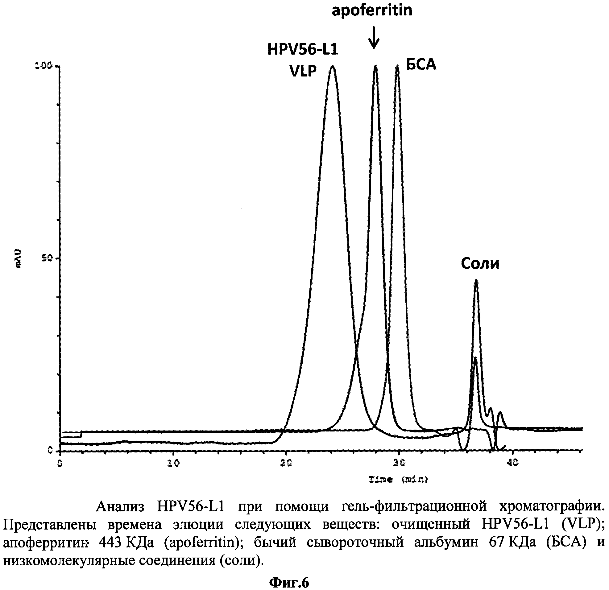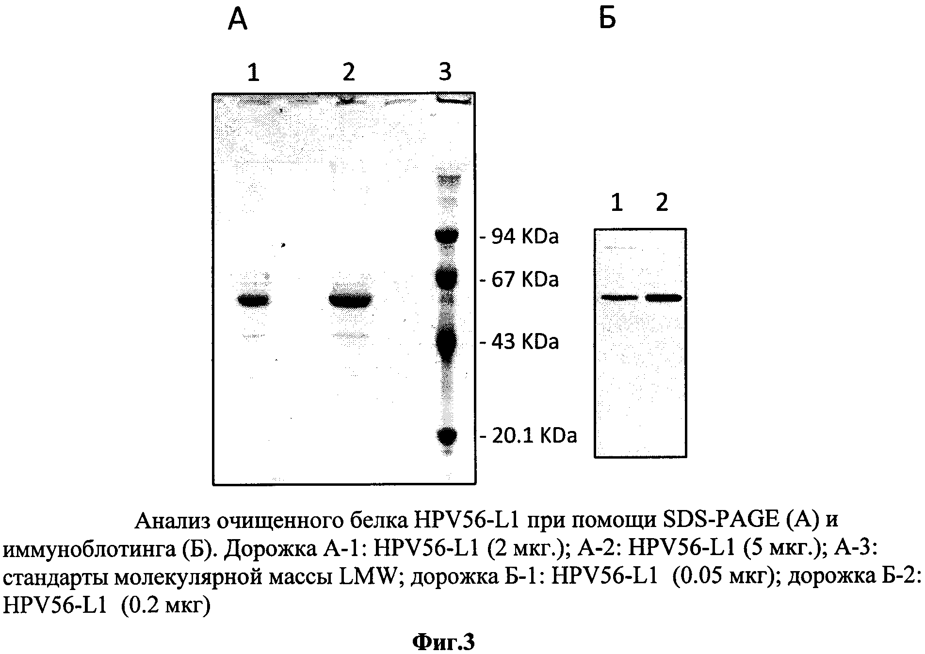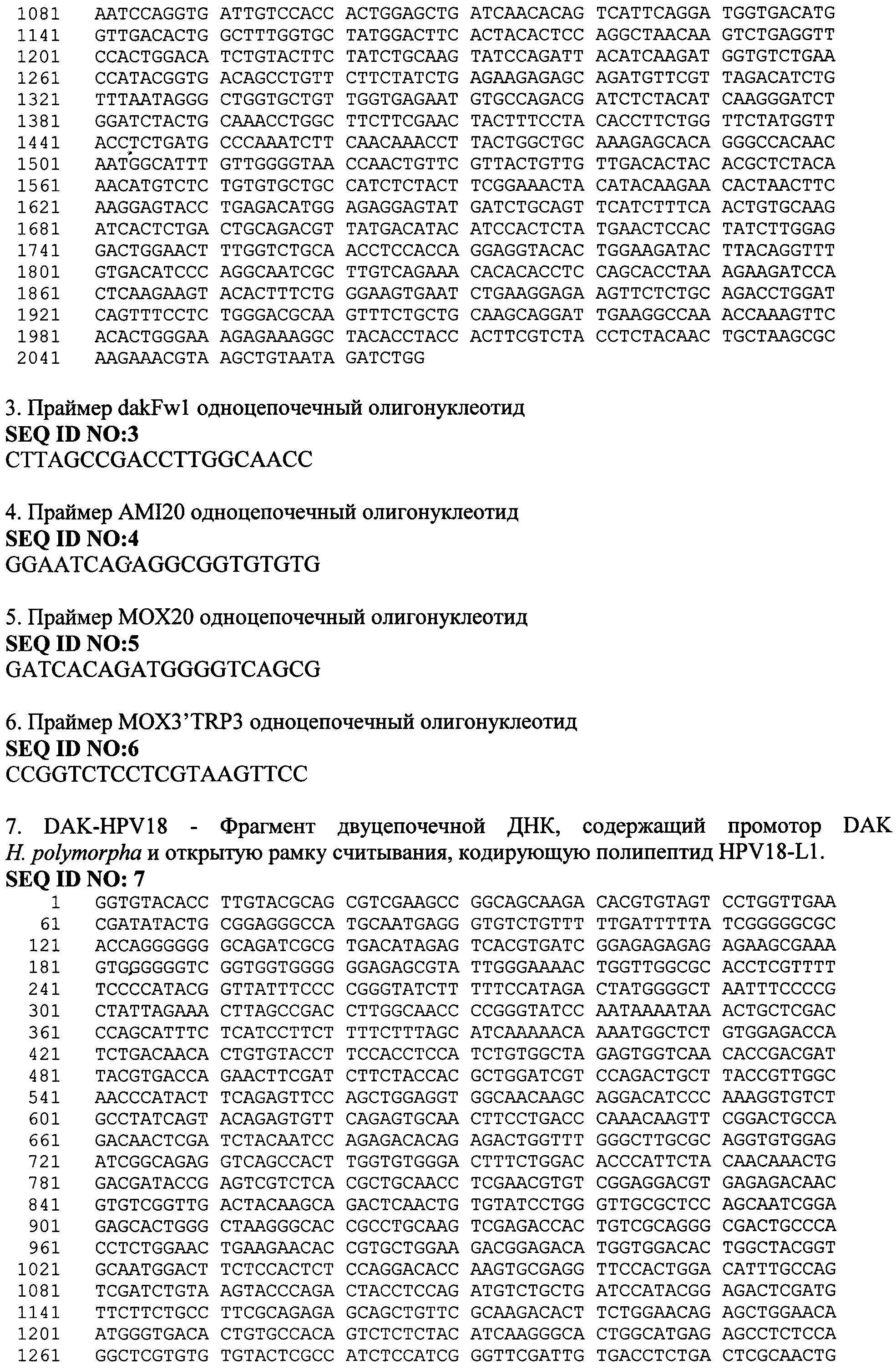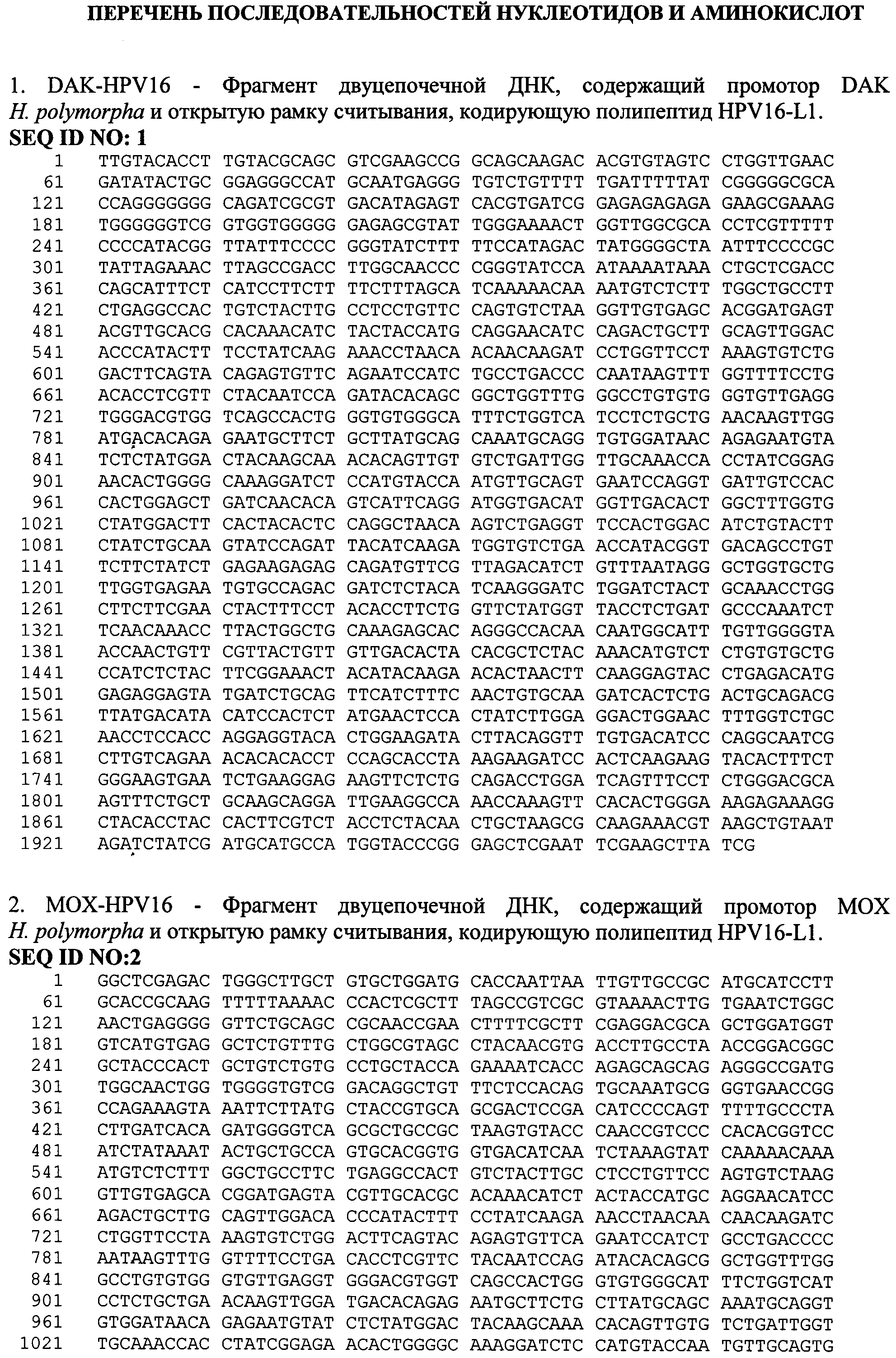 Изобретение относится к области биотехнологии, а именно генной инженерии, и касается рекомбинантной вакцины для профилактики папилломавирусной инфекции, содержащей в своем составе в качестве активного компонента рекомбинантный капсидный белок L1 вируса папилломы человека типа 16 и 18, и/или 56, полученный путем культивирования рекомбинантных клеток дрожжей Hansenula polymorpha, а также способа получения вакцины. Вирус папилломы человека (HPV - Human Papilloma Virus), поражая эпителиальные клетки, вызывает различные заболевания у человека. В зависимости от типа инфицирующего вируса, который на основании данных о гомологии последовательности ДНК классифицирован более чем в 70 типов, папилломавирусная инфекция проявляется в виде образования доброкачественных бородавок, незлокачественных кондилом или папиллом на слизистой половых органов или дыхательных путей. Вирус папилломы человека типа 16 и 18 вызывает эпителиальную дисплазию слизистой половых органов, именно эти типы вируса папилломы ассоциированы с большей частью преинвазивных и инвазивных карцином аногенитальной сферы (рак шейки матки, влагалища, вульвы и анального канала), из которых рак шейки матки - один из самых распространенных и опасных видов новообразований у женщин. В исследовании, проведенном на территории РФ, показано, что у женщин с высокой степенью плоскоклеточного интраэпителиального поражения и раком шейки матки наряду с HPV типа 16 обнаруживается HPV типа 56, причем в случаях мультиинфекции этот тип вируса преобладает (VII Всероссийская научно-практическая конференция с международным участием «Молекулярная диагностика - 2010», Сб. трудов п/ред. Академика РАМН В.И. Покровского, т.3, с.373-409). По данным ВОЗ ежегодно раком шейки матки заболевают около 500 тысяч женщин во всем мире, причем более половины этих случаев заканчиваются летальным исходом. Клинические проявления рака шейки матки не обнаруживаются длительное время, в то же время ранняя диагностика папилломавирусной инфекции довольно сложна. Именно поэтому в борьбе с распространением такого тяжелого заболевания предпочтение отдается профилактике папилломавирусной инфекции, в частности путем индуцирования иммунного ответа у человека при вакцинации. Вирус папилломы относится к семейству паповирусов (Papoviridae), имеет диаметр 40-50 нм. Капсид вируса образован из 72 белковых капсомеров, состоящих из основного белка L1 и минорного белка L2. Геном вируса представлен в виде кольцевой двуцепочечной ДНК, которая содержит 8 ранних генов (Е1-Е7) и два поздних гена, кодирующих белки капсида L1 и L2. Главный белок L1 (55-60 кДа) способен сам собираться в вирусоподобные частицы (VLP, virus-like particles), сходные по строению с вирионами, но не содержащие вирусную ДНК. Белок L1 обладает высокой иммуногенностью и индуцирует образование антител, нейтрализующих инфекционный вирус. В настоящее время рекомбинантные белки L1 HPV представляют собой перспективные иммуногенные компоненты для создания профилактических вакцин, направленных против опасных типов папилломавируса. Такие рекомбинантные вакцины безопасны, поскольку не содержат потенциально онкогенного вирусного генома. Экспрессируемый в эукариотической клетке рекомбинантный белок L1 способен к самосборке в капсидоподобную структуру, в основном отражающую VLP, морфологически и антигенно эквивалентную ауте