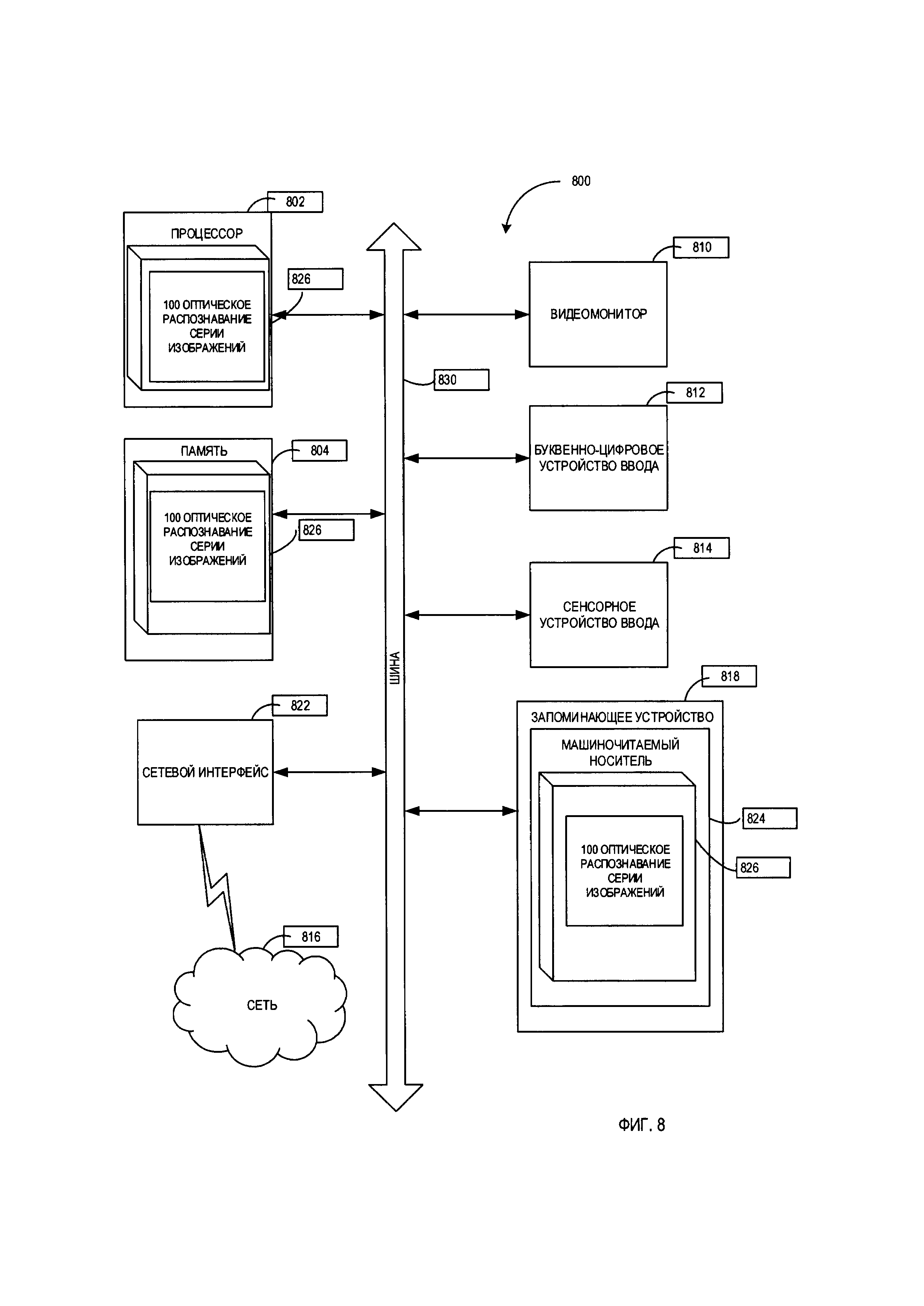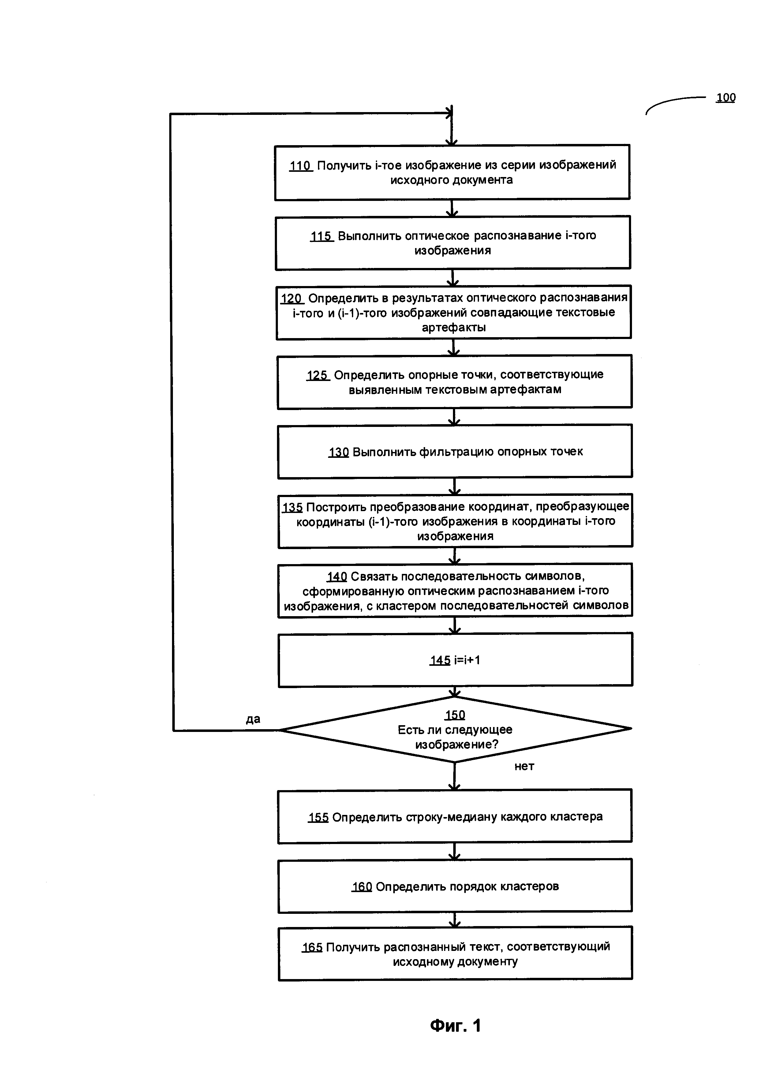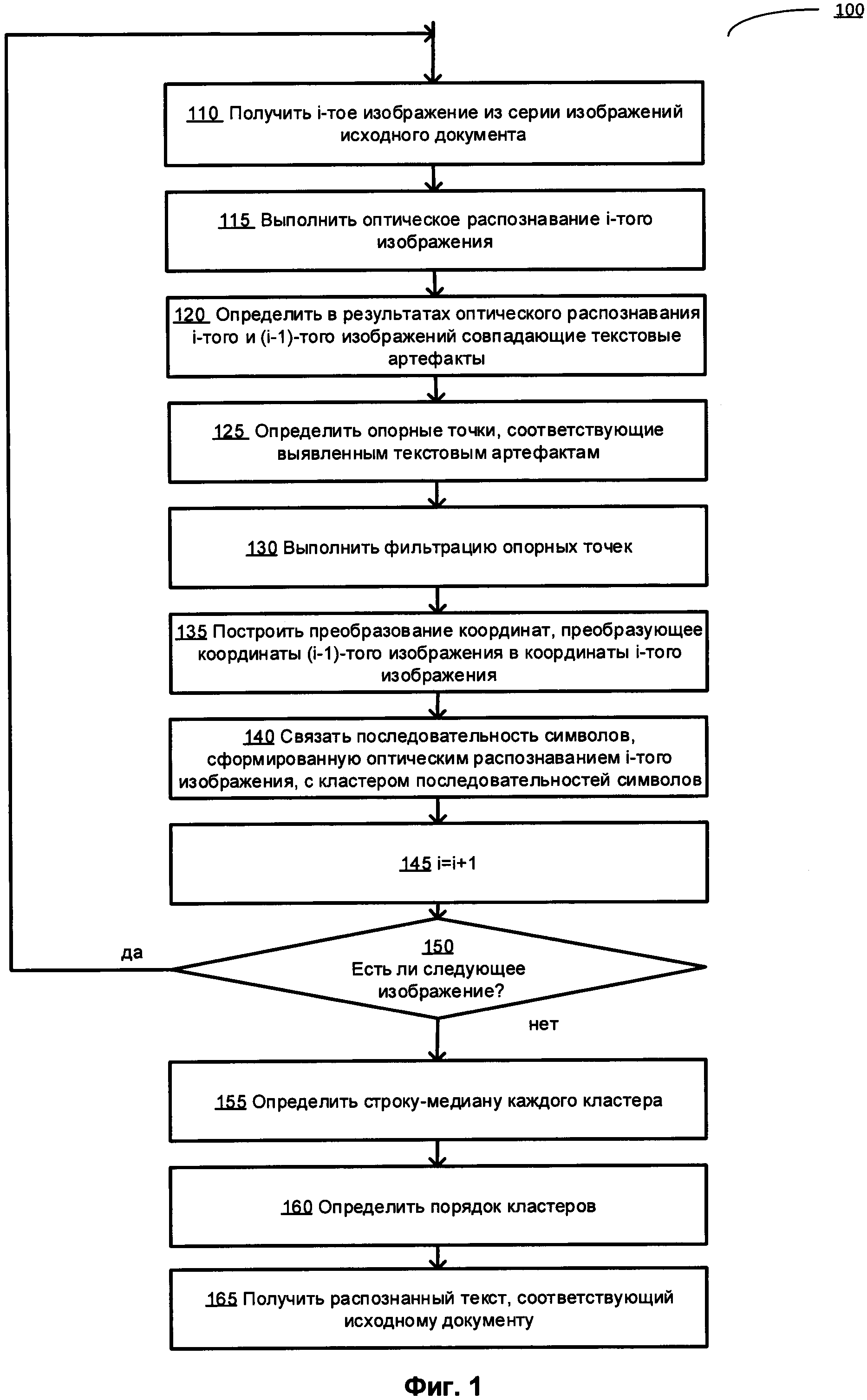 ОБЛАСТЬ ТЕХНИКИ [0001] Настоящее изобретение в общем относится к вычислительным системам, более конкретно к системам и способам оптического распознавания символов (OCR). УРОВЕНЬ ТЕХНИКИ [0002] Оптическое распознавание символов (OCR) представляет собой осуществляемое на компьютере преобразование изображений текста (включая машинописный, написанный от руки или напечатанный текст) в электронные документы в машинной кодировке. СУЩНОСТЬ ИЗОБРЕТЕНИЯ [0003] В соответствии с одним или более аспектами настоящего раскрытия изобретения описанный в примере способ оптического распознавания символов (OCR) серии изображений с символами некоторого алфавита может включать: получение текущего изображения из серии изображений исходного документа, причем текущее изображение хотя бы частично перекрывает предыдущее изображение из серии изображений; выполнение оптического распознавания символов (OCR) текущего изображения для получения распознанного текста и соответствующей ему разметки текста; определение с использованием распознанного текста и соответствующей ему разметки текста множества текстовых артефактов для каждого текущего изображения и предыдущего изображения, причем каждый текстовый артефакт представлен символьной последовательностью, которая обладает частотой встречаемости в распознанном тексте ниже пороговой частоты; определение для каждого текущего и предыдущего изображений соответствующего множества опорных точек, причем каждая опорная точка ассоциируется с по крайней мере одним текстовым артефактом из множества текстовых артефактов; вычисление с использованием координат соответствующих опорных точек текущего и предыдущего изображений параметров преобразования координат предыдущего изображения в координаты текущего изображения; связывание с помощью преобразования координат как минимум части распознанного текста с кластером из множества кластеров символьных последовательностей, причем распознанный текст создается путем обработки текущего изображения, а символьные последовательности создаются путем обработки одного или более ранее полученных изображений из серии изображений; определение порядка кластеров символьных последовательностей, причем этот порядок отражает разметку исходного документа; и получение с учетом порядка кластеров итогового распознанного текста, соответствующего хотя бы части исходного документа. [0004] В соответствии с одним или более аспектами настоящего раскрытия изобретения описанная в примере система оптического распознавания символов (OCR) серии изображений с символами некоторого алфавита может включать память, устройство обработки, подключенное к памяти, причем устройство обработки предназначено для: получения текущего изображения из серии изображений исходного документа, причем текущее изображение хотя бы частично перекрывает предыдущее изображение из серии изображений; выполнения оптического распознавания символов (OCR) текущего изображения для получения распознанного текста и соответствующей ему разметки текста; определения с использованием распознанного текста и соответствующей ему разметки текста множества текстовых артефактов для каждого текущего изображения и предыдущего изображения, причем каждый текстовый артефакт представлен символьной последо