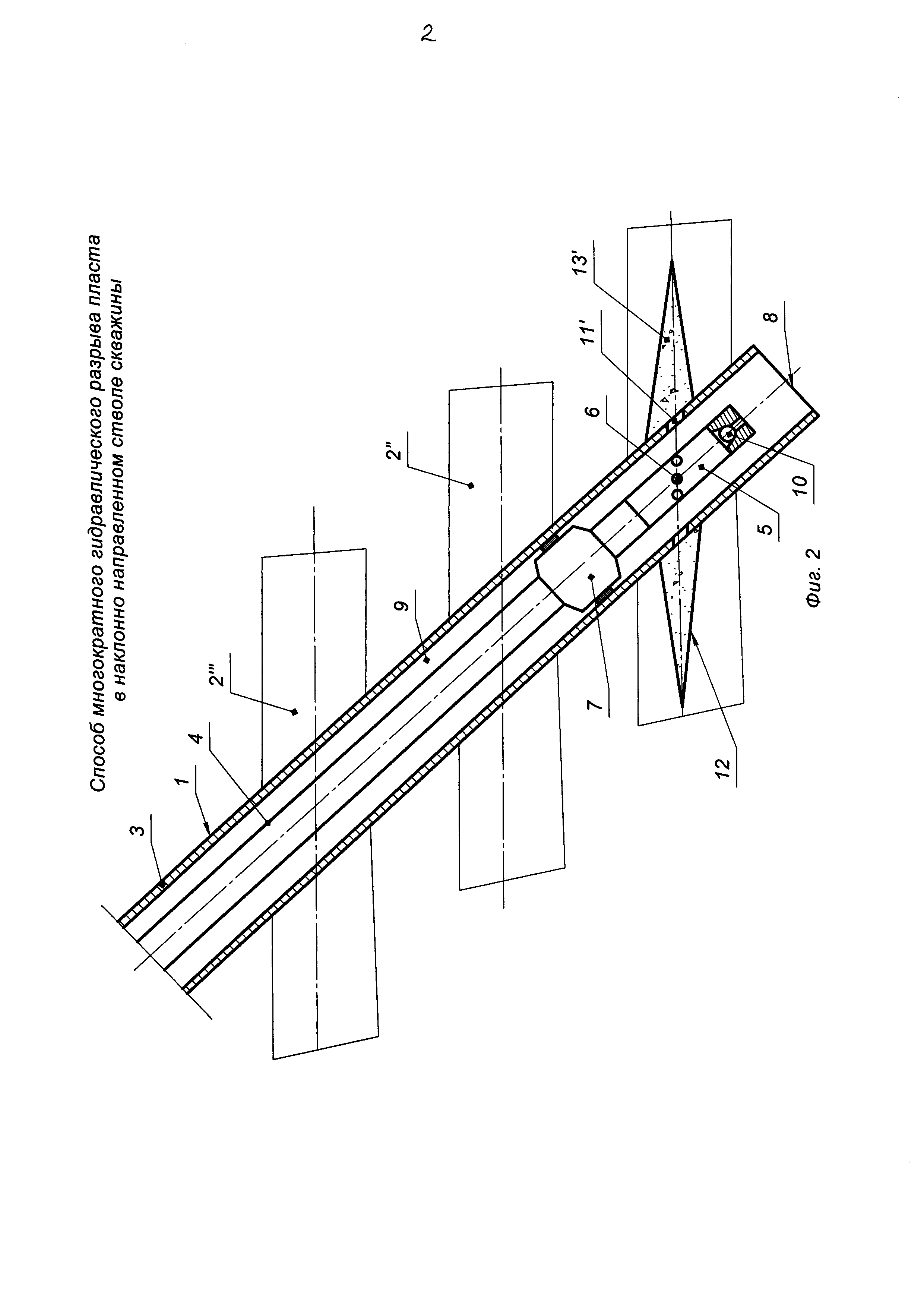 Способ гидравлического разрыва пласта в наклонно направленном стволе скважины, включающий бурение наклонно направленного ствола скважины через нефтенасыщенные пропластки, спуск обсадной колонны в скважину и цементирование кольцевого пространства между обсадной колонной и горной породой, перфорацию обсадной колонны в стволе скважины в интервале нефтенасыщенных пропластков, проведение многократного гидравлического разрыва пласта (ГРП) в стволе скважины в направлении от забоя к устью закачкой по колонне труб жидкости разрыва и формированием в нефтенасыщенных пропластках трещин из ствола скважины с последующим их креплением проппантом, отличающийся тем, что на устье скважины колонну труб снизу оснащают гидропескоструйным перфоратором с самоцентрирующимися насадками в направлении главного максимального напряжения горной породы, а выше - якорем-центратором, спускают колонну труб в наклонно направленный обсаженный ствол до ближайшего к забою нефтенасыщенного пропластка, выполняют гидропескоструйную перфорацию обсадной колонны напротив нефтенасыщенного пропластка в направлении главного максимального напряжения горной породы, не изменяя положения колонны труб, через гидропескоструйный перфоратор производят ГРП с образованием трещины разрыва с последующим креплением ее проппантом, если при креплении трещины проппантом давление в межтрубье устанавливается свыше 80% величины давления смыкания обрабатываемого интервала пласта, то в межтрубье насосным агрегатом осуществляют подкачку жидкости с расходом 0,2-0,4 м3/мин, при давлении в межтрубье менее 80% давления смыкания подкачку жидкости в межтрубье не осуществляют, многократные ГРП повторяют в зависимости от количества нефтенасыщенных пропластков, вскрытых наклонно направленным стволом скважины, по окончании многократного ГРП извлекают колонну труб с гидропескоструйным перфоратором и якорем-центратором из скважины, после чего вымывают проппант из наклонно направленного ствола скважины.