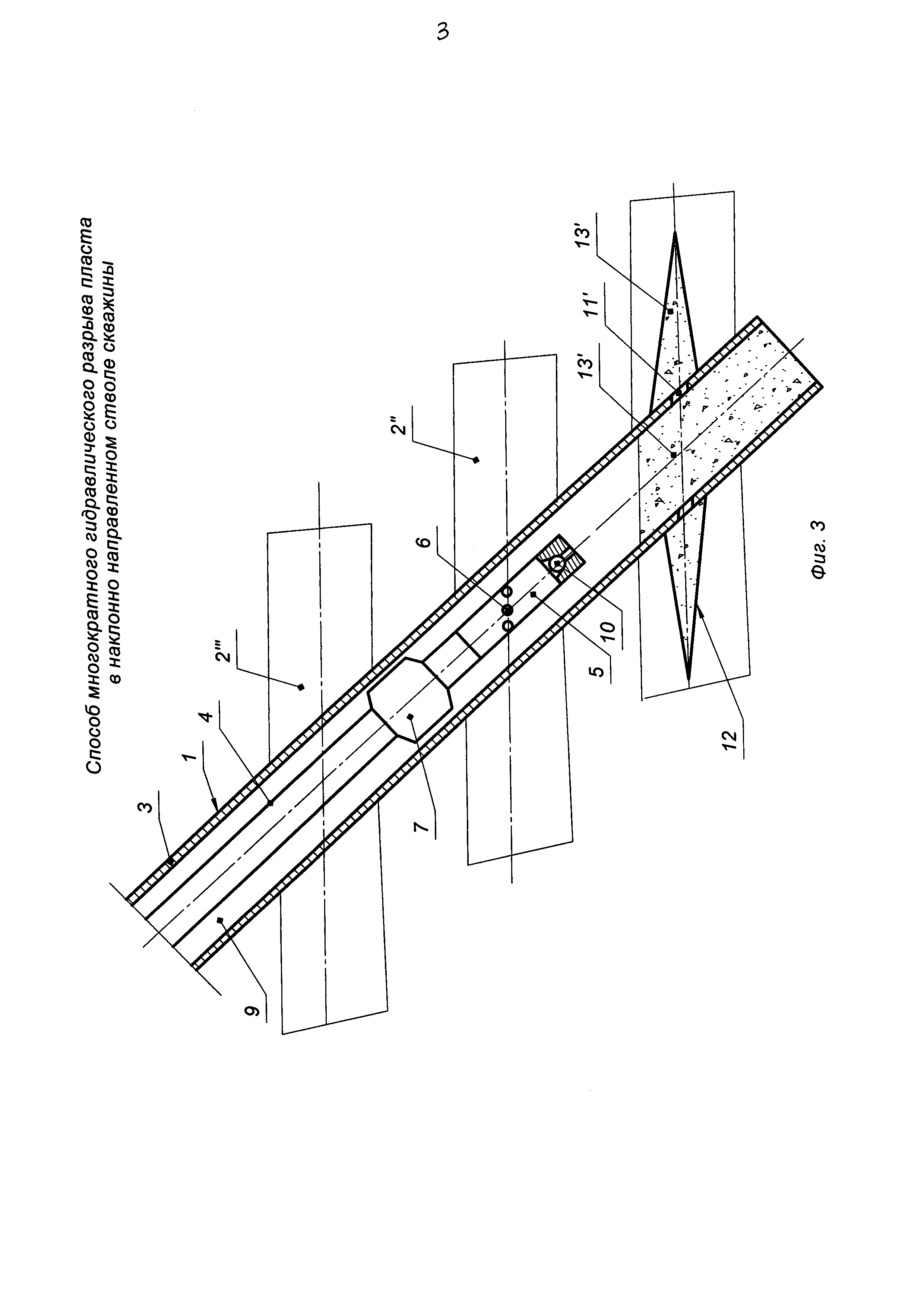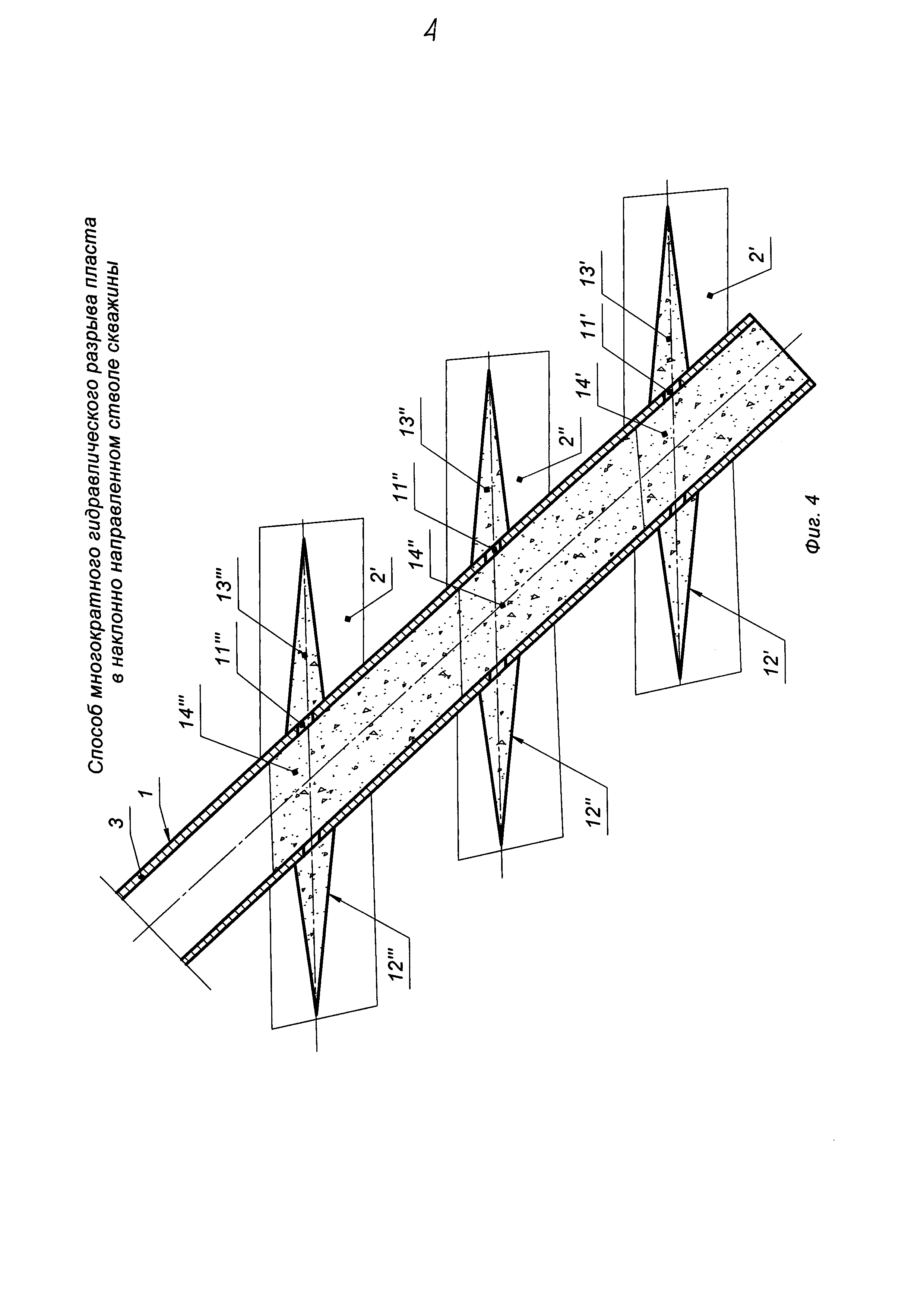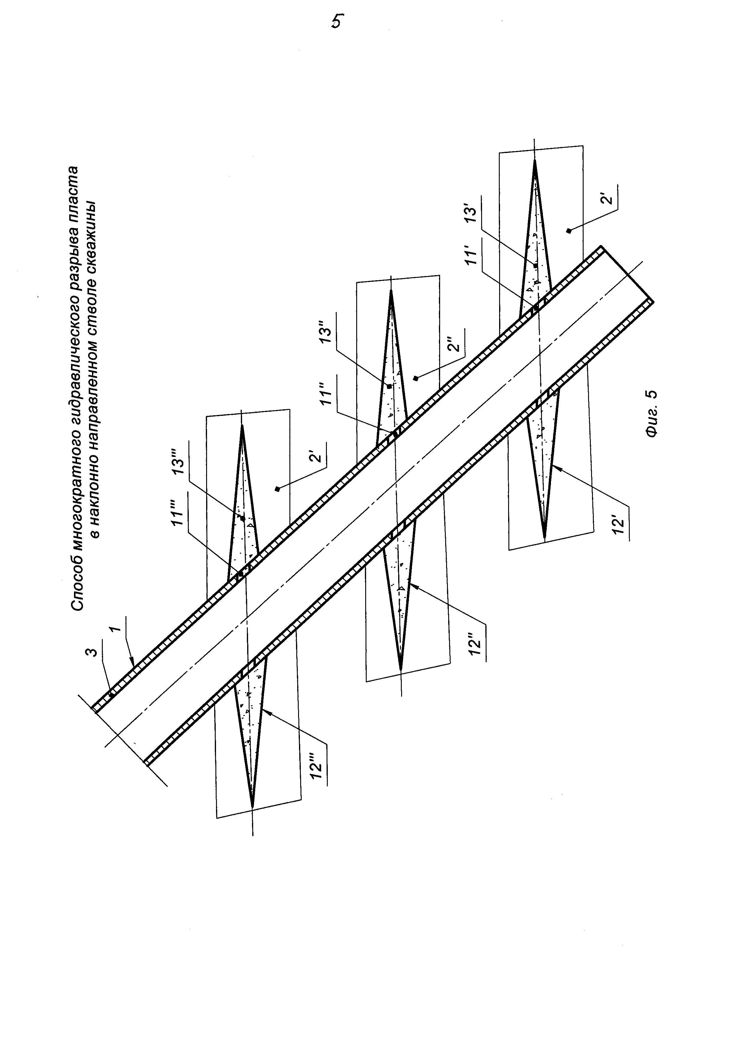 Изобретение относится к способам гидравлического разрыва в наклонно направленных и горизонтальных стволах скважин продуктивных пластов в слабосцементированных породах. Способ включает бурение наклонно направленного ствола скважины через нефтенасыщенные пропластки, спуск обсадной колонны в скважину и цементирование кольцевого пространства между обсадной колонной и горной породой, перфорацию обсадной колонны в стволе скважины в интервале нефтенасыщенных пропластков, проведение многократного гидравлического разрыва пласта (ГРП) в стволе скважины в направлении от забоя к устью закачкой по колонне труб жидкости разрыва и формированием в нефтенасыщенных пропластках трещин из ствола скважины с последующим их креплением проппантом. При этом на устье скважины колонну труб снизу оснащают гидропескоструйным перфоратором с самоцентрирующимися насадками в направлении главного максимального напряжения горной породы, а выше - якорем-центратором, спускают колонну труб в наклонно направленный обсаженный ствол до ближайшего к забою нефтенасыщенного пропластка. Выполняют гидропескоструйную перфорацию обсадной колонны напротив нефтенасыщенного пропластка в направлении главного максимального напряжения горной породы, не изменяя положения колонны труб, через гидропескоструйный перфоратор производят ГРП с образованием трещины разрыва с последующим креплением ее проппантом. Если при креплении трещины проппантом давление в межтрубье устанавливается свыше 80% величины давления смыкания обрабатываемого интервала пласта, то в межтрубье насосным агрегатом осуществляют подкачку жидкости с расходом 0,2-0,4 м/мин. При