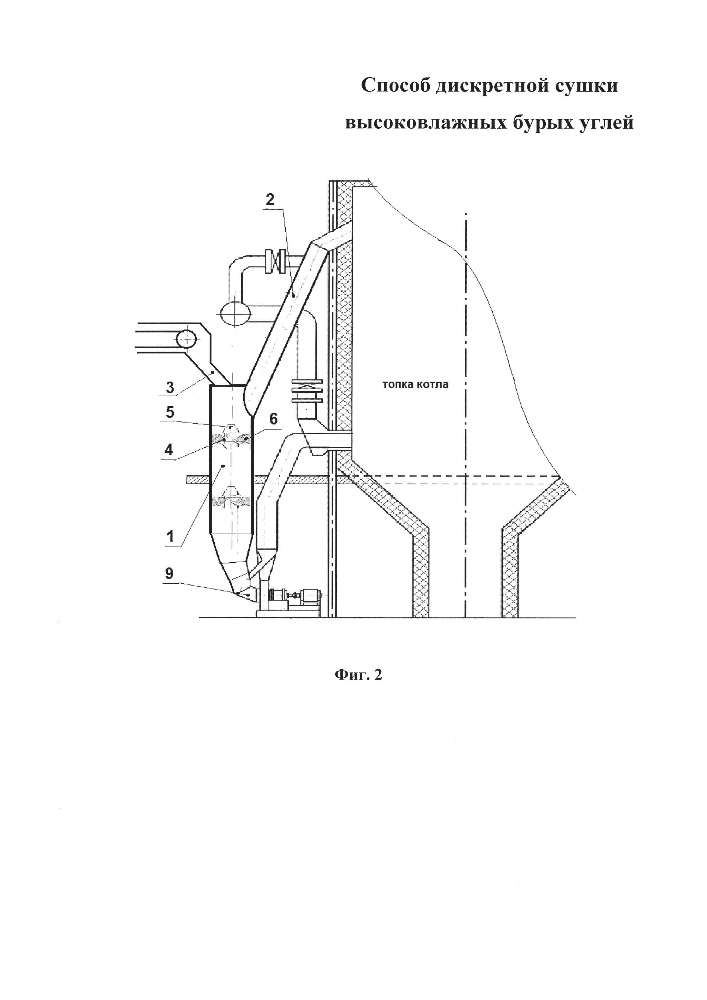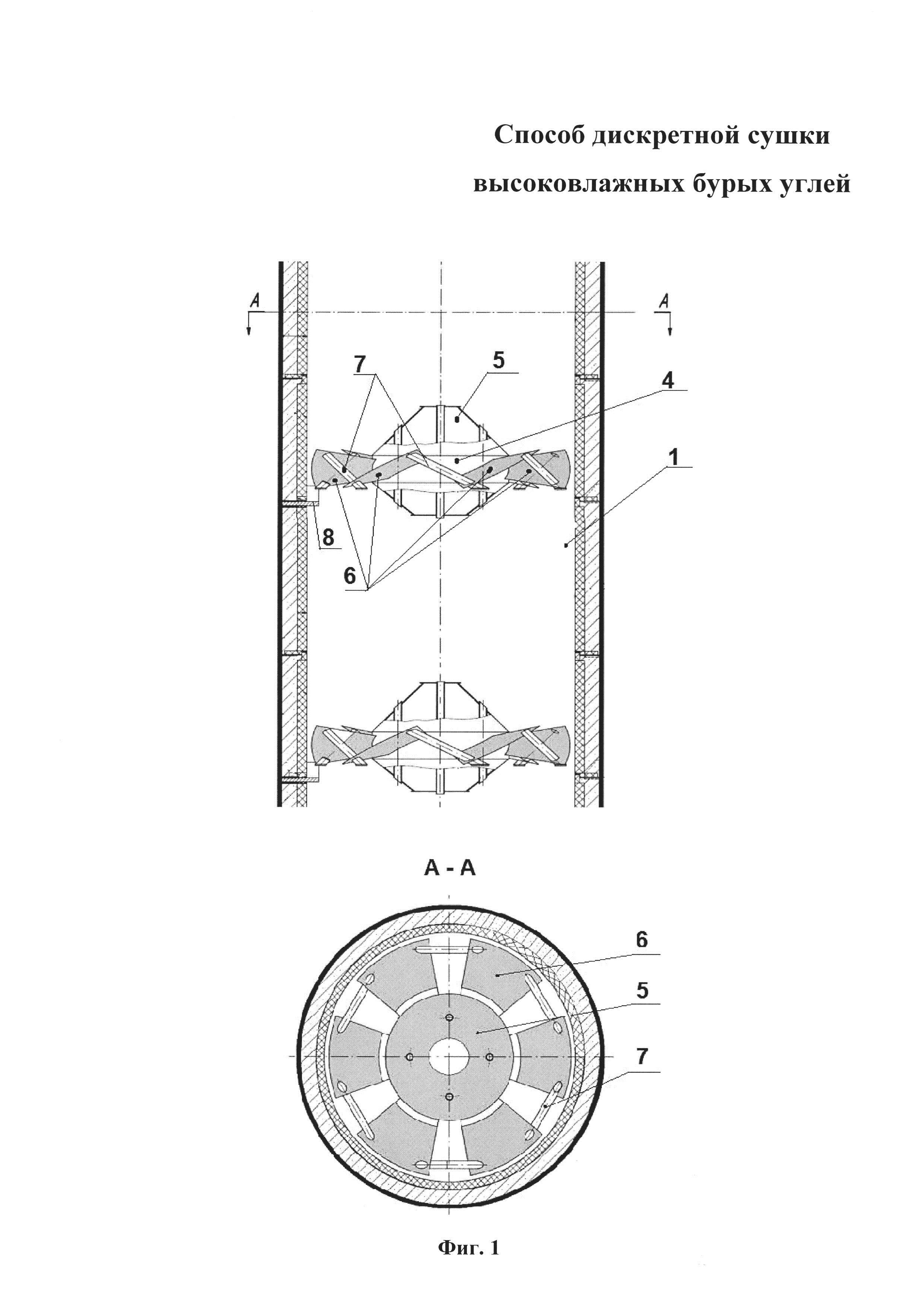 Способ дискретной сушки высоковлажных бурых углей в вертикальной сушильной шахте, включающий движение сверху вниз спутных потоков высокотемпературного газообразного сушильного агента и угля, отличающийся тем, что спутные потоки сушильного агента и угля пропускают через систему установленных в шахте лопастных аппаратов, расположенных в поперечном сечении трубы-сушилки друг над другом и перекрывающих лопастями около 60% ее «живого» сечения.