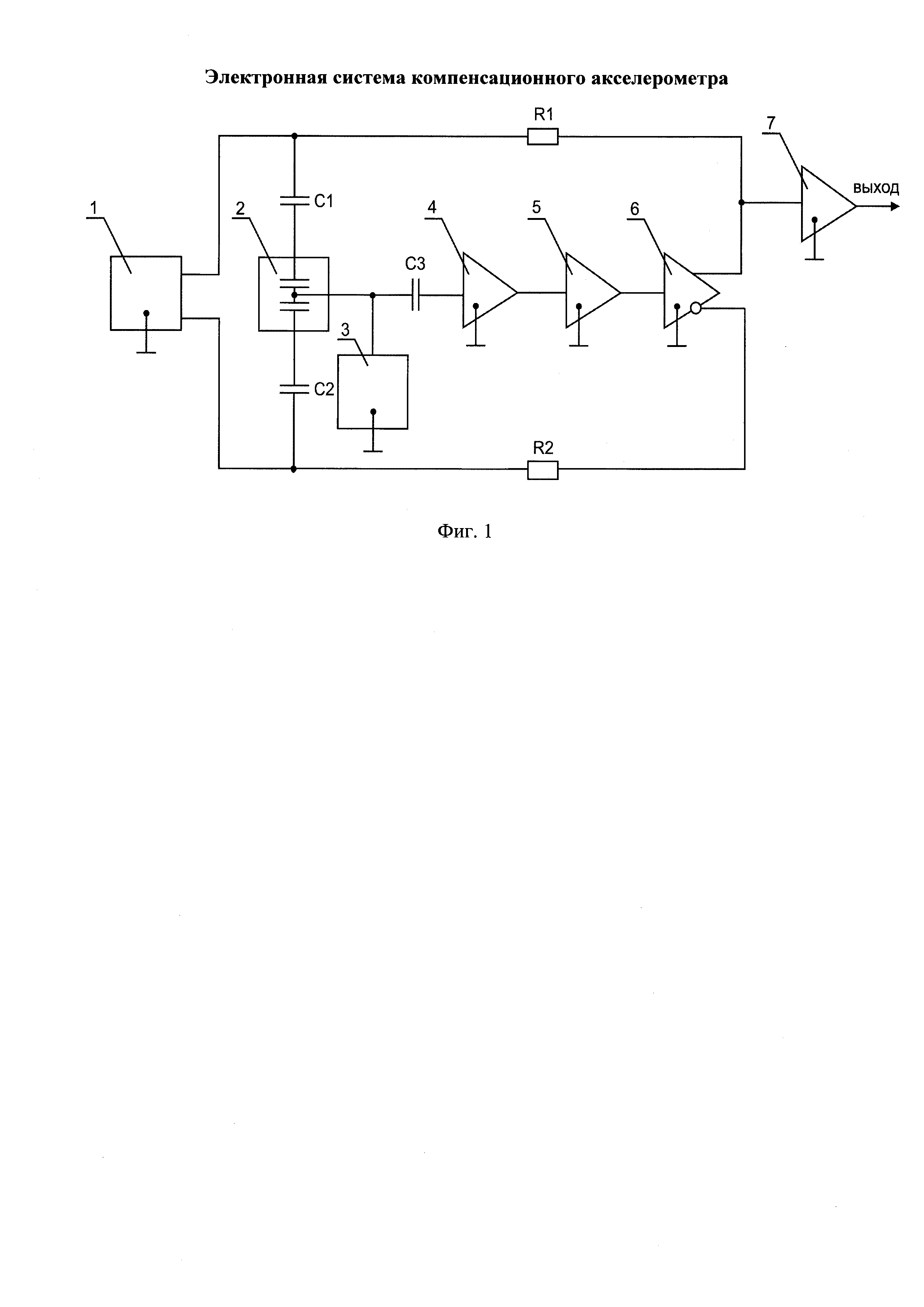 Электронная система компенсационного акселерометра, содержащая дифференциальный емкостный преобразователь, двухфазный генератор переменного тока, источник опорного напряжения постоянного тока, усилитель, состоящий из усилителя переменного тока, фазового детектора и усилителя постоянного тока с двумя противофазными выходами, отличающаяся тем, что в качестве усилителя переменного тока выступает зарядовый усилитель, в качестве усилителя постоянного тока выступает интегратор с двумя противофазными выходами, а на выходе введен дополнительный усилитель постоянного тока.