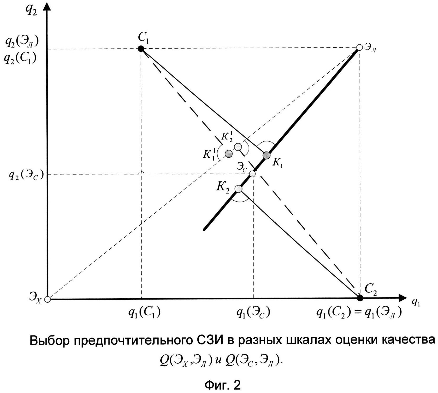 Изобретение относится к цифровой вычислительной технике, а именно к цифровым вычислительным системам для определения качества сравниваемых сложных систем, средств, изделий и различных объектов или их вариантов, описываемых значительным числом разнородных единичных показателей. При невозможности или большом затруднении установления важности свойств (характеристик) сравниваемых объектов или их вариантов и отсутствии обучающей выборки для формирования шкалы оценки предлагается использовать исходные данные самой оцениваемой выборки при определении предпочтительного объекта, средства, варианта. Изобретение может быть использовано в военной отрасли - для планирования, разработки, создания и приема на вооружение более совершенных систем и средств вооружения, а в гражданской - более качественных и конкурентоспособных систем и изделий. Техническим результатом является расширение арсенала технических средств для повышения эффективности и качества объектов за счет использования способа и создания устройства выбора предпочтительного из ряда сравниваемых на разных этапах его жизненного цикла без привлечения высококвалифицированных экспертов. Выбор предпочтительного средства связан с решением многокритериальной задачи. Рассмотрим несколько известных способов ее решения. 1. Известен способ, основанный на использовании метода анализа иерархий [1] и его модификаций. Применение указанного способа предусматривает возможность установления соотношения характеристик сравниваемых средств: - свойства или характеристики оцениваемых средств одинаково значимы и важны; - одно свойство или характеристика несколько важнее другого; - одно свойство или характеристика важнее другого; - одно свойство или характеристика явно важнее других; - одно свойство или характеристика абсолютно важнее других. При возможности установления таких соотношений задача сводится к нахождению коэффициентов весомости Wj и объединению нормированных единичных показателей в комплексный Q=f(Wj, qj). Однако при наличии у рассматриваемых средств явно разнородных свойств (характеристик) становится невозможным использование метода иерархий и его модификаций. 2. Известны способы нахождения коэффициентов весомости с помощью методов ранжирования [2, 3] характеристик сравниваемых средств, ставящие в затруднение экспертов в случае разнородности свойств. 3. Известны экспертные способы оценки качества рассматриваемых средств [3-5], основанные на упрощении первых двух методов. Это способы, связанные с лексикографическим методом, с методом усреднения единичных показателей, максиминным методом оценки качества, методом идеальной точки и другими. Всем рассмотренным способам выбора предпочтительного средства присущи погрешности экспертных систем, связанные с наличием «субъективизма». 4. Известны и другие изобретения [8-11] оценки качества объектов, не решающие сформулированную авторами задачу разработки способа выбора предпочтительного средства без привлечения высококвалифицированных экспертов в условиях отсутствия обучающей выборки. 5. Известен способ [6, 7], основанный на формировании обучающей выборки для создания шкалы оценки качества, который позволяет сравнить изделия оцениваемой выборки. Его основной недостаток - требование наличия значительного объ