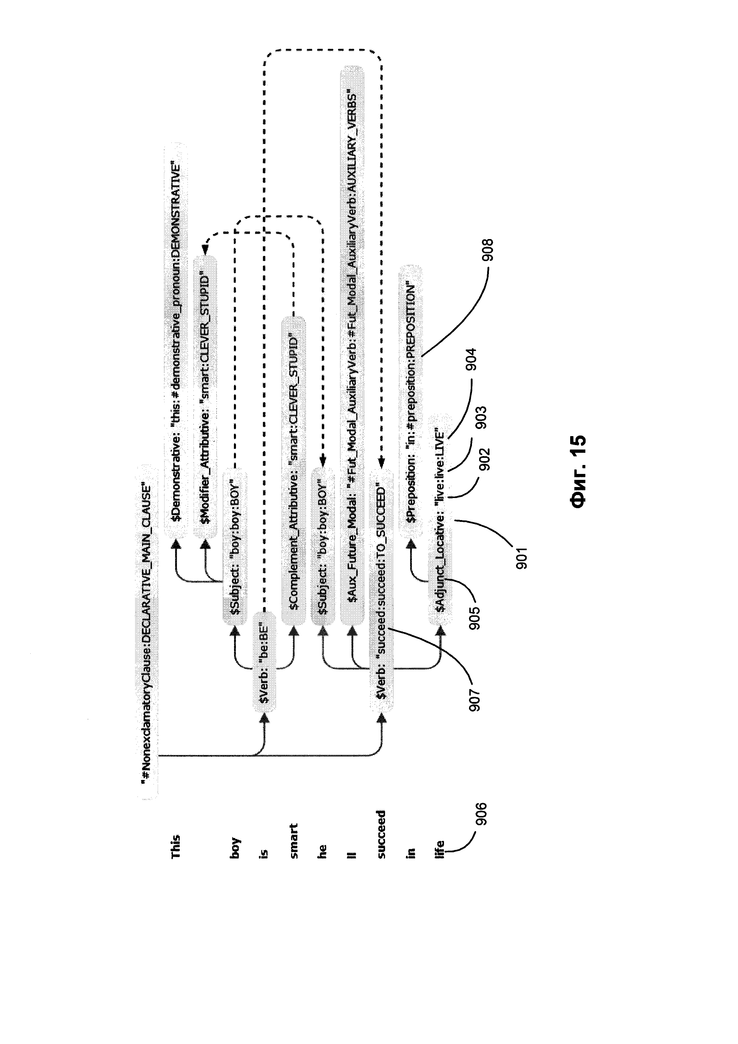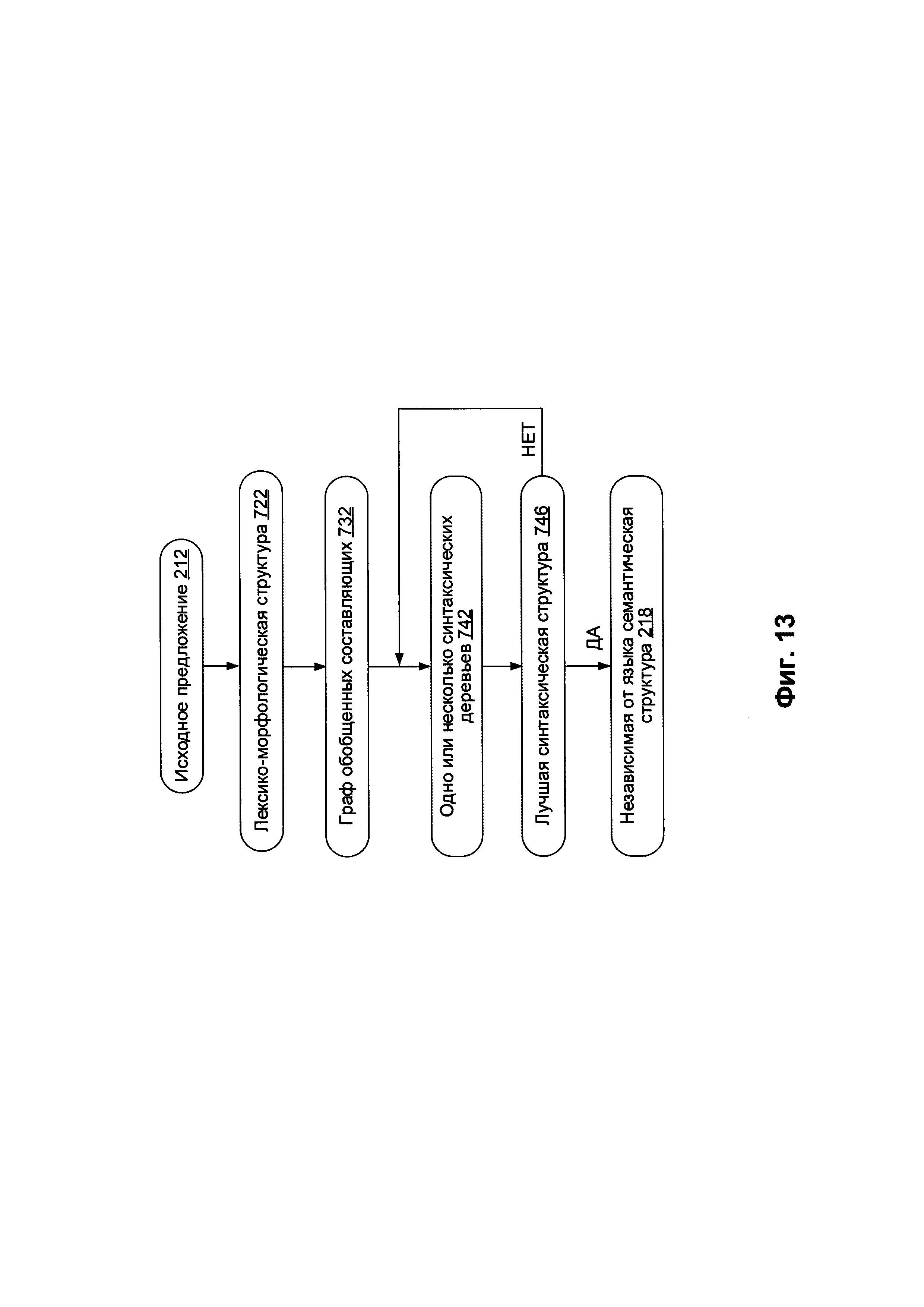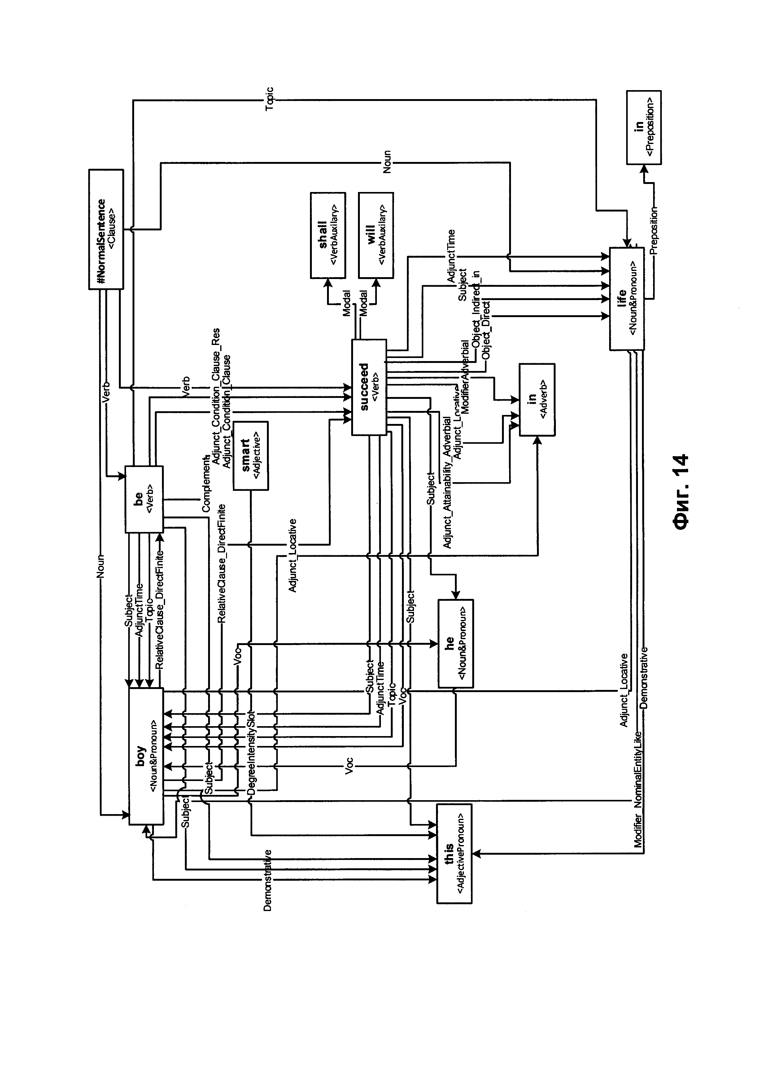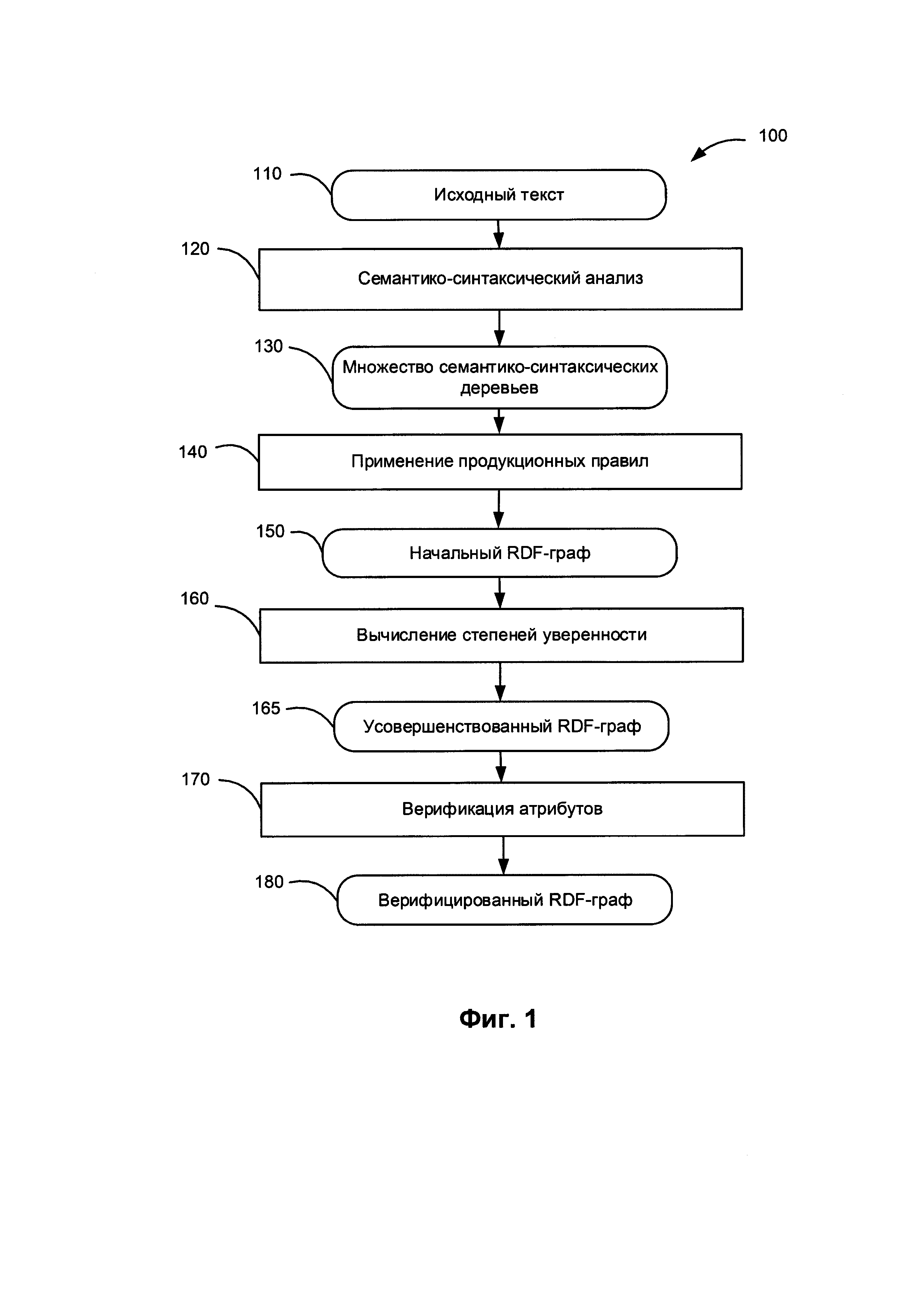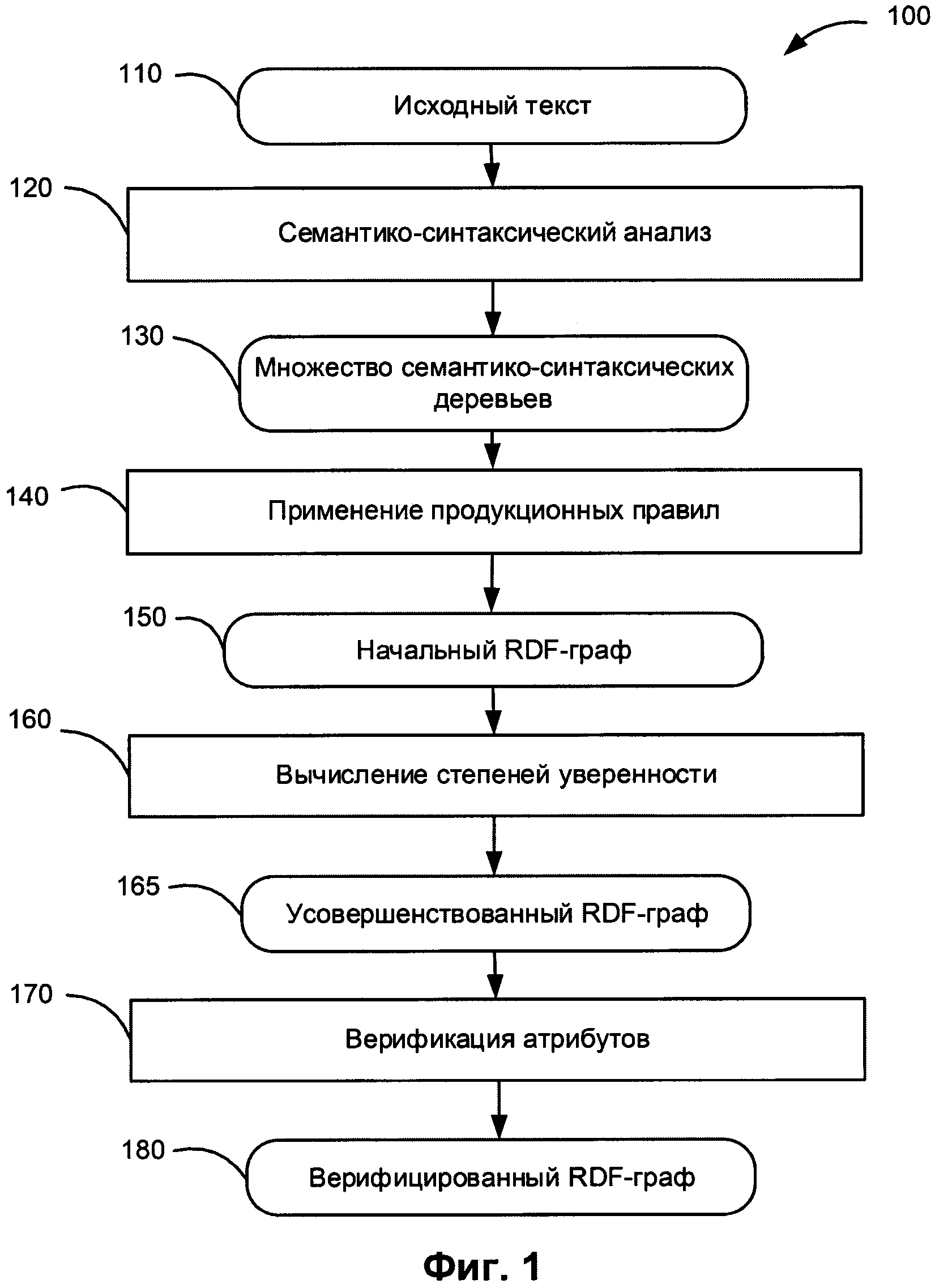 1. Способ извлечения информации из текстов на естественном языке, включающий: получение текста на естественном языке с помощью устройства обработки; выполнение синтактико-семантического анализа текста на естественном языке для получения множества семантических структур; интерпретацию множества семантических структур с помощью набора продукционных правил для получения множества элементов данных, каждый из которых связывает значение атрибута с информационным объектом, представляющим сущность, ссылающуюся на текст на естественном языке; и определение как минимум для одного элемента данных в множестве элементов данных степени уверенности путем вычисления функции уверенности, представленной посредством линейного классификатора и связанной с набором продукционных правил. 2. Способ по п. 1, отличающийся тем, что функция уверенности представлена посредством линейного классификатора, обученного на размеченной выборке и вычисляющего расстояние от информационного объекта до гиперплоскости в гиперпространстве признаков, связанных с набором продукционных правил. 3. Способ по п. 1, дополнительно включающий: верификацию значения атрибута при определении, что степень уверенности снижается ниже определенного порога. 4. Способ по п. 3, отличающийся тем, что верификация значения атрибута дополнительно включает прием через графический интерфейс пользователя с помощью пользовательского ввода, подтверждающего значение атрибута. 5. Способ по п. 1, дополнительно включающий: определение с использованием набора данных для обучения как минимум одного параметра функции уверенности, где набор данных для обучения содержит множество элементов данных для обучения, каждый из которых определяет один или более атрибутов, связанных как минимум с одним информационным объектом, представленным текстом на естественном языке для обучения. 6. Способ по п. 1, дополнительно включающий: получение с помощью множества элементов данных графа Среды описания ресурсов RDF, представляющего текст на естественном языке. 7. Способ по п. 1, отличающийся тем, что каждая семантическая структура из множества семантических структур представлена графом, включающим множество узлов, соответствующих множеству семантических классов, и множество дуг, соответствующих множеству семантических отношений. 8. Способ по п. 1, отличающийся тем, что продукционное правило включает одно или более логических выражений, определенных в одном или более шаблонах семантических структур. 9. Система извлечения информации из текстов на естественном языке, включающая: память; процессор, связанный с данной памятью, причем этот процессор настроен так, чтобы: получать текст на естественном языке; выполнять синтактико-семантический анализ текста на естественном языке для получения множества семантических структур; интерпретировать множество семантических структур с помощью набора продукционных правил для получения множества элементов данных, таких, что каждый элемент данных связывает значение атрибута с информационным объектом, представляющим сущность, ссылающуюся на текст на естественном языке; и определять как минимум для одного элемента данных в множестве элементов данных уровень уверенности путем вычисления функции уверенности, представленной посредством классификатора и 