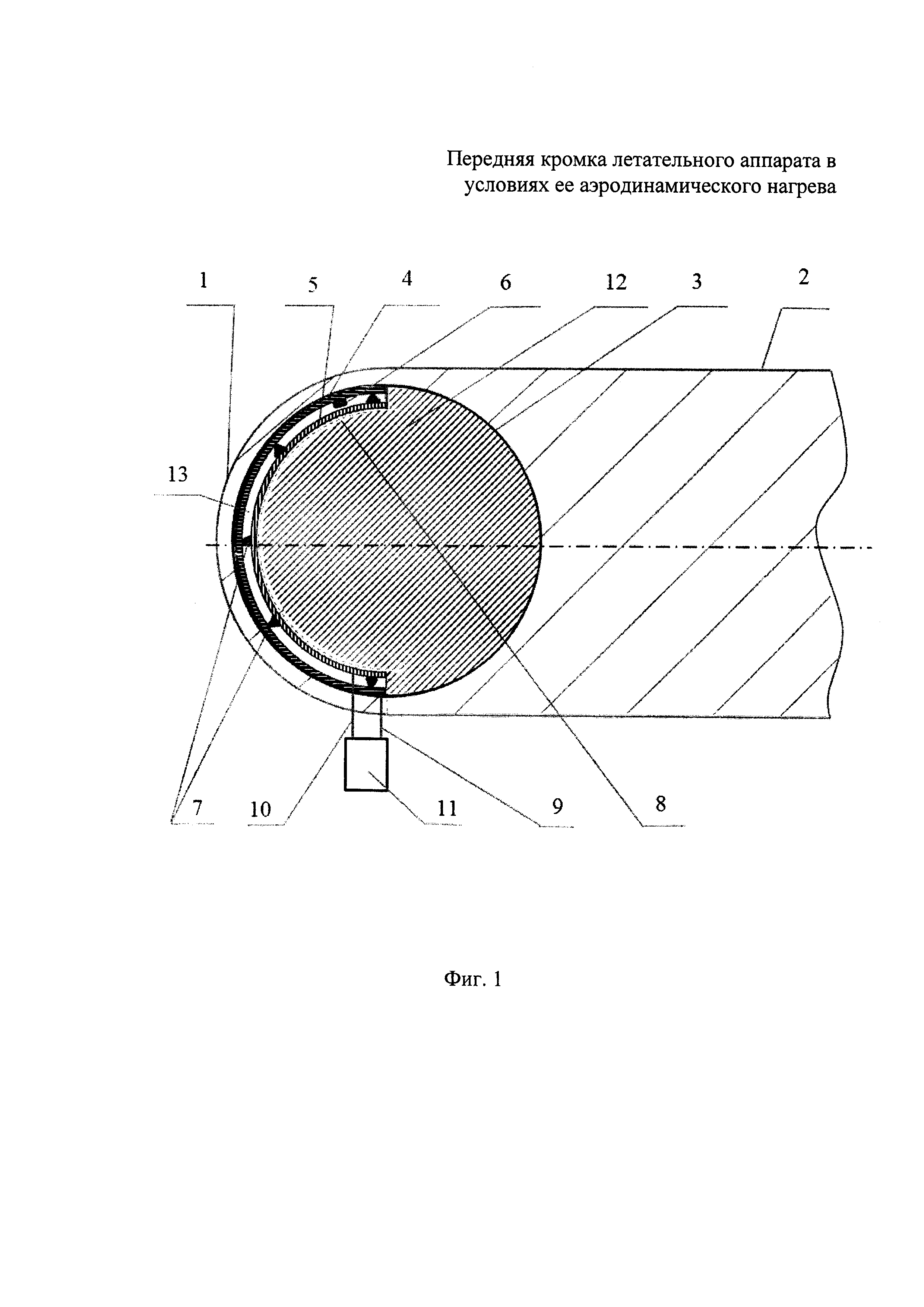 Изобретение относится к авиационной и ракетно-космической технике, в частности к тепловой защите частей летательных аппаратов (ЛА), совершающих полет в атмосфере со сверх- и гиперзвуковыми скоростями, и может быть использовано для улучшения теплопрочностных характеристик конструкции передних кромок с одновременным получением электрической энергии на борту ЛА. Под передними кромками понимаются кромки крыла, оперения, воздухозаборника, носовые части, наконечники с полусферическим затуплением и другие элементы летательных аппаратов, которые подвержены воздействию существенно неравномерного вдоль образующей поверхности внешнего теплового потока. В настоящее время в авиационной и ракетно-космической технике известны различные технические решения, предназначенные для тепловой защиты ЛА. Например, известно изобретение по патенту РФ №2149808, 1999 г., B64G 1/58, В64С 1/38, В64С 1/36 на «Способ неразрушающейся тепловой защиты передней кромки летательного аппарата от воздействия интенсивного теплового потока и передняя кромка летательного аппарата с неразрушающейся тепловой защитой». В данном аналоге передняя кромка ЛА выполнена в виде оболочки с минимальным аэродинамическим сопротивлением из материала с высокими теплопроводностью и излучательной способностью. В полости оболочки, имеющей переднюю сферическую и боковые поверхности, установлен светопрозрачный стержень, примыкающий к ее внутренней поверхности. В полете ЛА радиационный поток с внутренней поверхности кромки транспортируют через светопрозрачный стержень в среду с более низкой температурой. Таким образом, внутри кромки обеспечивается равномерное поле температур и, следовательно, увеличивается площадь ее излучающей поверхности при малых габаритах. При этом снижаются максимальные температуры и повышается надежность работы передней кромки путем сглаживания кратковременных пиков тепловой нагрузки. Следует отметить, что в приведенном устройстве отвод тепла от наиболее нагретой поверхности передней кромки (со сферическим затуплением) происходит кондукцией и излучением, а теплоперенос эмиссией электронов не осуществляется и не учитывается, т.к. для него не созданы необходимые условия - определенный уровень вакуума, конструктивные размеры и т.п. Однако при значительном аэродинамическом нагреве конструкции ЛА доля отвода тепла за счет эмиссии электронов может быть значительно выше по сравнению с излучением. Задача снижения температурно-напряженного состояния передней кромки крыла ГЛА с помощью термоэмиссионного преобразования энергии решается в изобретении по патенту РФ №2430857 МПК В64С 1/38 от 1.12.2009 на «Крыло гиперзвукового летательного аппарата в условиях его аэродинамического нагрева». Согласно описанию изобретения кромка непосредственно включена в контур охлаждения, для чего на внутреннюю поверхность кромки крыла нанесен эмиссионный слой - катод, обеспечивающий эмиссию электронов, которые воспринимаются электропроводящим элементом с более низкой температурой - анодом, размещенным внутри крыла с зазором относительно катода. Через анод и бортовой потребитель электроэнергии электроны транспортируются к катоду (нагреваемому элементу конструкции), что обуславливает возникновение электрического тока в цепи: термоэмиссионное покрытие, эмитирующее э