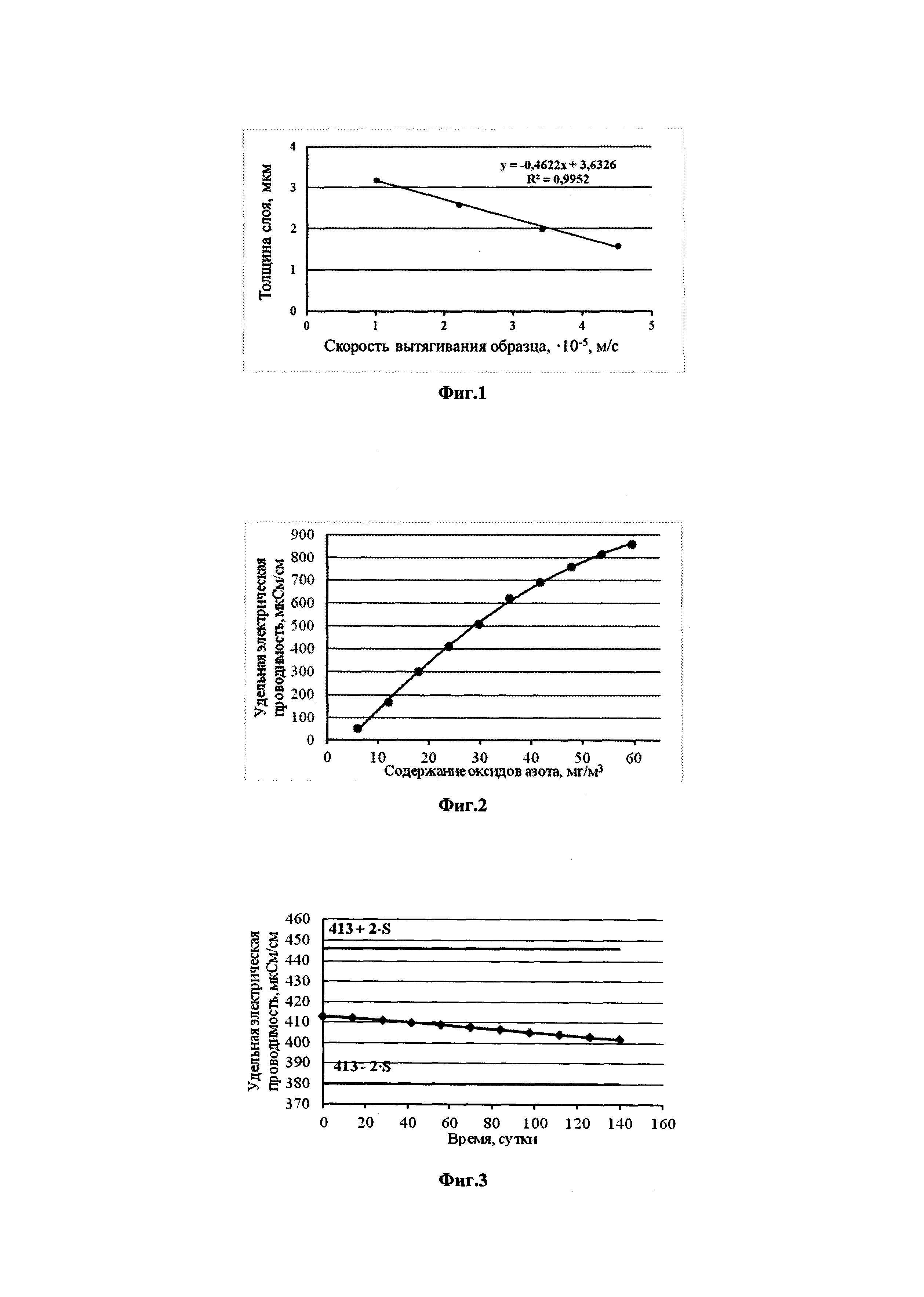 Изобретение относится к газовому анализу, а именно к изготовлению датчиков контроля содержания оксидов азота в воздухе. Способ получения электропроводящей полимерной пленки поли-N,N-диметил-3,4-диметиленпирролиданий цианида (ПДМПЦ) на поверхности диэлектрической подложки с закрепленными контактами включает формирование слоя ПДМПЦ на поверхности диэлектрической подложки вытягиванием подложки в горизонтальном положении из водного раствора взаимодействующих компонентов: полимера, представляющего собой поли-N,N-диметил-3,4-диметиленпирролидиний хлорид (ПДМПХ), и модификатора, представляющего собой нитропруссид натрия (Na[Fe(CN)NO]). Вытягивание осуществляют с постоянной скоростью, варьируемой от 1,0-10до 4,5-10м/с, при соблюдении оптимального массового соотношения модификатор:полимер, равного (1,6±0,1):1. Изобретение приводит к получению электропроводящей пленки субмикронной толщины на поверхности диэлектрической подложки, чувствительной к оксидам азота в воздушной среде и обеспечивающей заданные технические и метрологические характеристики сенсорной гетероструктуры. 3 ил., 3 пр.
